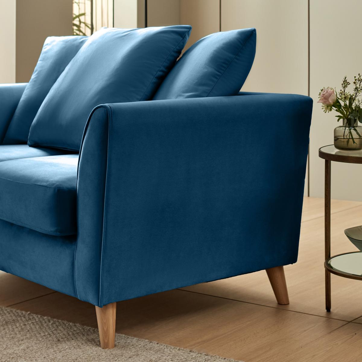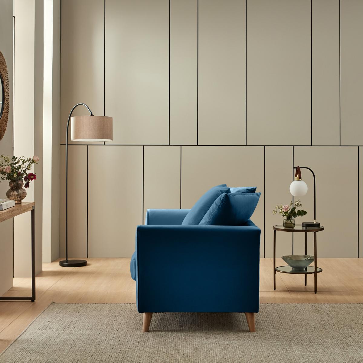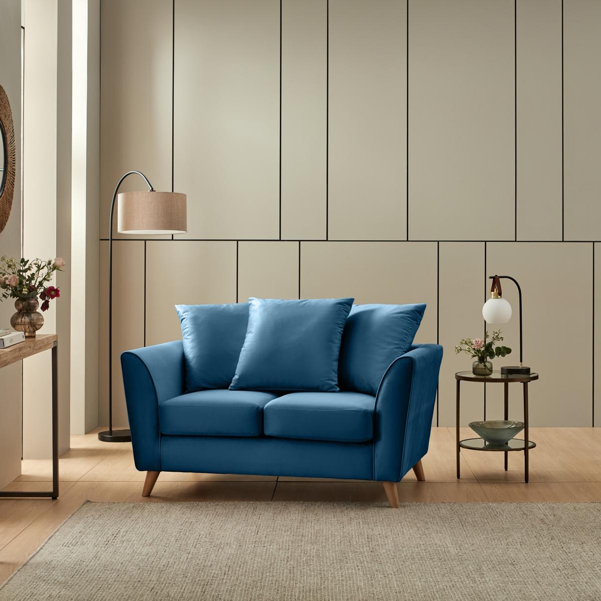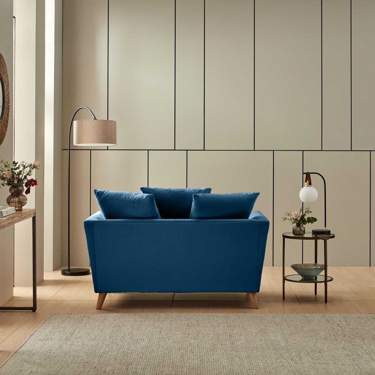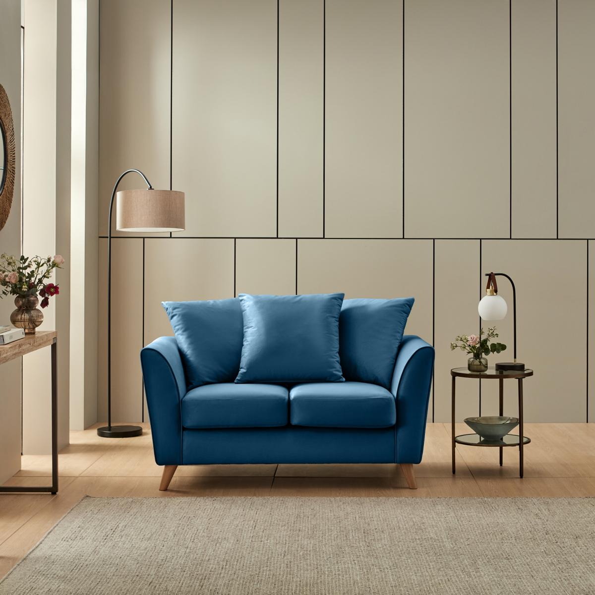 I love this sofa for its rich navy velvet finish, which adds a touch of luxury without feeling too formal. It works particularly well in modern interiors with a neutral or minimalist colour palette, offering a statement piece that still feels inviting. To style it effectively, consider pairing with textured cushions in complementary hues or metallic accents for added depth. Practical tips include balancing it with light-toned accessories and ensuring the surrounding furniture doesn’t overpower its bold colour, allowing the sofa to shine as the focal point of the room. Its cosy scale makes it ideal for both relaxed living spaces and sophisticated lounges.