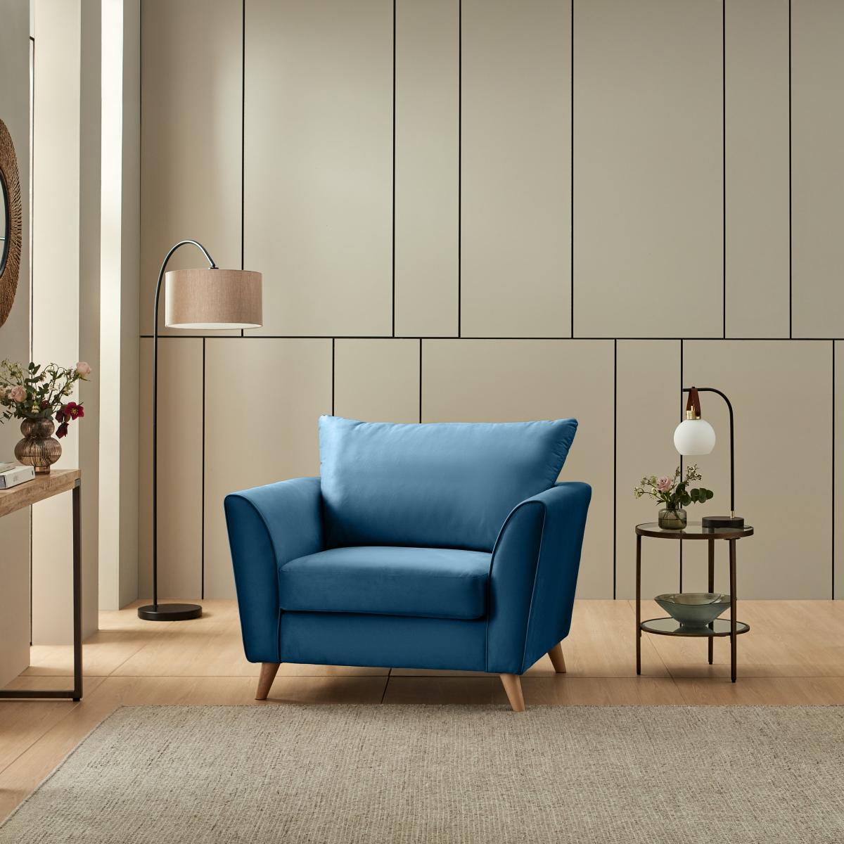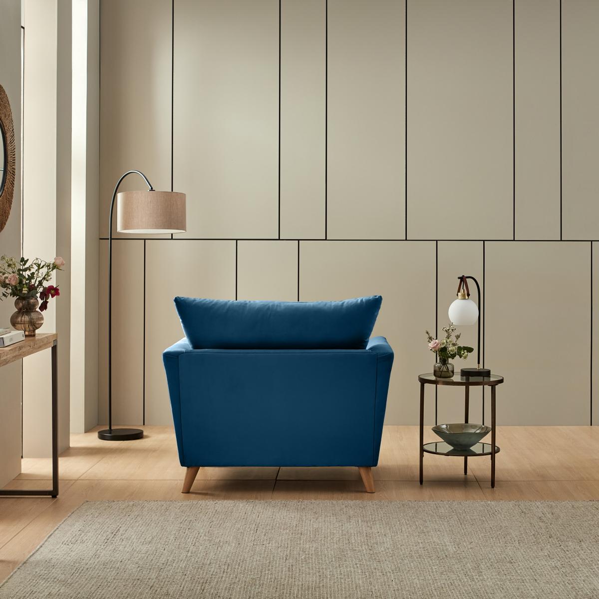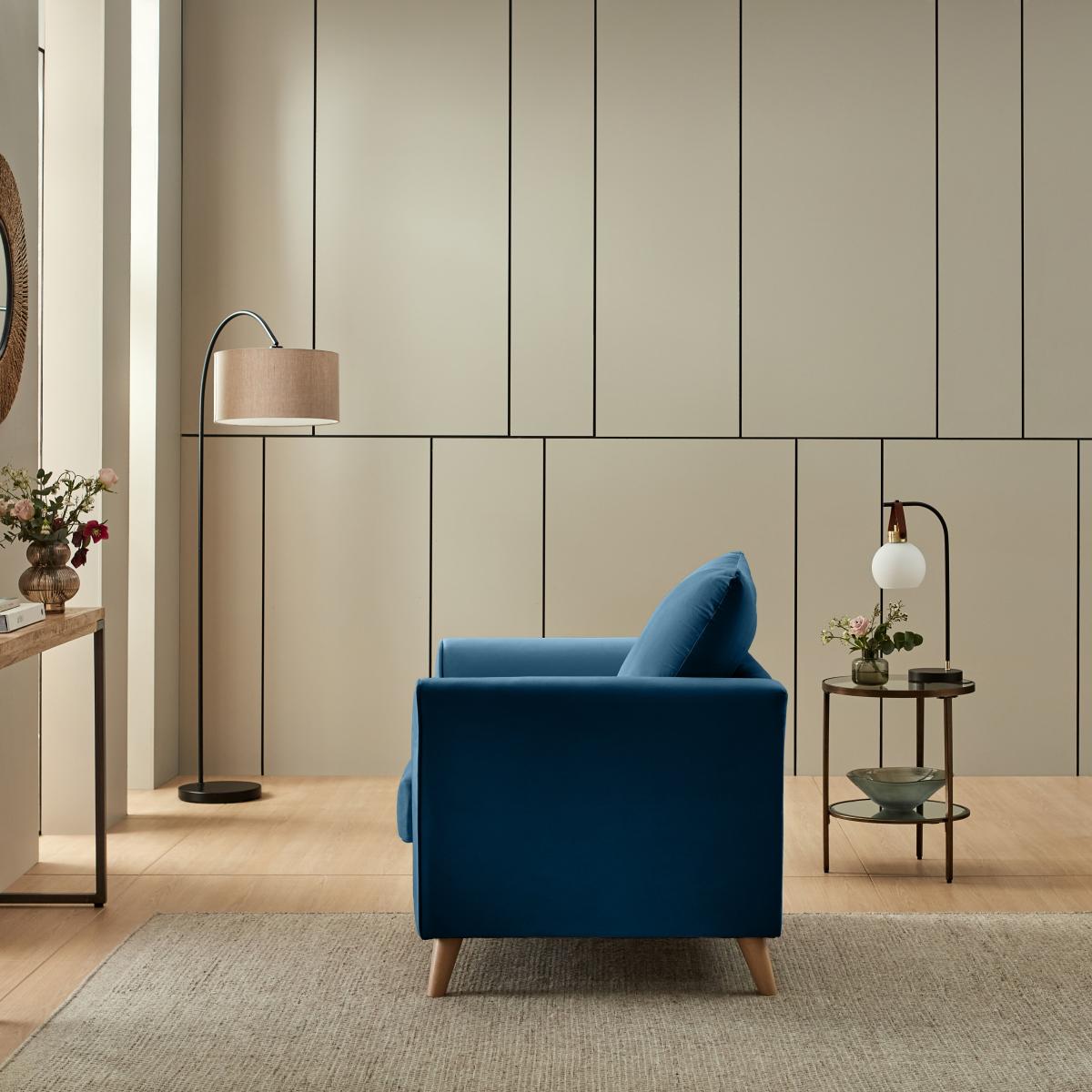 I’m a fan of this navy velvet armchair for its clean lines and rich, tactile finish - it instantly lifts a room without feeling overdone. The deep blue works particularly well in contemporary or mid-century schemes and is equally at home in a neutral, Scandi-inspired space where it acts as a focal point. For styling, tuck it into a cosy reading corner alongside a slender floor lamp and a small side table in brass or black metal. Keep cushions to a minimum - perhaps one in a soft wool or boucle - so the velvet remains the star. It’s a practical choice too: the raised wooden legs make cleaning underneath easier, and the stain-resistant finish holds up well to everyday use.