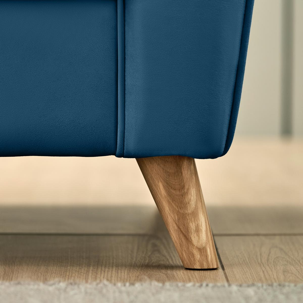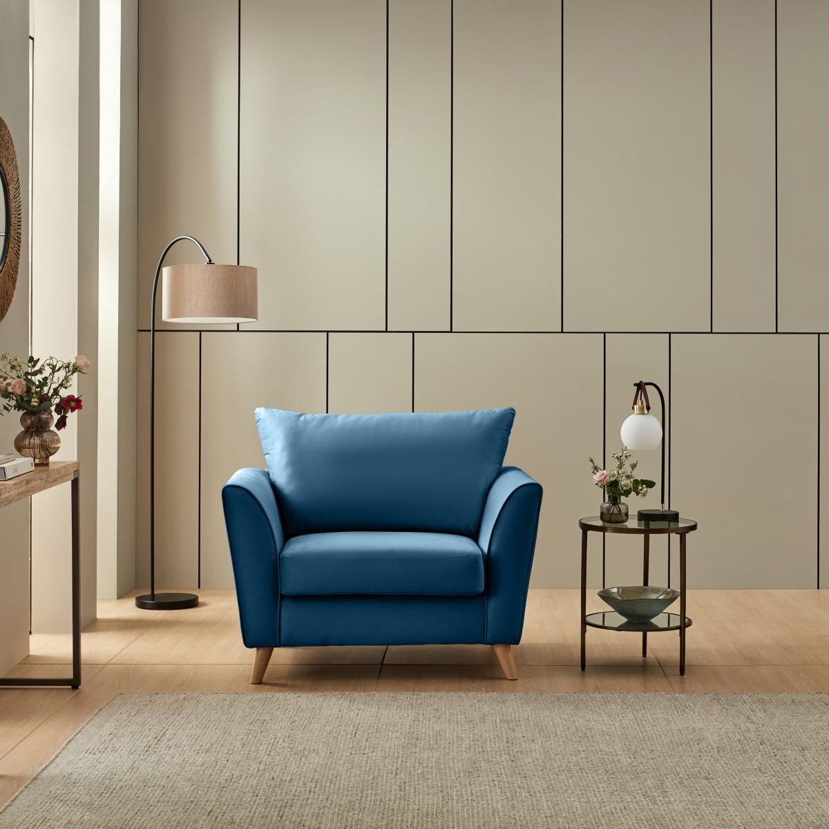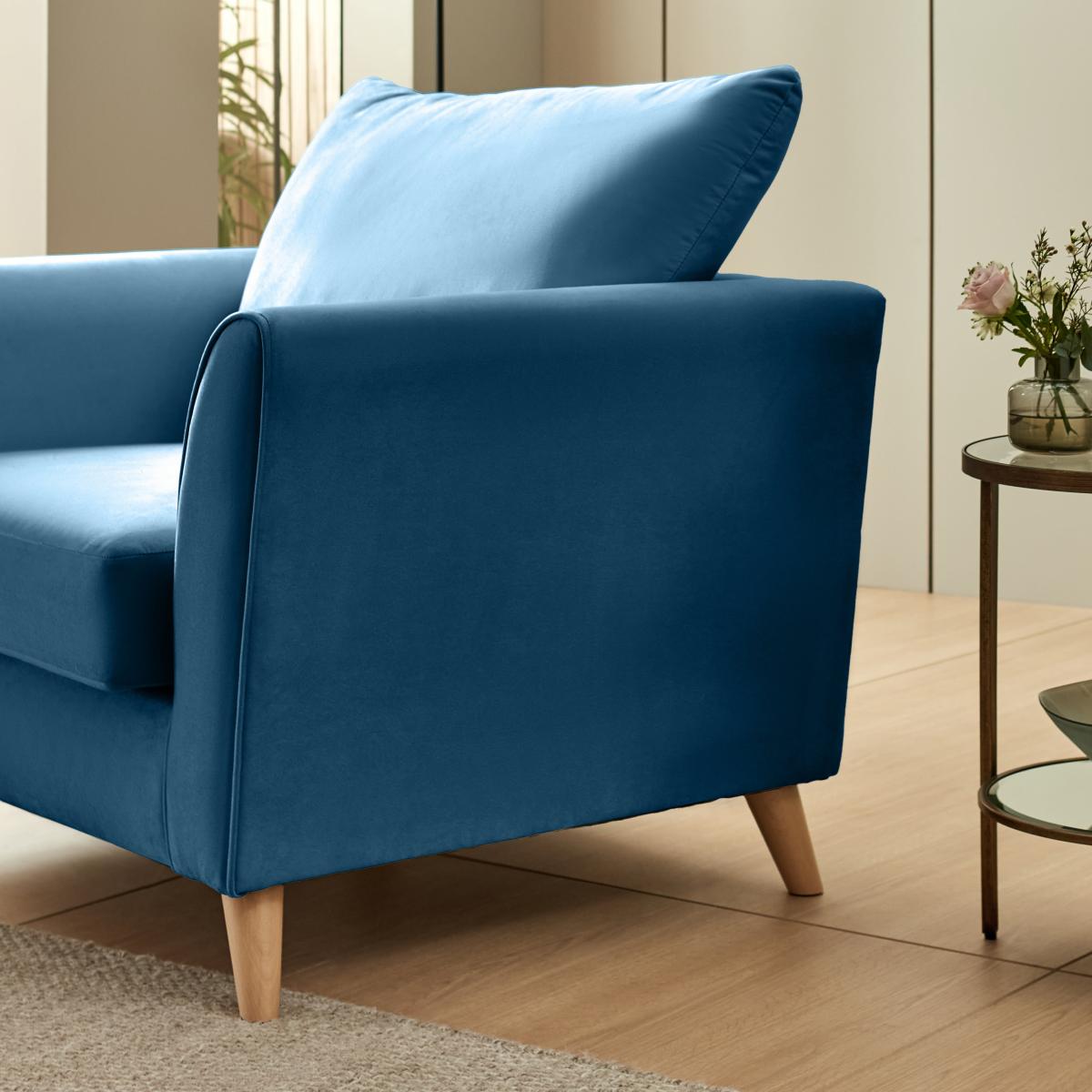 I’m a fan of this navy velvet armchair for its clean lines and rich, tactile finish - it instantly lifts a room without feeling overdone. The deep blue works particularly well in contemporary or mid-century schemes and is equally at home in a neutral, Scandi-inspired space where it acts as a focal point. For styling, tuck it into a cosy reading corner alongside a slender floor lamp and a small side table in brass or black metal. Keep cushions to a minimum - perhaps one in a soft wool or boucle - so the velvet remains the star. It’s a practical choice too: the raised wooden legs make cleaning underneath easier, and the stain-resistant finish holds up well to everyday use.
