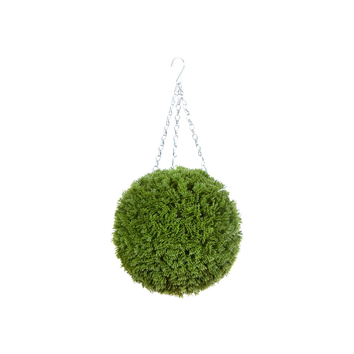 This topiary ball comes with UV protection and can brave the elements. It measures 28cm in diameter and comes with a triple hanging chain made of galvanized metal. The frame is sturdy and covered in dense, realistic leaves. Perfect for outdoor use, this ball requires no maintenance. All sizes are approximate.