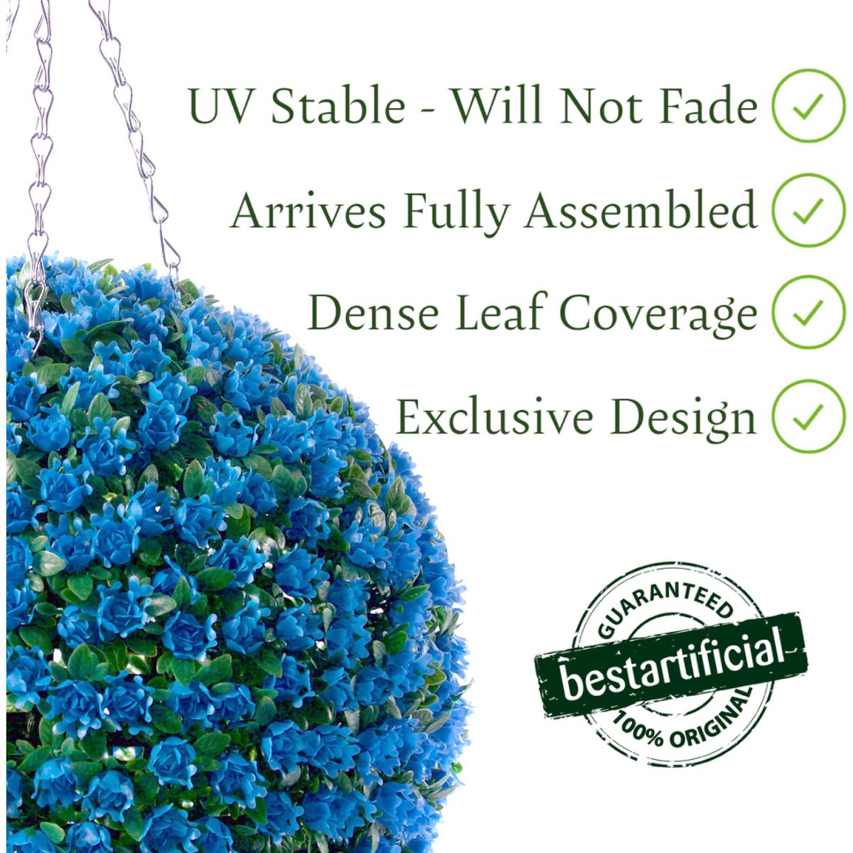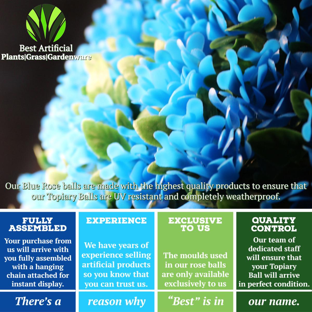 Our Blue Rose ball is part of our extensive range of flower balls which are available in 7 different colours - Red, Yellow, Pink, White, Blue, Orange & Purple and in 4 different flower varieties - Tulip, Lavender, Lily & Rose. Our Blue Rose ball is the perfect way to add a burst of colour to your home or business. They accentuate any building and are maintenance free. They arrive fully assembled with a galvanised hanging chain attached to them so that they are ready for display straight from the box. Our topiary balls are made using only the highest quality materials so that we can ensure that our products are UV Stable and weather resistant, meaning that they will not fade or become brittle - something that our competitors cannot guarantee. The flower mould, the leaf mould and colours used during production are available only to Best Artificial LTD.We have many years of experience and we pride ourselves in the realism of our products. Each Topiary ball is handmade by a member of our dedicated staff who will also ensure that the Topiary Ball is carefully packed before shipping.