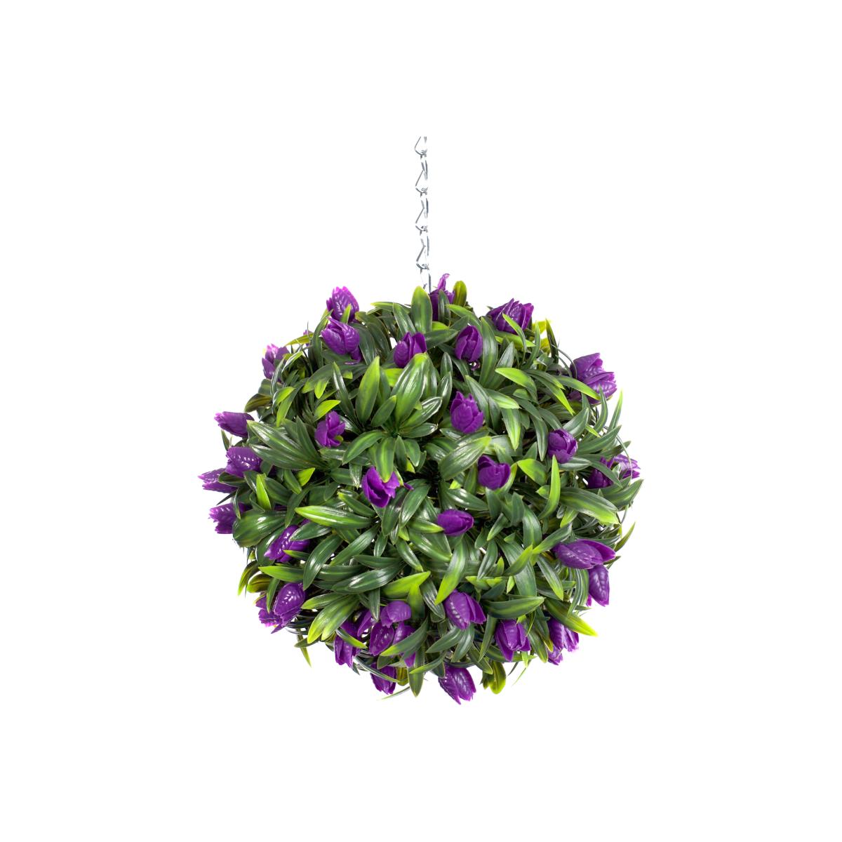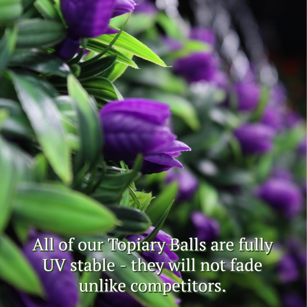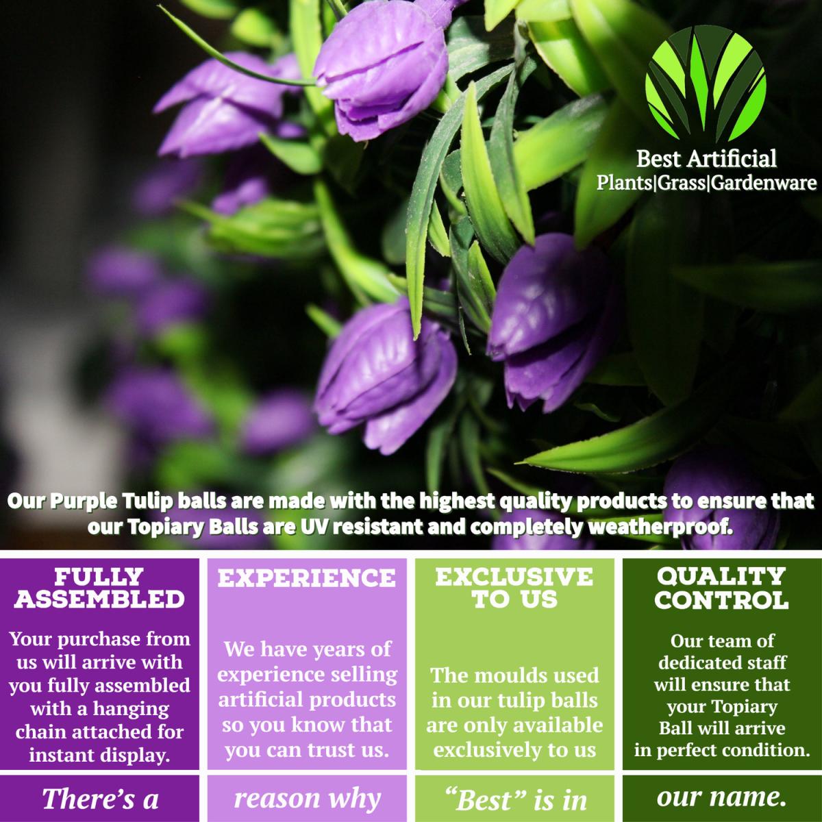 Our Purple Tulip ball is part of our extensive range of flower balls which are available in 7 different colours - Red, Yellow, Pink, White, Blue, Orange & Purple and in 4 different flower varieties - Tulip, Lavender, Lily & Rose. Our Purple Tulip ball is the perfect way to add a burst of colour to your home or business. They accentuate any building and are maintenance free. They arrive fully assembled with a galvanised hanging chain attached to them so that they are ready for display straight from the box. Our topiary balls are made using only the highest quality materials so that we can ensure that our products are UV Stable and weather resistant, meaning that they will not fade or become brittle - something that our competitors cannot guarantee. The flower mould, the leaf mould and colours used during production are available only to Best Artificial LTD. We have many years of experience and we pride ourselves in the realism of our products. Each Topiary ball is handmade by a member of our dedicated staff who will also ensure that the Topiary Ball is carefully packed before shipping.