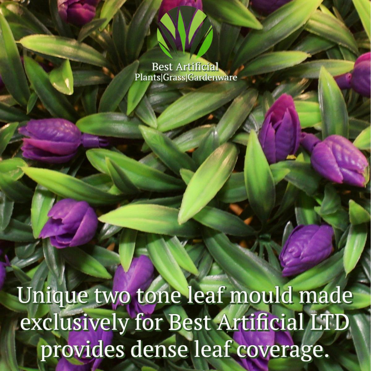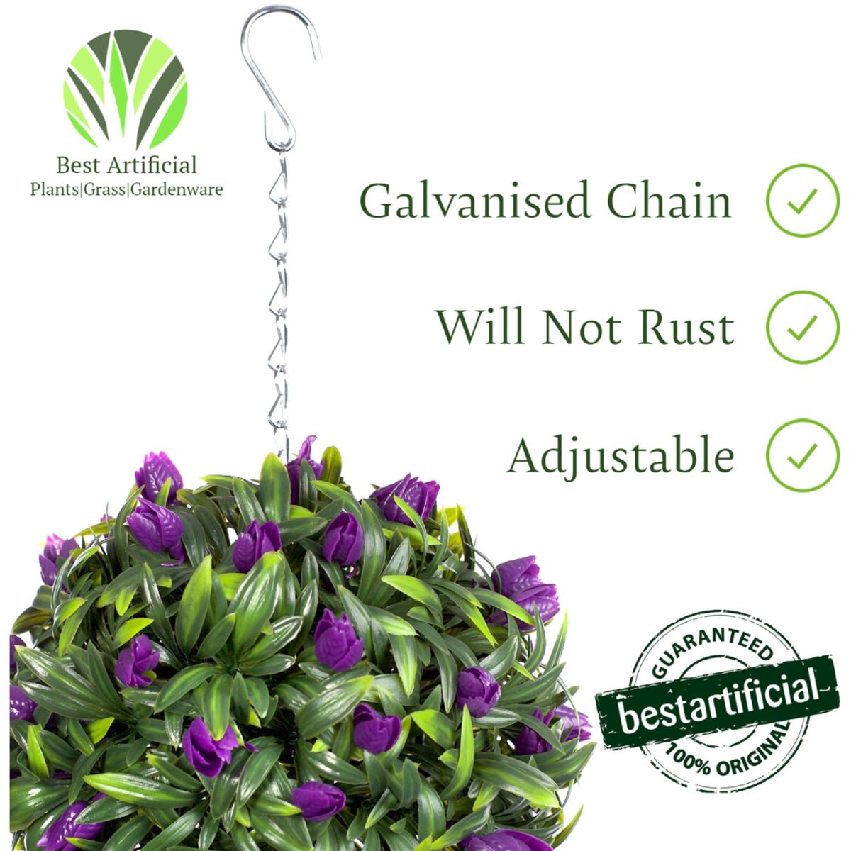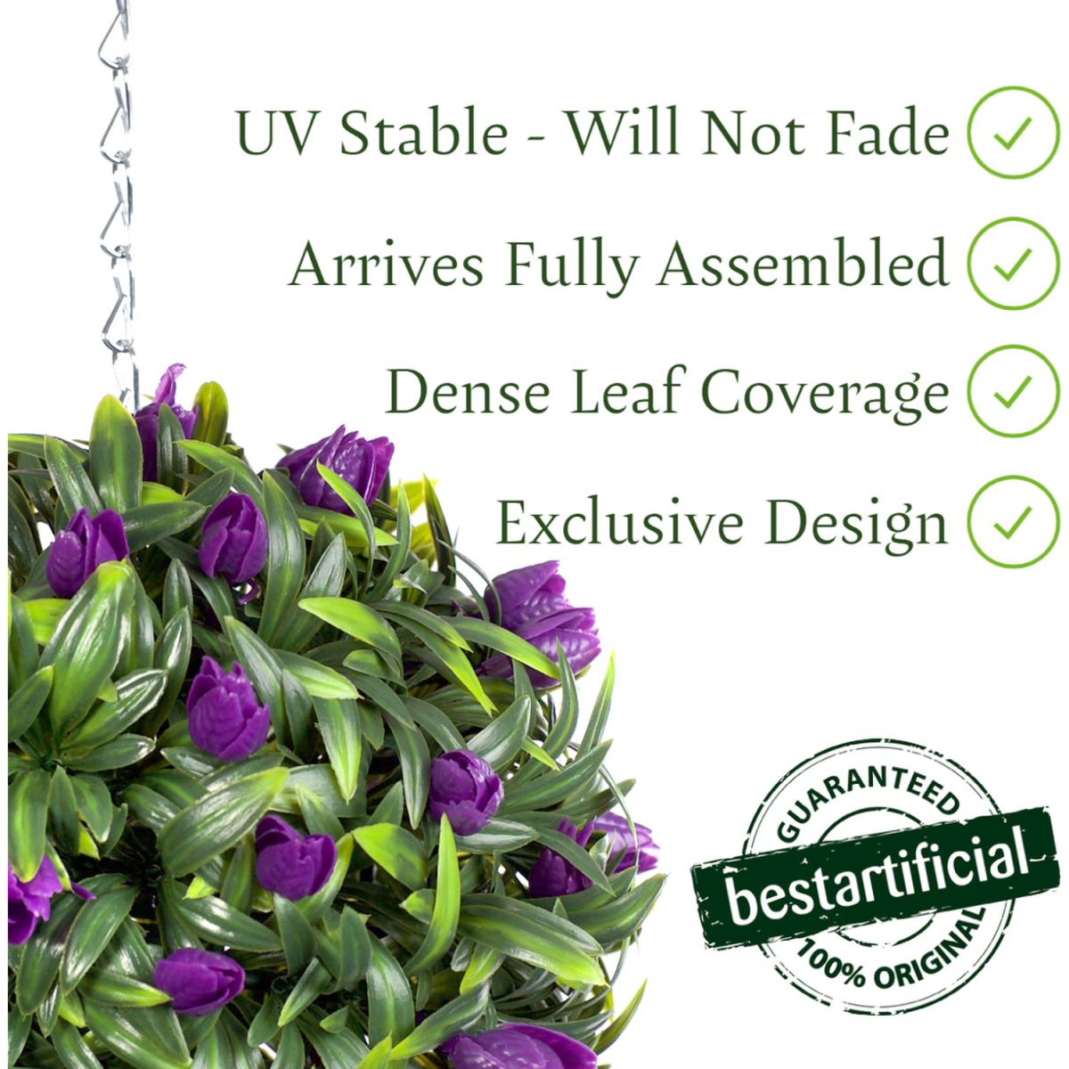 Our Purple Tulip ball is part of our extensive range of flower balls which are available in 7 different colours - Red, Yellow, Pink, White, Blue, Orange & Purple and in 4 different flower varieties - Tulip, Lavender, Lily & Rose. Our Purple Tulip ball is the perfect way to add a burst of colour to your home or business. They accentuate any building and are maintenance free. They arrive fully assembled with a galvanised hanging chain attached to them so that they are ready for display straight from the box. Our topiary balls are made using only the highest quality materials so that we can ensure that our products are UV Stable and weather resistant, meaning that they will not fade or become brittle - something that our competitors cannot guarantee. The flower mould, the leaf mould and colours used during production are available only to Best Artificial LTD. We have many years of experience and we pride ourselves in the realism of our products. Each Topiary ball is handmade by a member of our dedicated staff who will also ensure that the Topiary Ball is carefully packed before shipping.