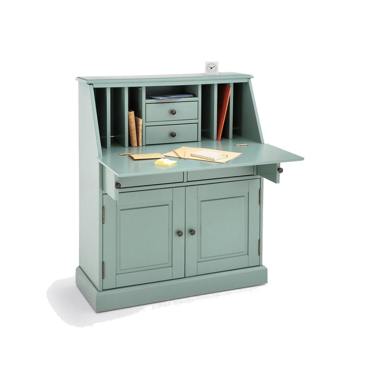 Scriban secretary desk in solid pine with folding top. Product Details • Solid pine with light oak finish and nitrocellulose varnish lacquer • Metal handle • 2 centre drawers • 3 side compartments under the hinged desk top • 2 large drawers • 2 doors with adjustable interior shelvesDimensions. Total • Width 93cm • Height 111cm • Depth 40cm. Usable dimensions • 2 large drawers under the desk top : L34 x H11 x D32.5cm • 2 doors with adjustable interior shelf :L42 x H46.5 x D38cm • Assembly required. • WOOD FROM SUSTAINABLY MANAGED FORESTS. FSC® certified wood comes from forests that are environmentally, socially and economically well managed. Dimensions and weight of parcel2 parcels • W120 x H17 x D45 cm, 25.5 kg • W105 x H16 x D49 cm, 22.5 kg