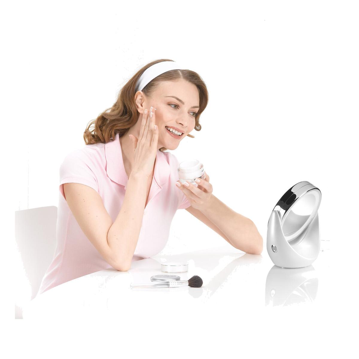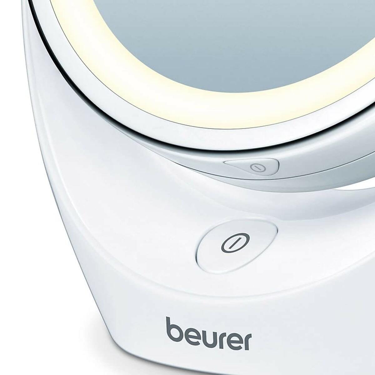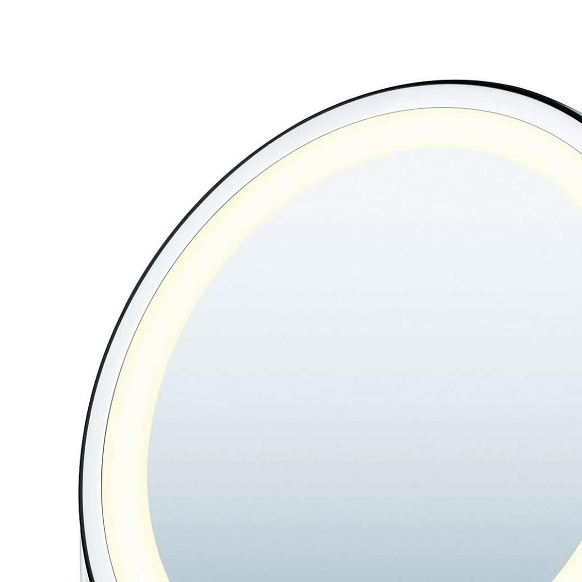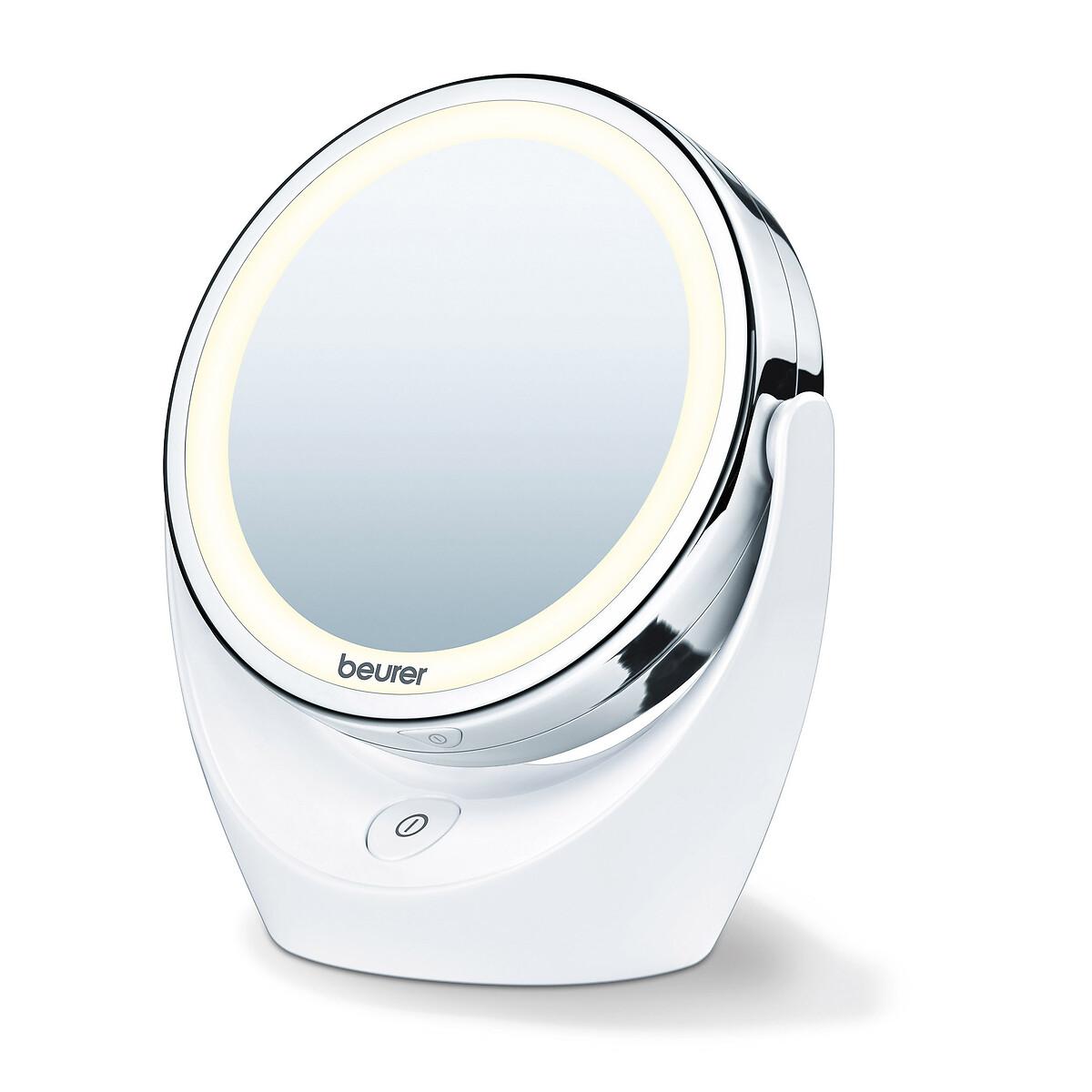 Beurer BS 49 double-sided illuminated magnifying mirror. Product Details • Compact illuminated standing mirror with 5x zoom • For makeup or beauty, Beurer has designed the BS 49 light-up mirror that is adjustable and which magnifies up to 5 times! This is the essential mirror for your bathroom! • A very practical mirror! • Adjustable, it is very practical. • Mirror manually tilts to fit face. Magnifying up to 5 times, it is very practical for waxing the face or visualizing even better each and every pore. It can also be used in normal mirror, without magnifying effect. • With a diameter of about 11 cm, the mirror allows you to have a full overview of the face, ideal for putting on makeup. • Illuminated with clear LED lights, it is very practical when the beauty corner does not have sufficient lighting. To activate the lights, the mirror has a button located on the side, within easy reach. • A design and elegant mirror • With its high quality chrome finishes, the BS 49 mirror is both design, elegant and very discreet. • Lightweight, it weighs only 450 grams to be able to move it easily. • Ideal on a dressing table or in the bathroom to put on makeup at any time! • Operating with 3 included 1.5V AA batteries, the mirror consumes little power and can also be used as a simple mirror, without having to turn it on. Its dimensions of 17.5 x 19 x 10 cm make it compact and thanks to its thick base it offers perfect support on any support, in glass, wood or any other material. • Matte white design • Bright 12-LED light • Quality chrome • 2 pivoting reflective surfaces: normal/5x magnification • Operation with batteries. Dimensions • Diameter of reflective surface: 11cm