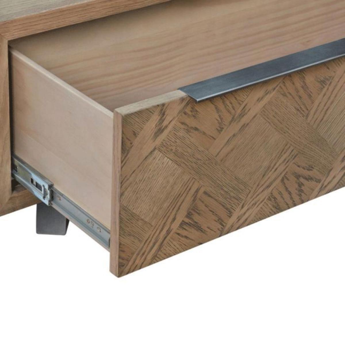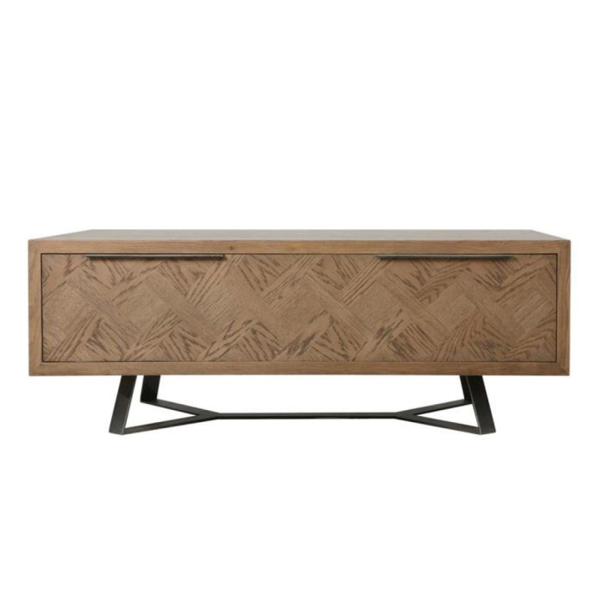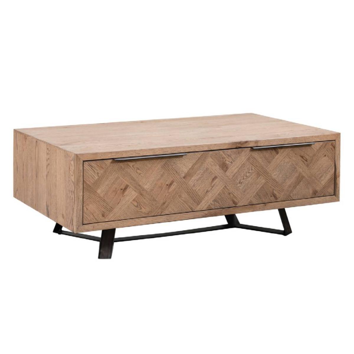 This unique collection displays a basket weave pattern inlay on table tops and cabinet fronts, featuring aged grey oak and oak veneers and finished with a discrete top mounted grip handle in light gun metal grey. The angular legs, also finished in light gun metal grey, bring the traditional and modern together for the best of both worlds. Featuring metal drawer runners on the handy storage drawer, this coffee table is great. The storage drawer is the perfect place to store remotes, books, magazines and other items out of site, keeping your living room neat and clutter free. Dimensions: W120cm x D70cm x H45cm. Smooth Oak Parquet finish. Angular metal legs with rubber feet for floor protection. Partial assembly required. All screens vary in colour reproduction and whilst every effort has been made to display the colour as accurately as possible it is for guidance only.