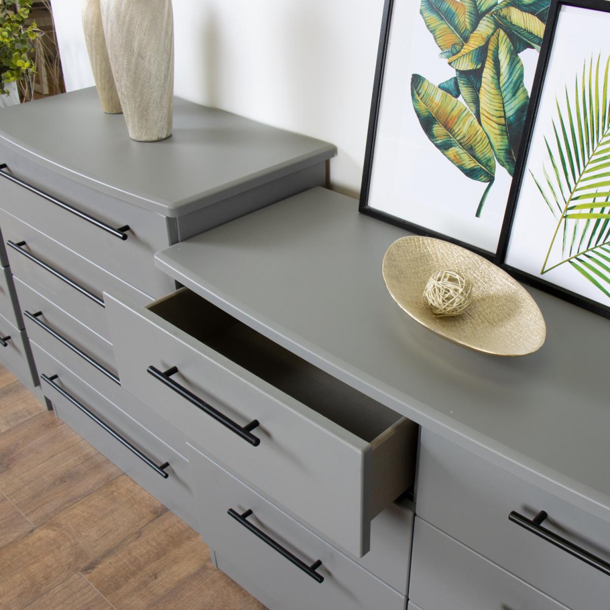 This tall double door wardrobe is perfect for any bedroom. Features the added practicality of 2 full width drawers. This range is modern and elegant with a smooth clean design. Features sleek black T-Bar handles and comes ina range of scratch resistant colours. All our furniture is made in the United Kingdom, to the highest quality. It is delivered direct to your location of choice by one of our two man delivery teams, and come full assembled (although legs may be removed to prevent damage in transit).