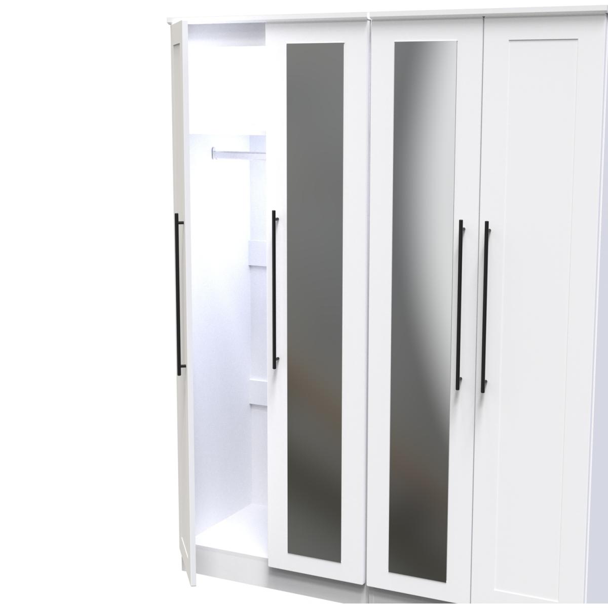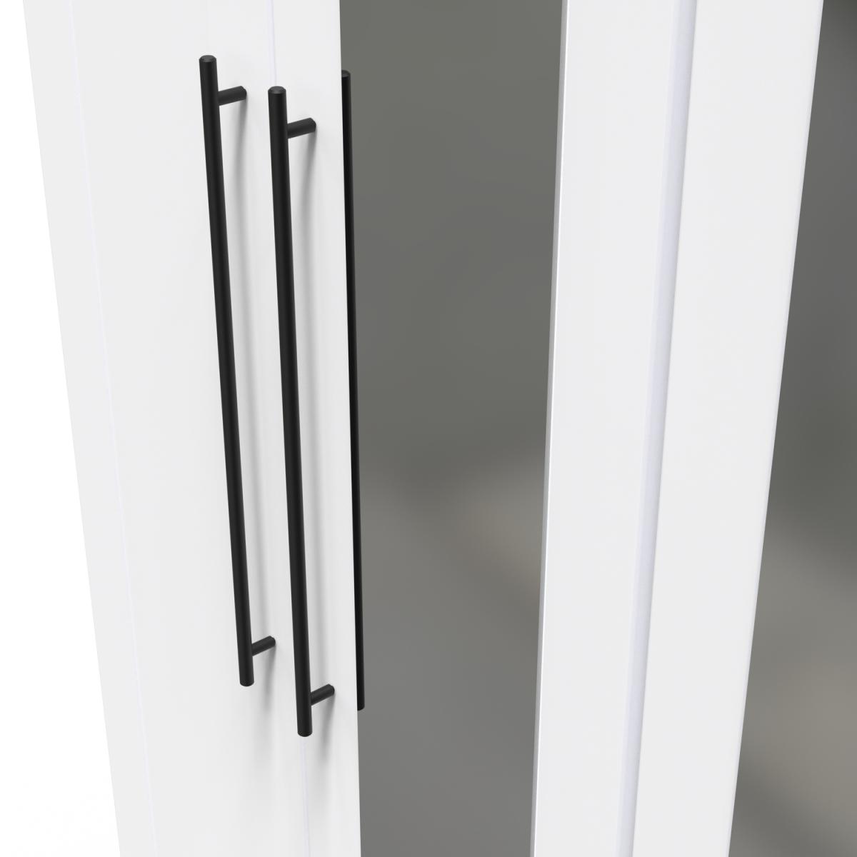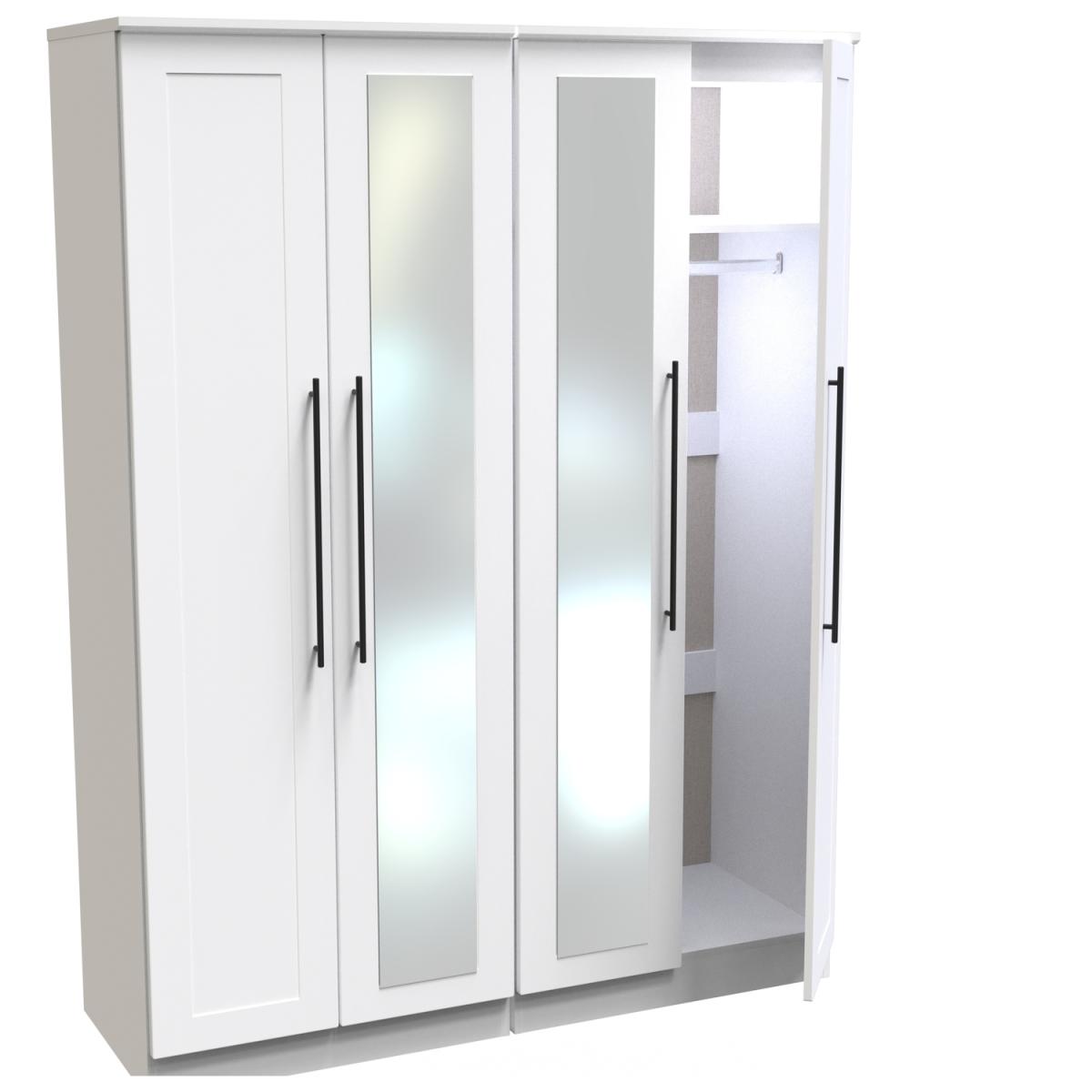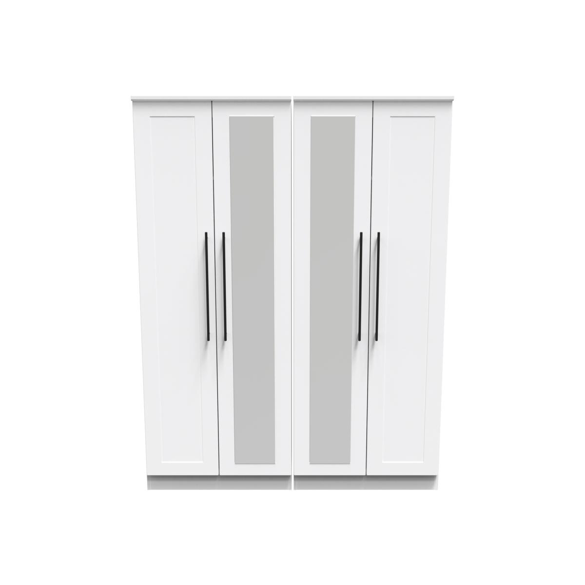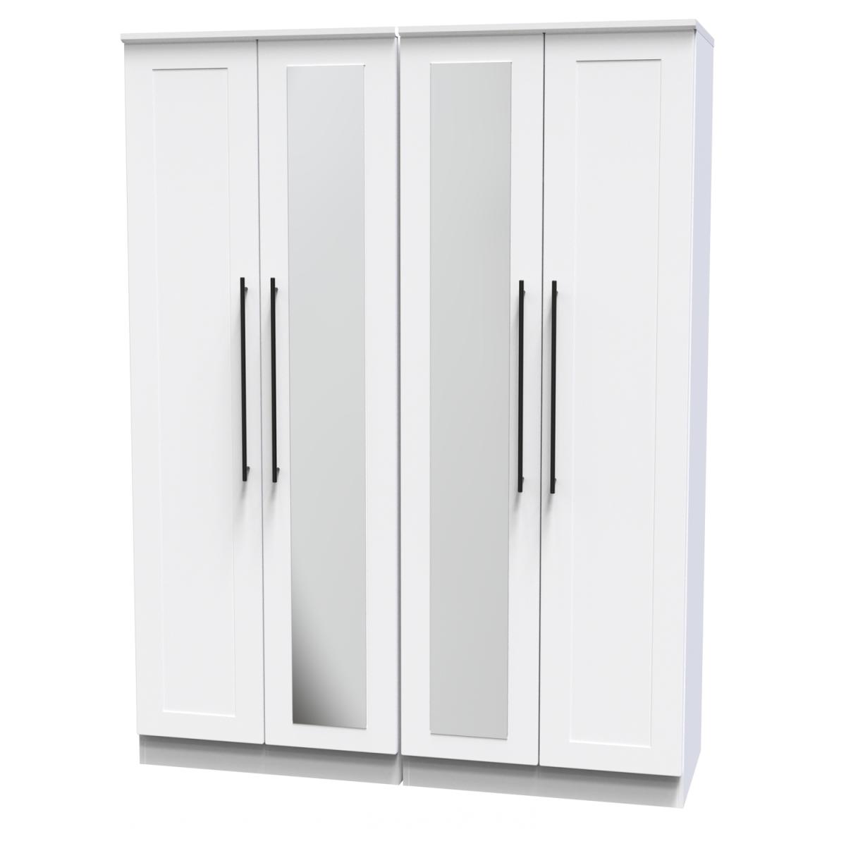 This tall 4 door wardrobe provides an increased storage solution for your clothes. Also features 2 full height central mirrored doors. This range is modern and elegant with a smooth clean design. Features sleek black T-Bar handles and comes ina range of scratch resistant colours. All our furniture is made in the United Kingdom, to the highest quality. It is delivered direct to your location of choice by one of our two man delivery teams, and come full assembled (although legs may be removed to prevent damage in transit).