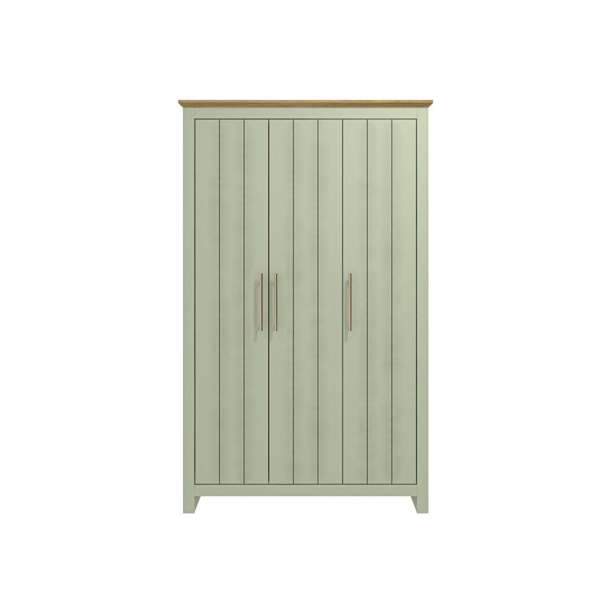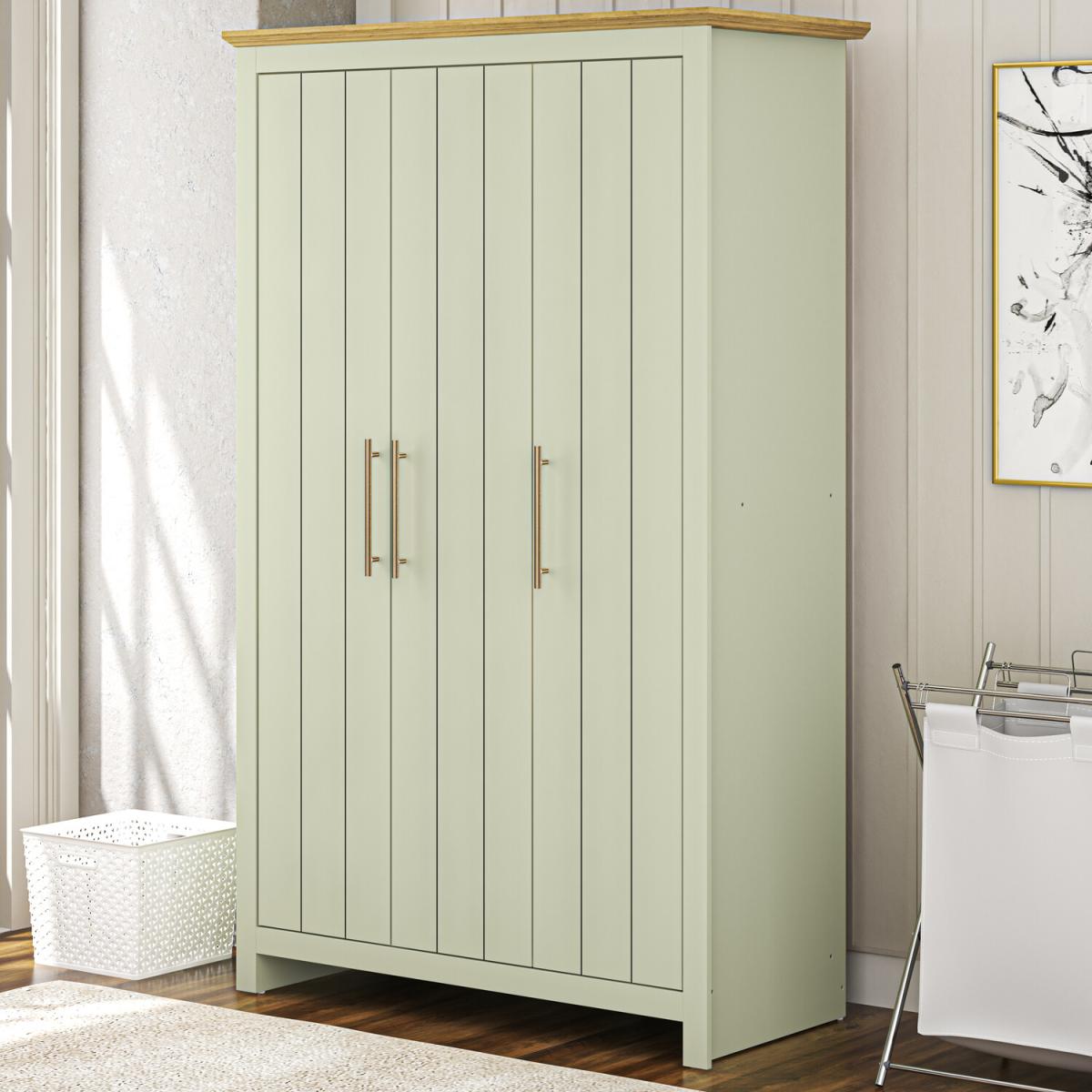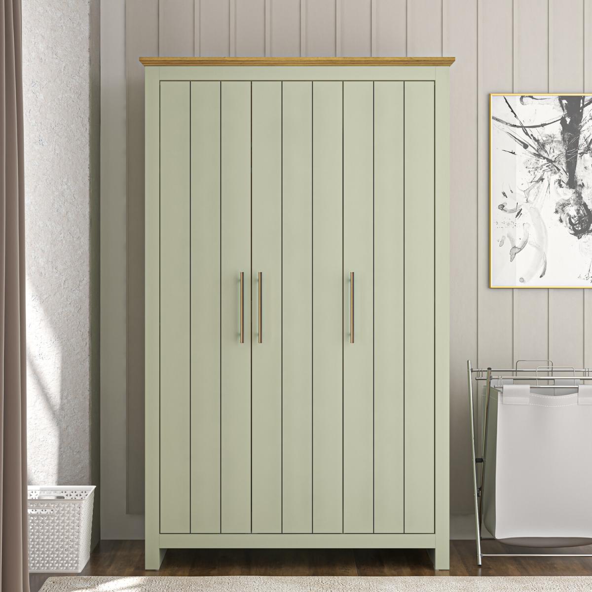 A beautiful addition to your bedroom, this Bexley 3-Door Wardrobe features a stylish and modern sage green finish with copper handles to give your bedroom a contemporary look. A sturdy oak-effect finish on top finishes this piece off to create an expensive-looking item for a fraction of the price. Inside the wardrobe, you'll find three hanging rails and two shelves, giving you plenty of space for your clothes and accessories.