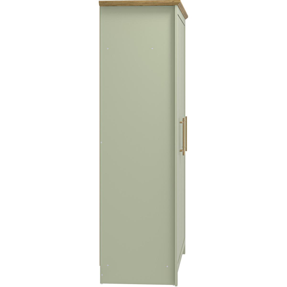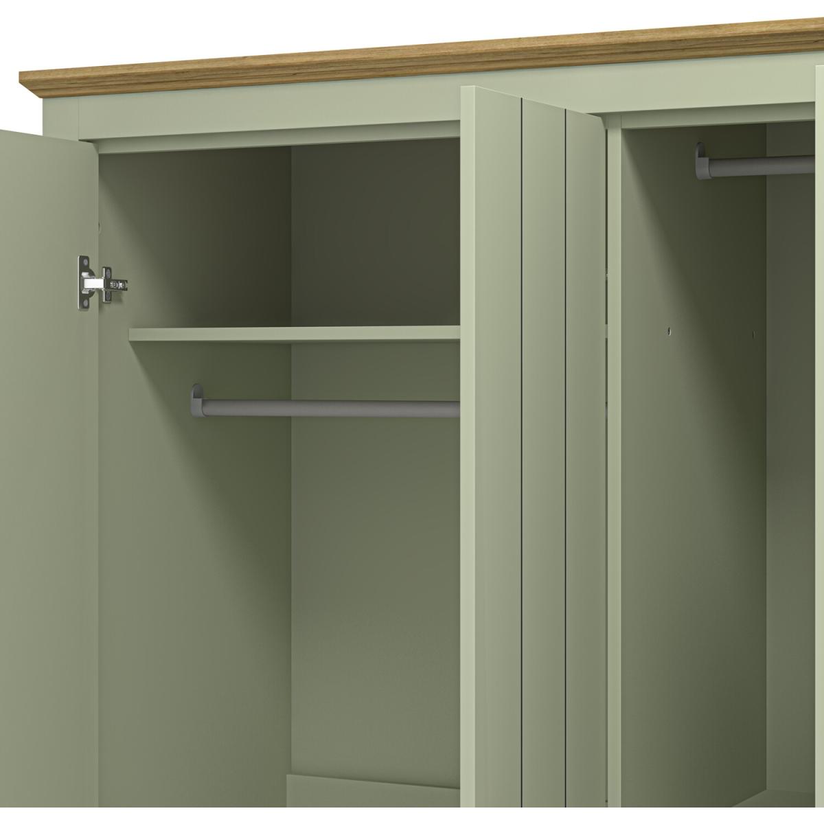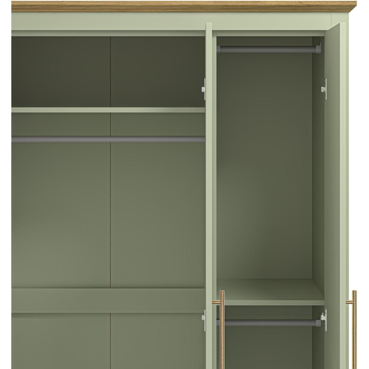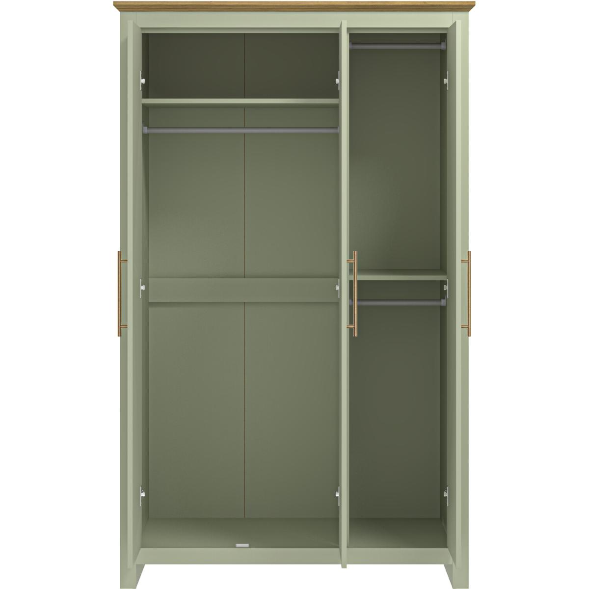 A beautiful addition to your bedroom, this Bexley 3-Door Wardrobe features a stylish and modern sage green finish with copper handles to give your bedroom a contemporary look. A sturdy oak-effect finish on top finishes this piece off to create an expensive-looking item for a fraction of the price. Inside the wardrobe, you'll find three hanging rails and two shelves, giving you plenty of space for your clothes and accessories.