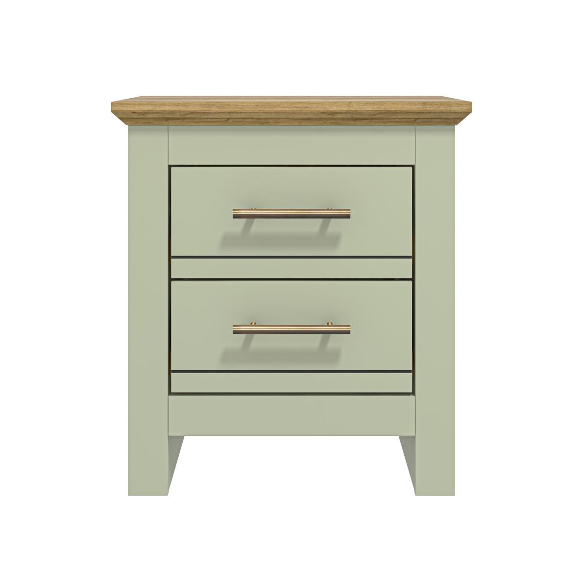 A beautiful addition to your bedroom, this Bexley Bedside Table features a stylish and modern sage green finish with copper handles for a beautiful contemporary feel. A sturdy oak-effect finish on top completes this piece to create an expensive-looking item for a fraction of the price. The bedside table has plenty of storage space within the two drawers for all your nighttime essentials.
