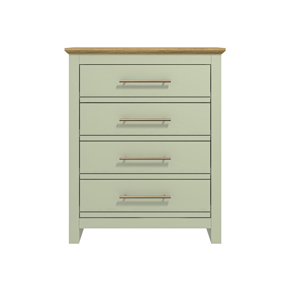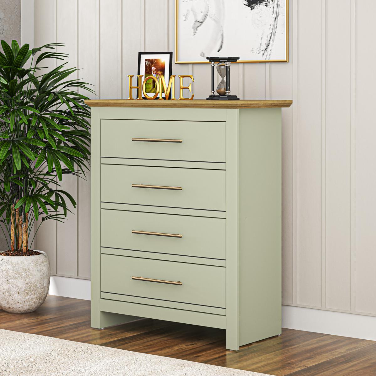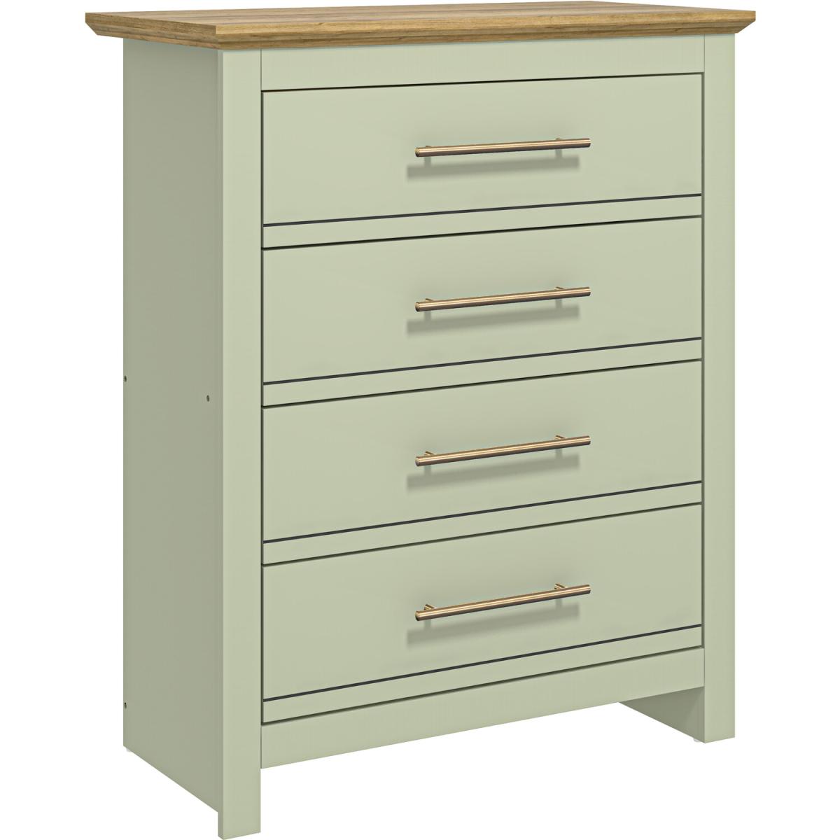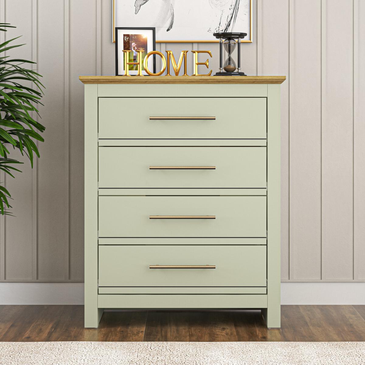 A beautiful addition to your bedroom, this Bexley Chest features a stylish and modern sage green finish with copper handles to give your space a contemporary look. A sturdy oak-effect finish on top completes this piece to create an expensive-looking item for a fraction of the price. The chest has four spacious drawers on sliding runners, giving you space for clothes, accessories, pyjamas, and more.
