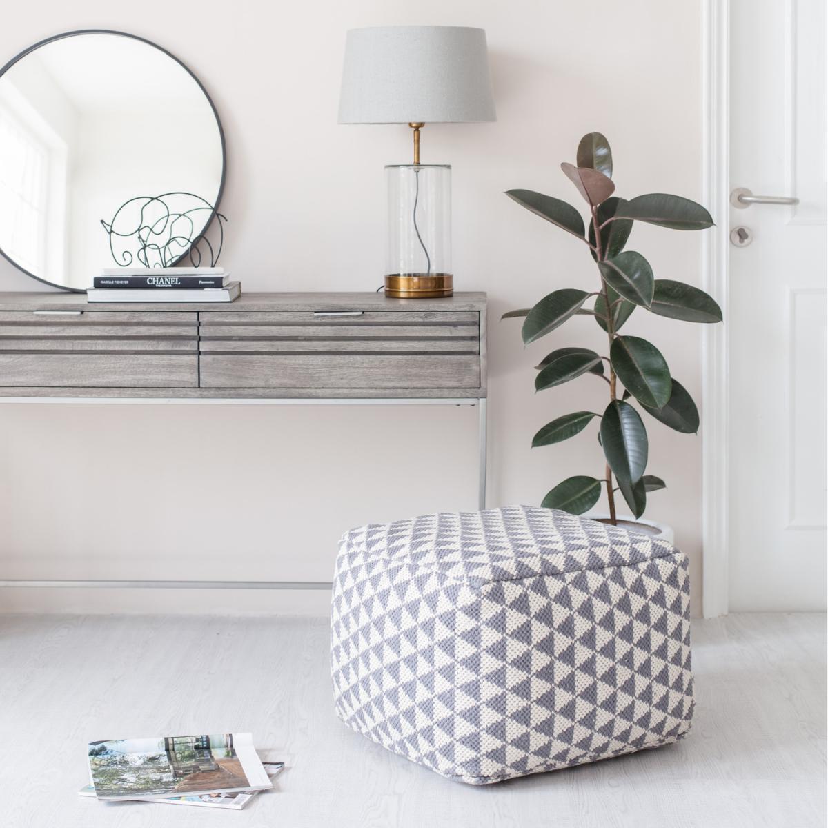 The Beziers triangles pouffe in grey and ivory is a versatile addition to many interiors due to its neutral tones and subtle geometric pattern. I love how it can serve as a practical footrest or extra seating in both contemporary and more eclectic spaces. Its muted colours make it easy to incorporate into a colour scheme, whether you’re going for a minimalist look or a layered, textured setting. For styling tips, try pairing it with soft textiles such as a textured throw or velvet cushions to add depth. It also works well as a statement piece in a living room corner when placed alongside statement seating or even as a standalone accent in a bedroom or hallway. Its compact size means it’s easy to move around, making it a functional and stylish choice for both everyday use and occasional entertaining.