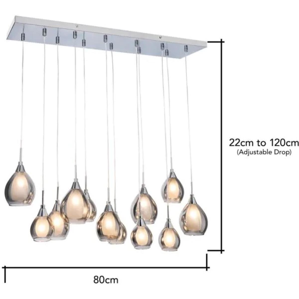 The BHS Carmella Diner 12 Light Ceiling Pendant is a showstopping piece that brings a modern, elegant flair to any room. Perfect for hanging over a dining table, kitchen island, or breakfast bar, this striking fixture features smoked glass shades in varying sizes for added visual interest. With adjustable heights, you can customize the drop to create the ideal ambiance and focal point in your space. 12 lights requiring G9 bulbs (not included) Max wattage  3 Watt (LED Only) Compatible with LED  Assembly required Dimensions Length 80cm Width 20cm Adjustable height from 22cm - 120cm Weight 4.6kg Glass Notice: To ensure safe transit glass shades may be packed separately and require dressing before installation.