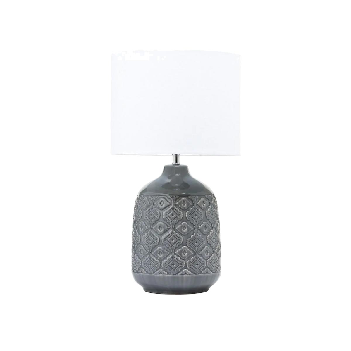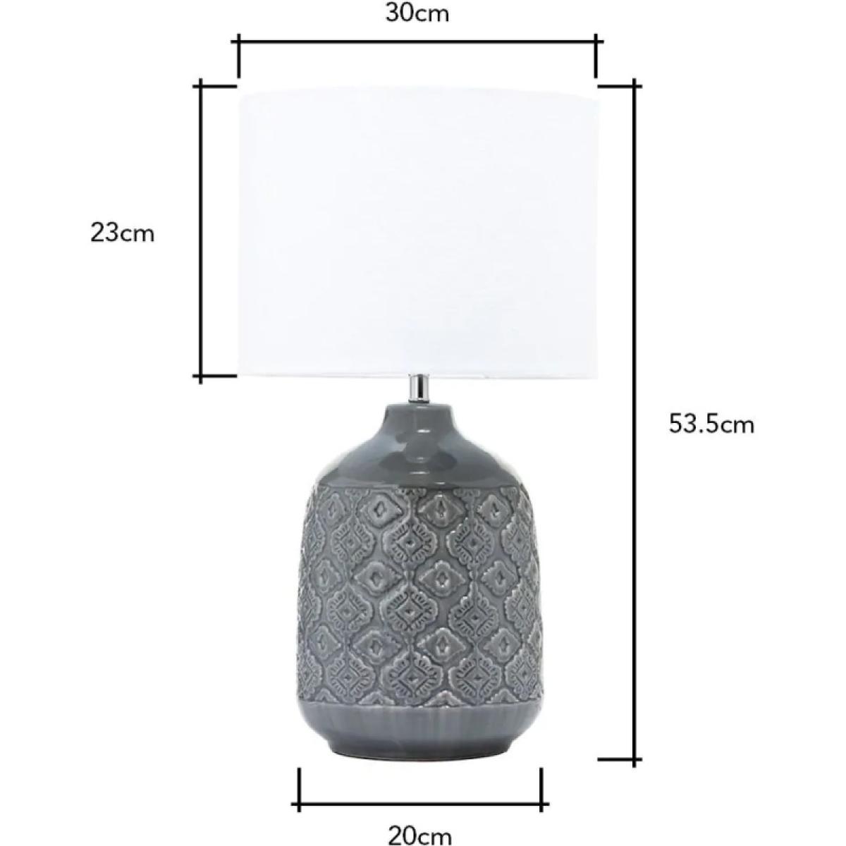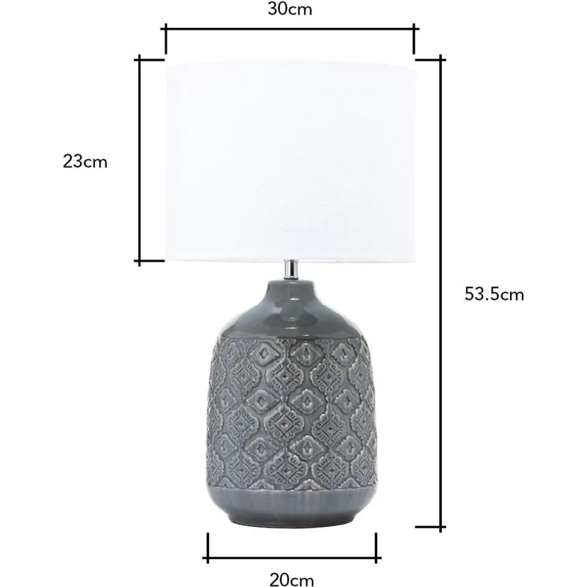 Enhance your home with the BHS Cosgrove Patterned Ceramic Table Lamp in Dark Grey, a sophisticated lighting option that brings style and texture to any space. This table lamp features a beautifully crafted ceramic base with a subtle, geometric pattern, adding depth and visual interest. The rich dark grey finish is both timeless and versatile, making it easy to blend with a variety of interior styles, from modern to classic. The Cosgrove lamp comes with a matching fabric shade that softly diffuses light, creating a warm and inviting ambience perfect for living rooms, bedrooms, or hallways. Its tasteful design and rich colour make it a standout piece that combines functionality with aesthetic appeal. Number of lights: 1 Bulb type: 1 x E27 Edison Screw bulb required (not included) Max Wattage: 42 W Compatible with LED Some assembly is required Dimensions: Height: 53.5cm Base Diameter: 19cm Shade Height: 23cm Shade Diameter: 30cm All screens vary in colour reproduction and whilst every effort has been made to display the colour as accurately as possible it is for guidance only.