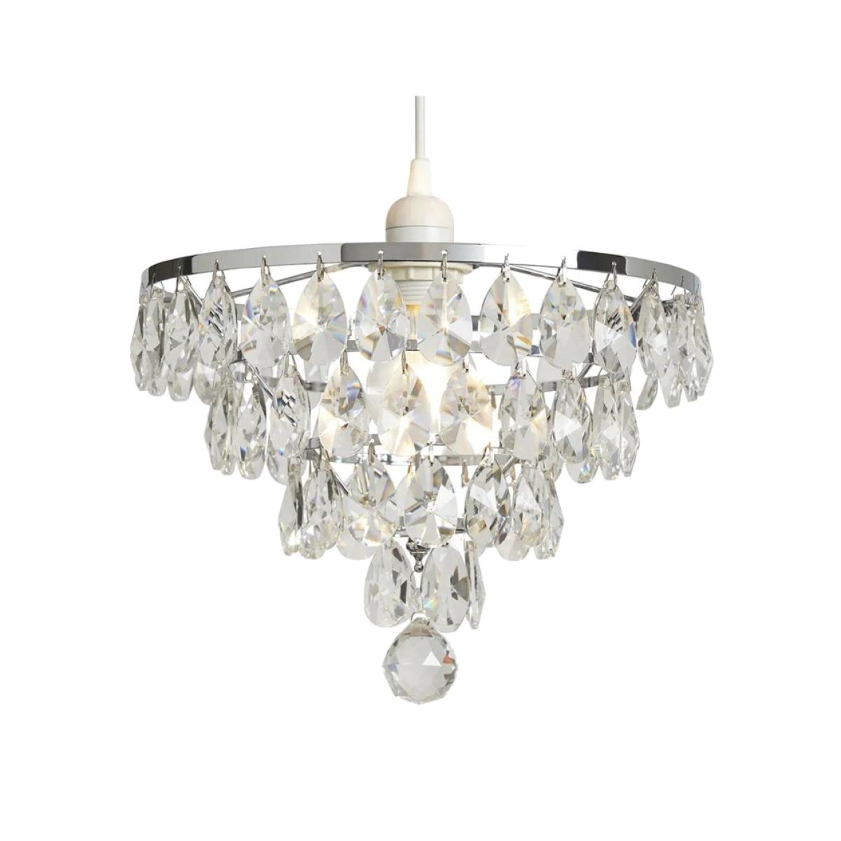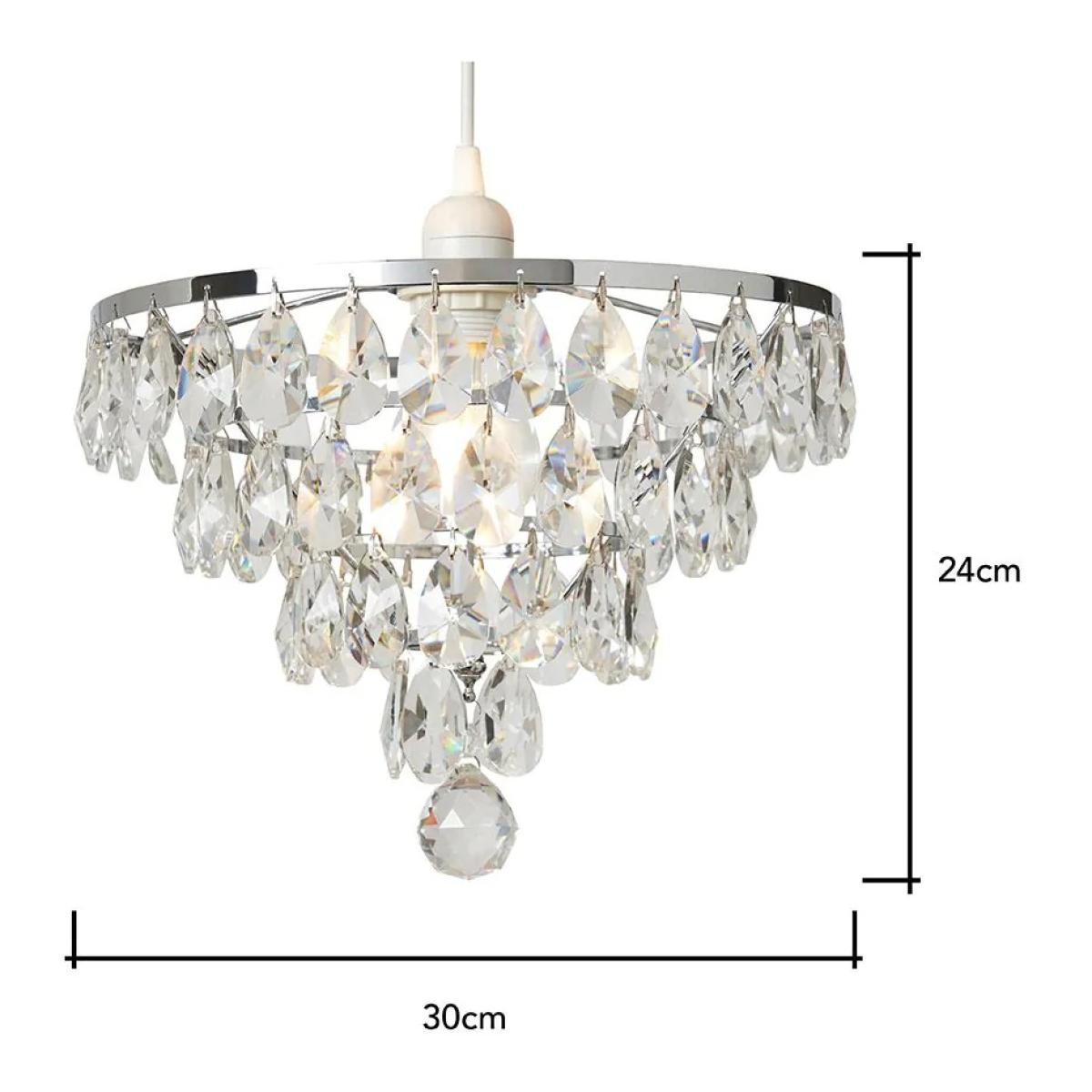 The BHS Elsa Easyfit Light Shade in Chrome brings sleek, modern elegance to your lighting with its polished chrome finish and shimmering crystal-effect droplets. Measuring 30cm in diameter, this shade effortlessly slips over your existing pendant fitting for a quick, tool-free update. It creates a beautiful ambient glow that enhances any room, from bedrooms to living areas, adding a subtle touch of glamour without the need for rewiring or complicated installation. Shade Material: Glass Compatible with LED Colour: Chrome Cap Type: Fits over Existing Fixture Some Assembly Required Dimensions: Height: 24cm Diameter: 30cm Weight: 1.7kg All screens vary in colour reproduction and whilst every effort has been made to display the colour as accurately as possible it is for guidance only.