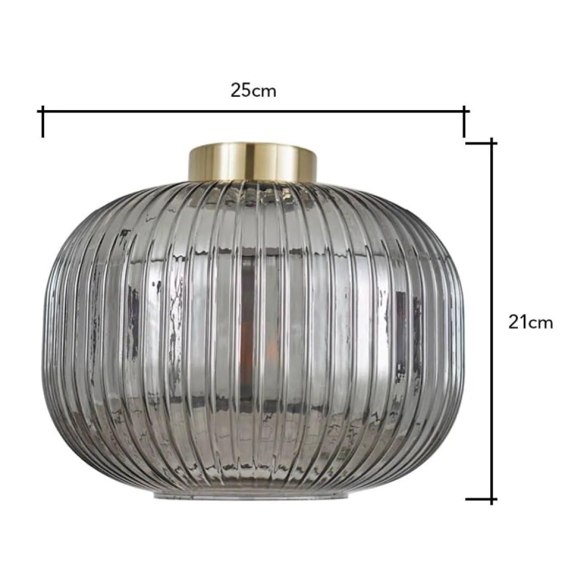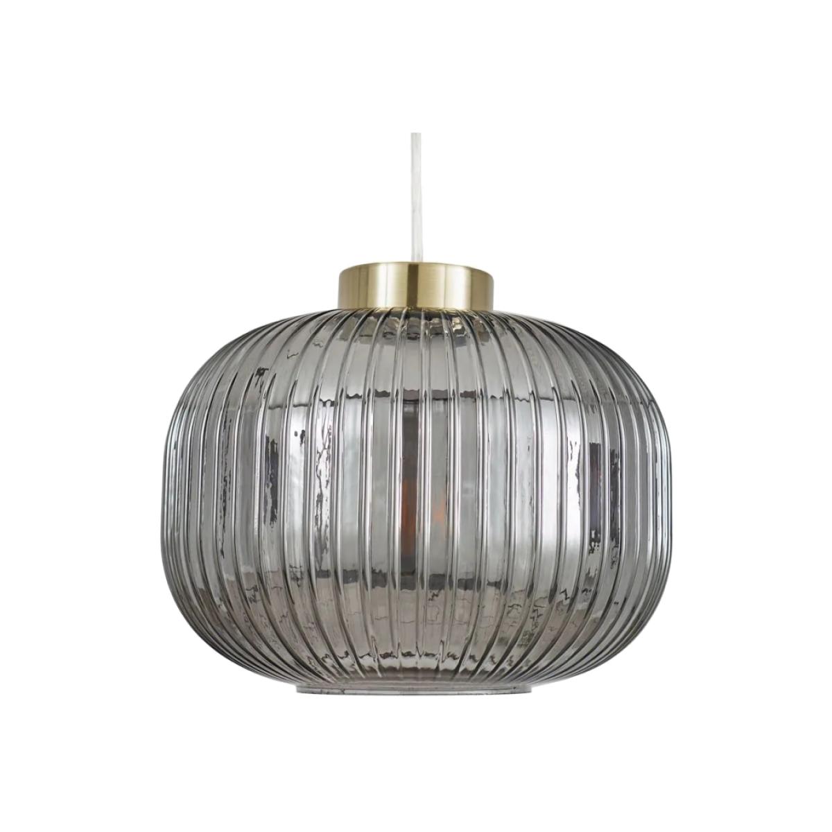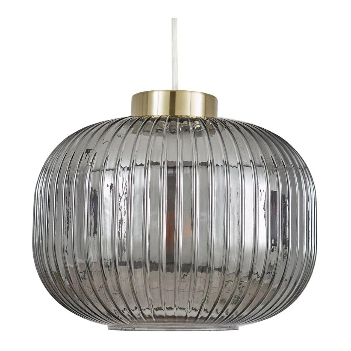 The Lyna Easyfit Smoked Glass Shade in Satin Brass from BHS brings a touch of 1920s glamour to any room. This art deco-inspired ceiling light shade creates a distinctive ribbed lighting effect when illuminated, particularly when paired with our vintage-style filament bulbs (sold separately). The satin brass detailing adds an elegant finish, making this glass ceiling light shade a standout feature in any space. Fits over Existing Fixture Max wattage 10 Watt (LED Only) Dimensions Height 21cm Diameter 25cm Weight 1.5kg All screens vary in colour reproduction and whilst every effort has been made to display the colour as accurately as possible it is for guidance only.