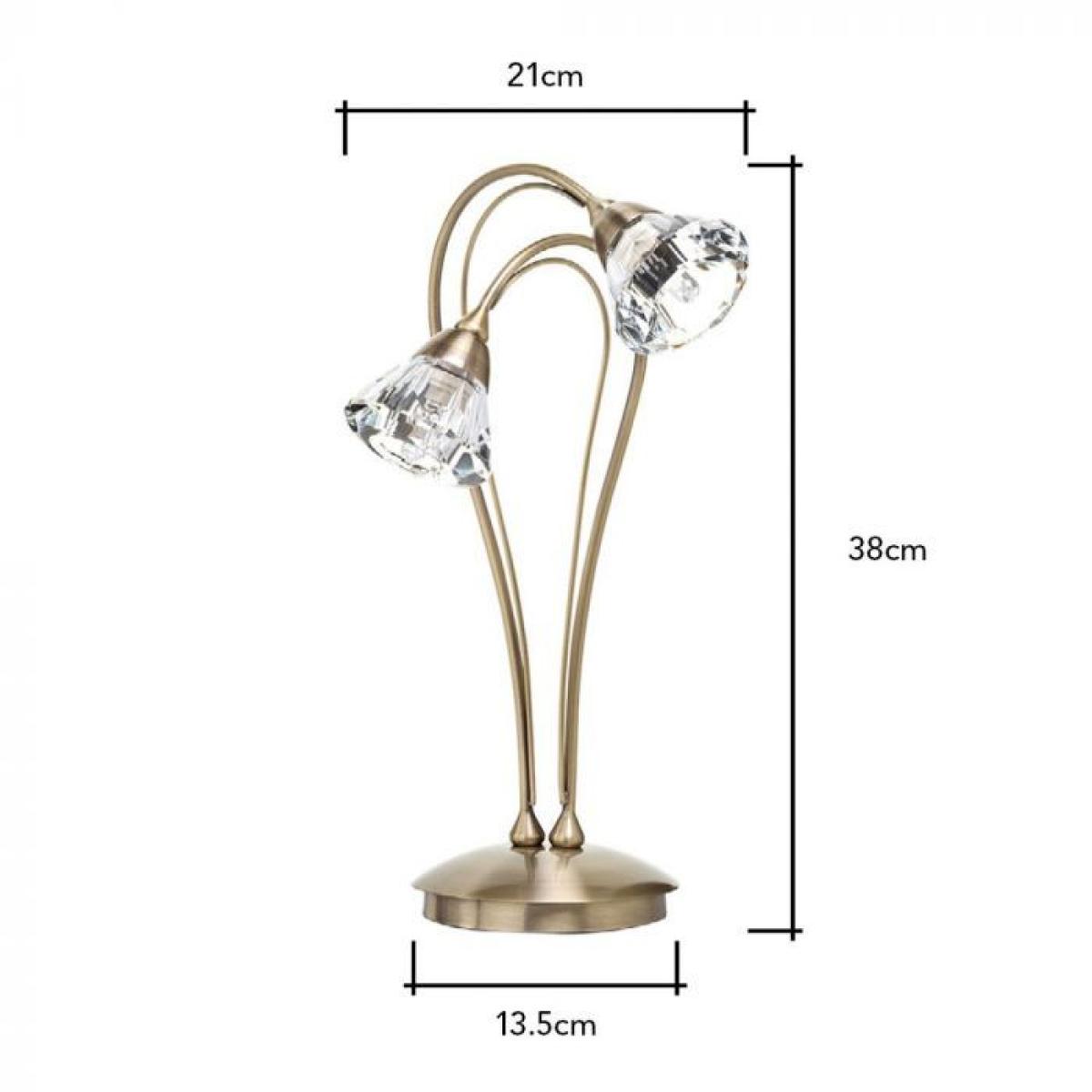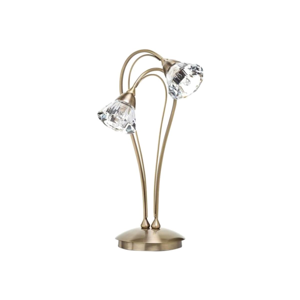 The Marianne Table light is a sophisticated lamp offering both style and elegance. Its 2 light design offers a soft, warm glow to the surrounding space, helping you unwind and relax. The curved arms reveal 2 faceted glass heads, which diffuse the light to give a soothing tone to your room. Its antique brass finish, gives this lamp a classic yet stylish twist. Weight (kg) 2.4 Number of Lights 2 Lights Bulbs Required 2 Bulbs Included No Cap Type G9 Compatible with LED Yes Height CM: 38 Width CM: 21 Shade Diameter CM: 8.0 Base Diameter CM: 13.5 Shade Material Glass Voltage 240V Material Metal