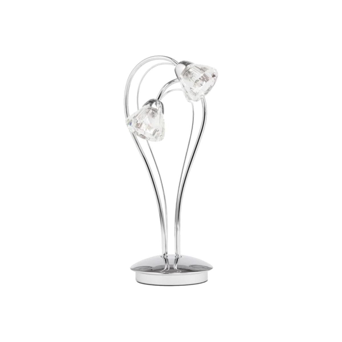 This Marianne table lamp is a beautiful contemporary design and a fantastic addition to any household with its soft, ambient illumination. The table lamp is Ideal as a bedside lamp featuring a chrome finish and 2 curving arms topped with cut glass shades offering an extra hint of elegance! Weight (kg) 2.4 Number of Lights 2 Lights Bulbs Required 2 Bulbs Included No Cap Type G9 Max wattage 28 Watt Compatible with LED Yes Height CM: 38 Width CM: 21 Shade Diameter CM: 8.0 Base Diameter CM: 13.5 Shade Material Glass Bulb Shape Capsule Voltage 240V Material Metal