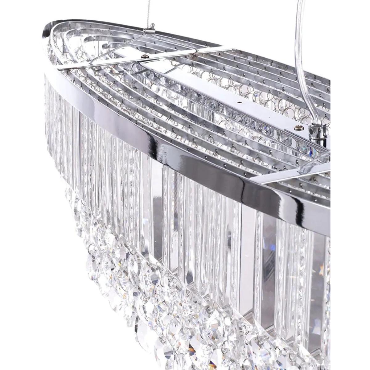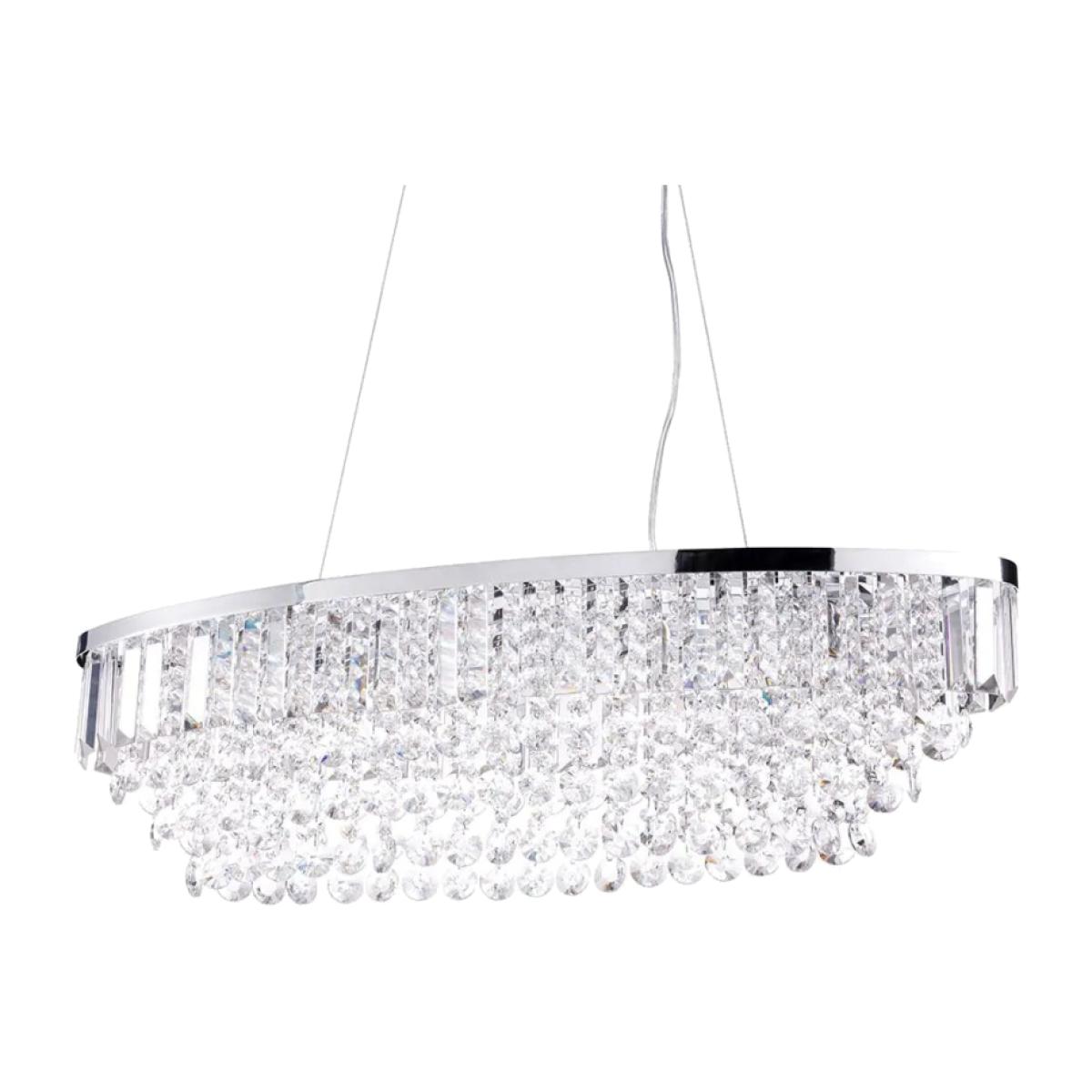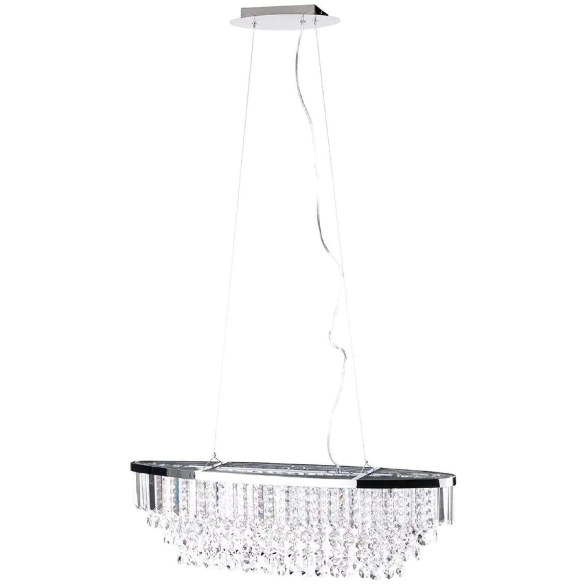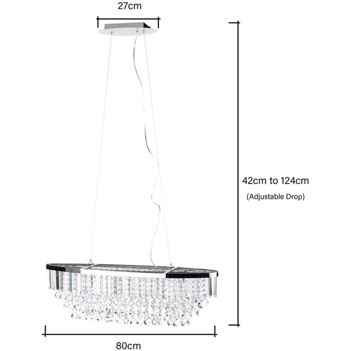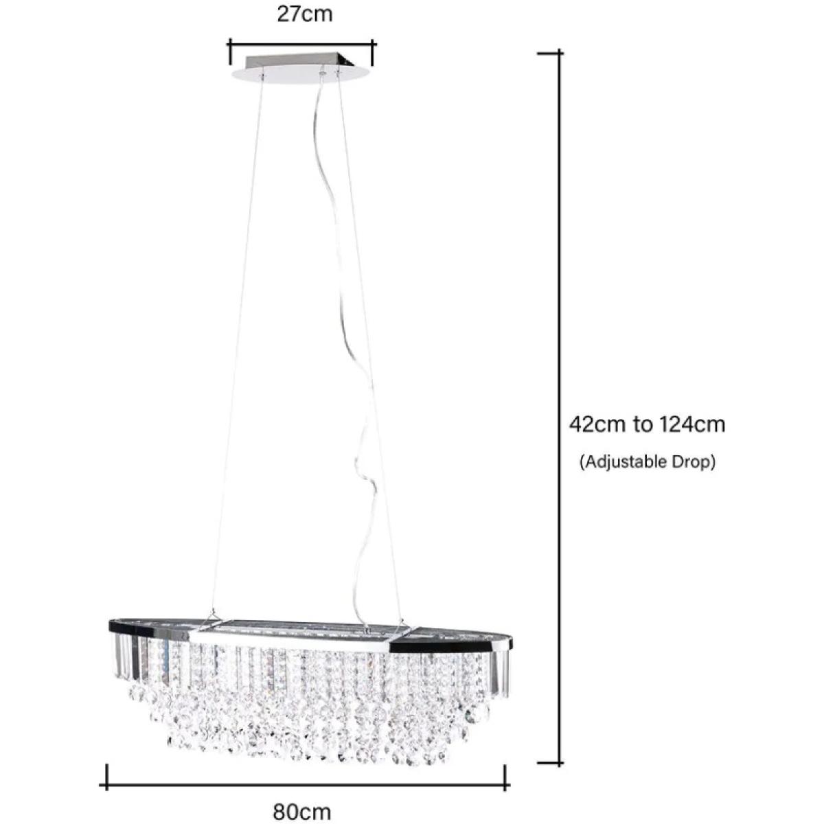 The elegant BHS Paladina Diner Pendant Ceiling Light in Chrome features a stunning array of crystal-effect glass droplets that shimmer and reflect light, creating a captivating centerpiece in any room. Its adjustable height allows for versatile placement, making it especially striking when hung over a dining table or kitchen island. A perfect blend of sophistication and functionality, this pendant light adds a touch of luxury to your home. 4 lights requiring G9 bulbs (not included) Compatible with LED Max wattage - 3 Watt (LED Only) Assembly required. Dimensions Height 40cm Length 80cm Width 20cm Adjustable drop between 42cm - 124cm Ceiling Cap 27cm Weight 7.4kg To ensure safe transit glass and crystal glass droplets may be packed separately and require dressing before installation.