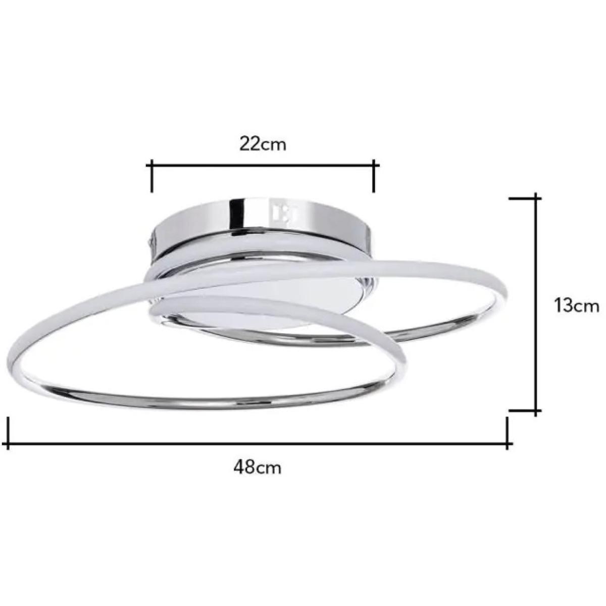 The BHS Pei Rings LED Flush Ceiling Light is a sleek, integrated LED ceiling light featuring a minimalist swirling loop design. Its chrome finish adds a modern touch, making it a bold statement piece for contemporary homes. deal for rooms with low ceilings, this stylish light fixture combines form and function, providing both elegance and space-saving practicality Integrated LED Dimensions Height 13cm Width 48cm Ceiling Cap 22cm Weight 2.1kg