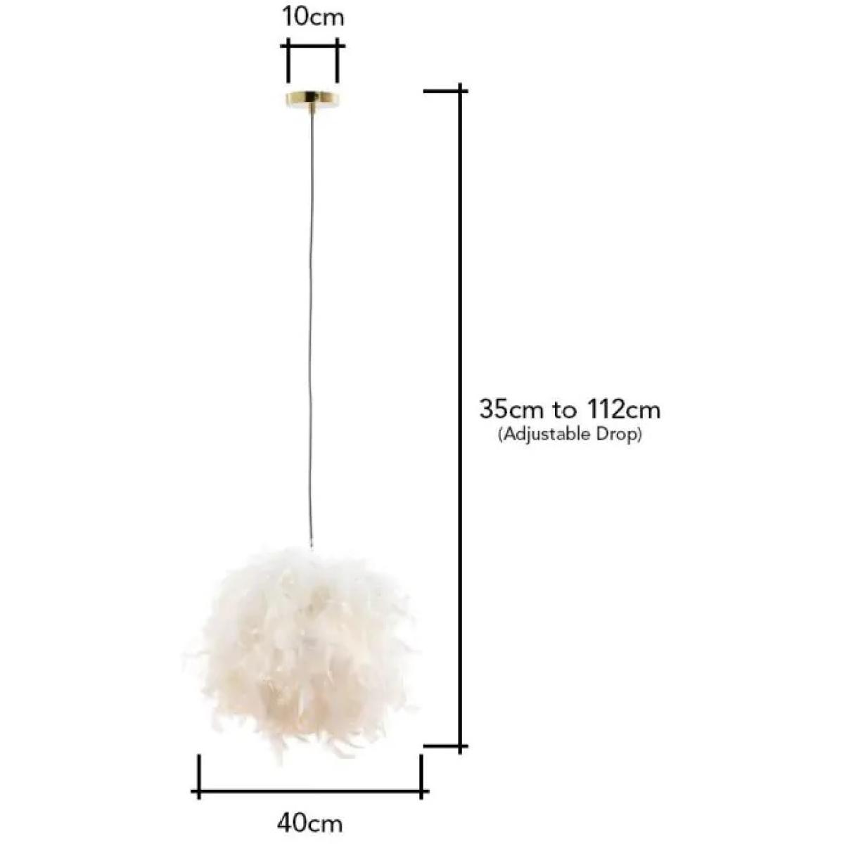 The BHS Plume Feather Ball Ceiling Pendant in Brass is a bold and stylish statement piece for any room. Featuring a 40cm feather shade that elegantly encases the inner bulb, this unique pendant light adds a touch of softness and sophistication. Suspended from a polished brass fitting, it brings a luxurious yet playful element to your space, perfect for those looking to make a design statement. 1 Light requiring an E27 Edison screw bulb (Not Included) Some assembly may be requried. Max wattage 42 Watt Compatible with LED May Require Assembly Required Dimensions Diameter: 40cm Ceiling Cap 10cm Adjustable drop from 35cm to 112cm Weight 0.8kg