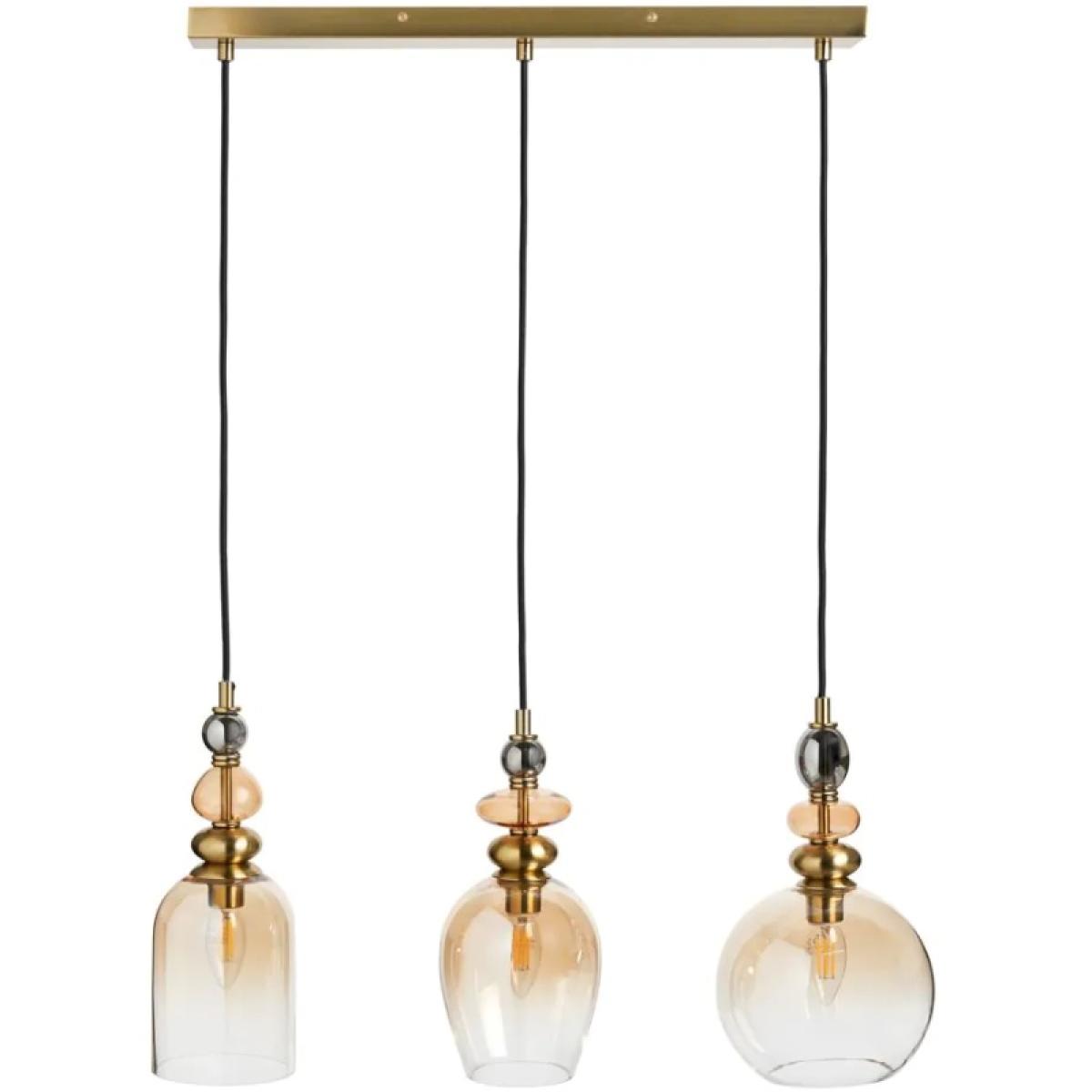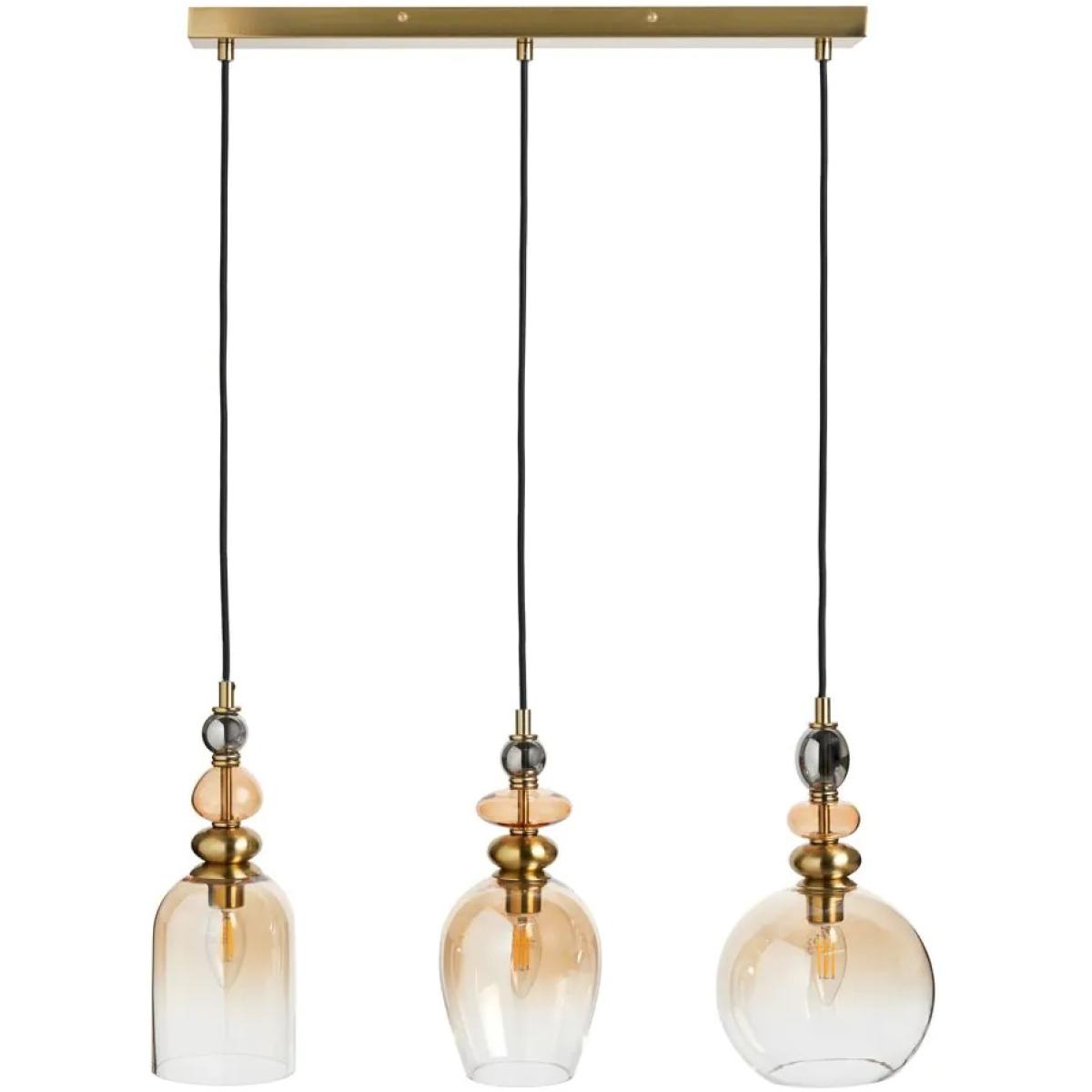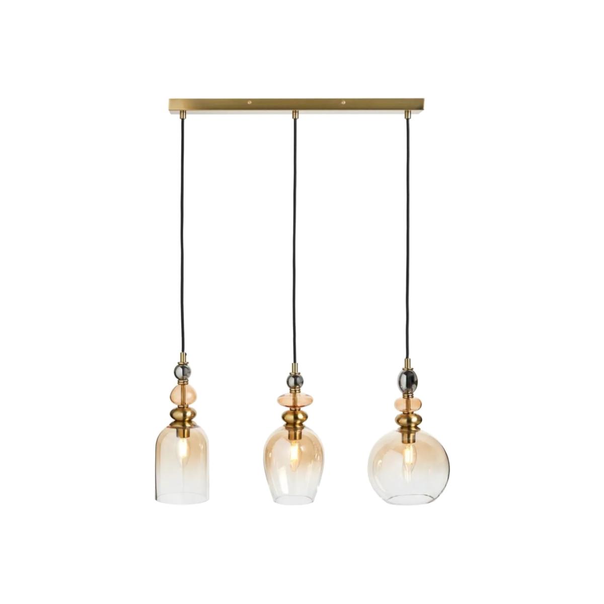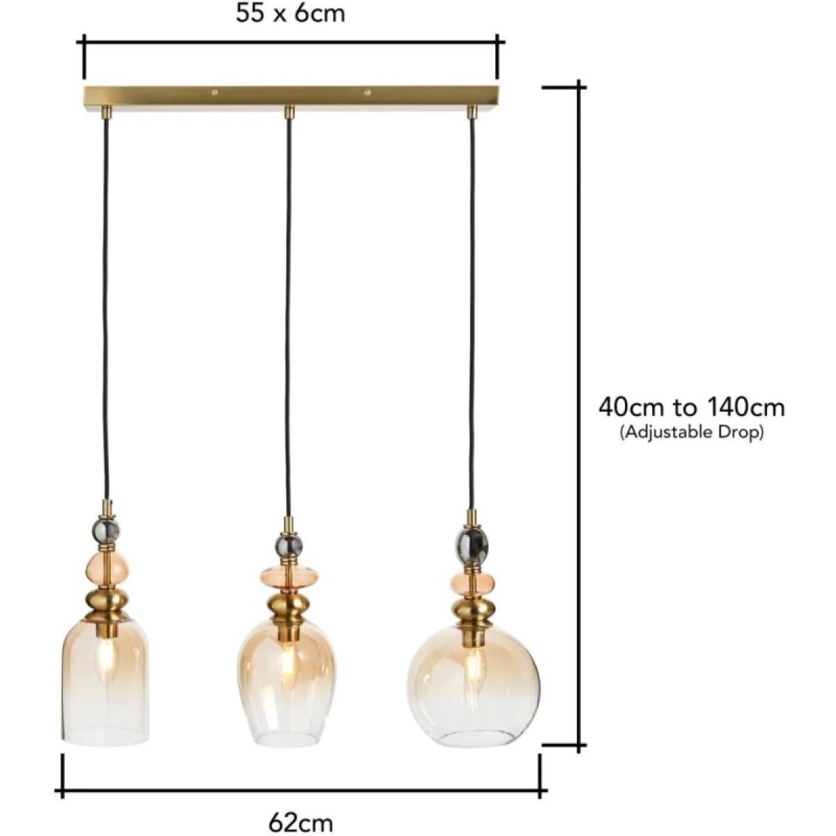 The BHS Seline Champagne 3 Light Diner Pendant in Satin?Brass is a sophisticated and stylish lighting solution, perfect for enhancing dining areas, kitchen islands, or breakfast bars. With three elegantly varied glass shades—and subtle ombré tones—it delivers even illumination along a linear bar design. The satin brass finish lends a luxurious, classic-meets-contemporary aesthetic, while the adjustable drop height (up to approx. 140cm) ensures versatility for both standard and high ceilings. Compatible with three E14 small Edison screw bulbs (up to 6 W LED; not included), this 62cm long and 17cm deep pendant balances form and function, weighing about 3.2kg. Installation is straightforward with self-assembly instructions included, and care is easy: simply wipe clean with a dry cloth. Material: Metal & Glass Product Type: Pendant Number of Lights: 3 Light Source: LED Cap Type: E14 Small Edison Screw (not included) Bulb Shape: Candle Voltage: 220-240V Max Wattage: 6 W Some Assembly Required Dimensions: Height: 140cm Length: 62cm Minimum Drop: 40cm Maximum Drop: 140cm Ceiling Cap: 55 x 6cm Weight: 3.2kg All screens vary in colour reproduction and whilst every effort has been made to display the colour as accurately as possible it is for guidance only.
