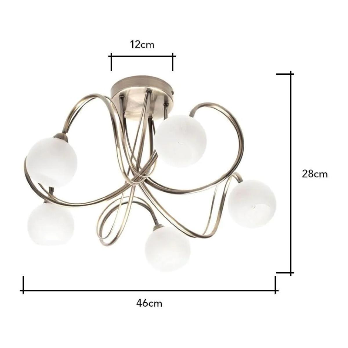 The BHS Soni 5 Light Flush Ceiling Light in Antique Brass blends simplicity with modern elegance, making it a perfect addition to any interior. Simple yet modern the Soni flush ceiling light is a piece that will look great in any interior. Offering a sleek 5 arm design and alabaster glass shades this flush fitting will really help save on space.   5 lights requiring G9 bulbs (not included) Max wattage 28 Watt Compatible with LED Assembly Required  Dimensions Height 26cm Width 40cm Diameter 40cm Shade Height 8cm Shade Diameter 10cm Projection 28cm Ceiling Cap 12cm Weight 2.5kg