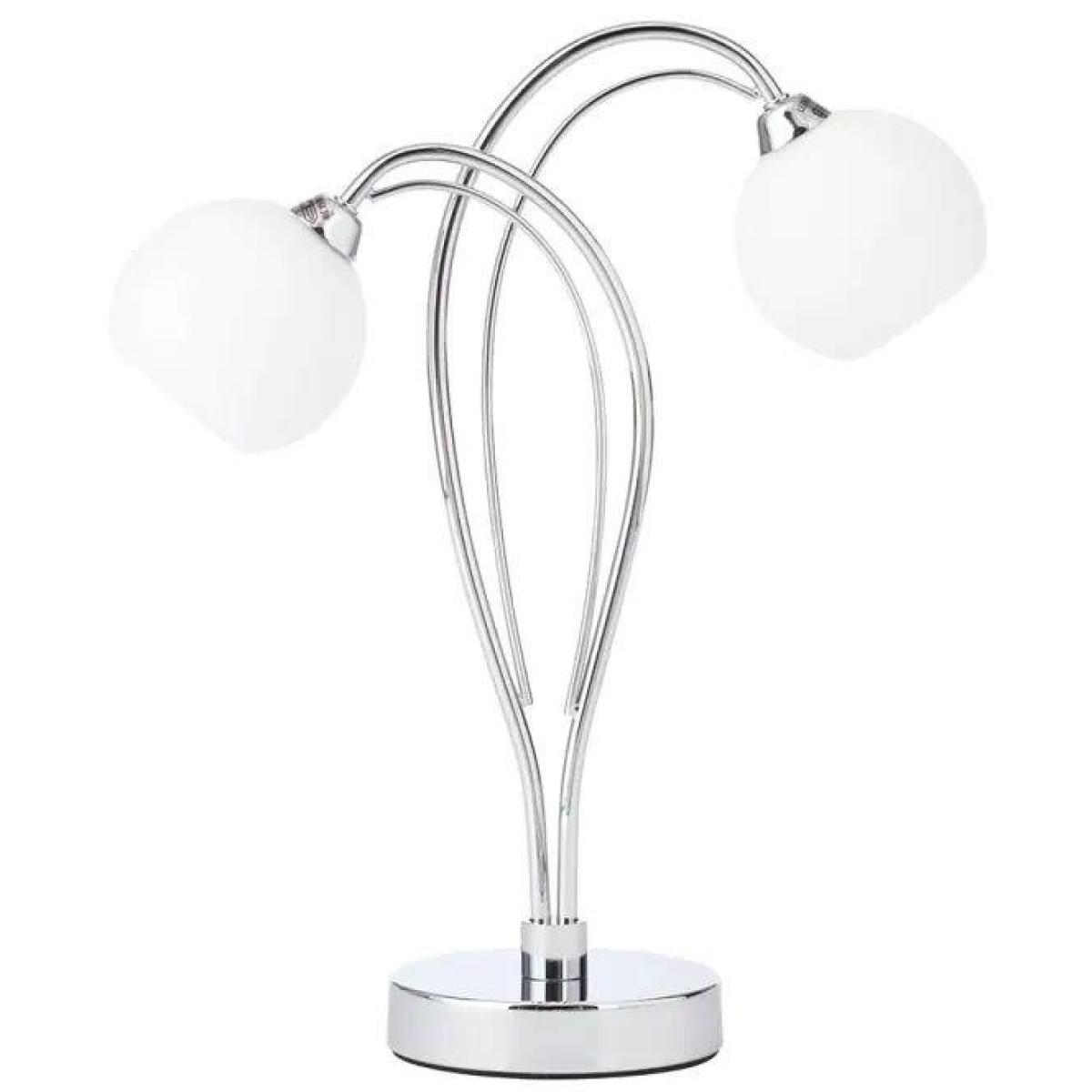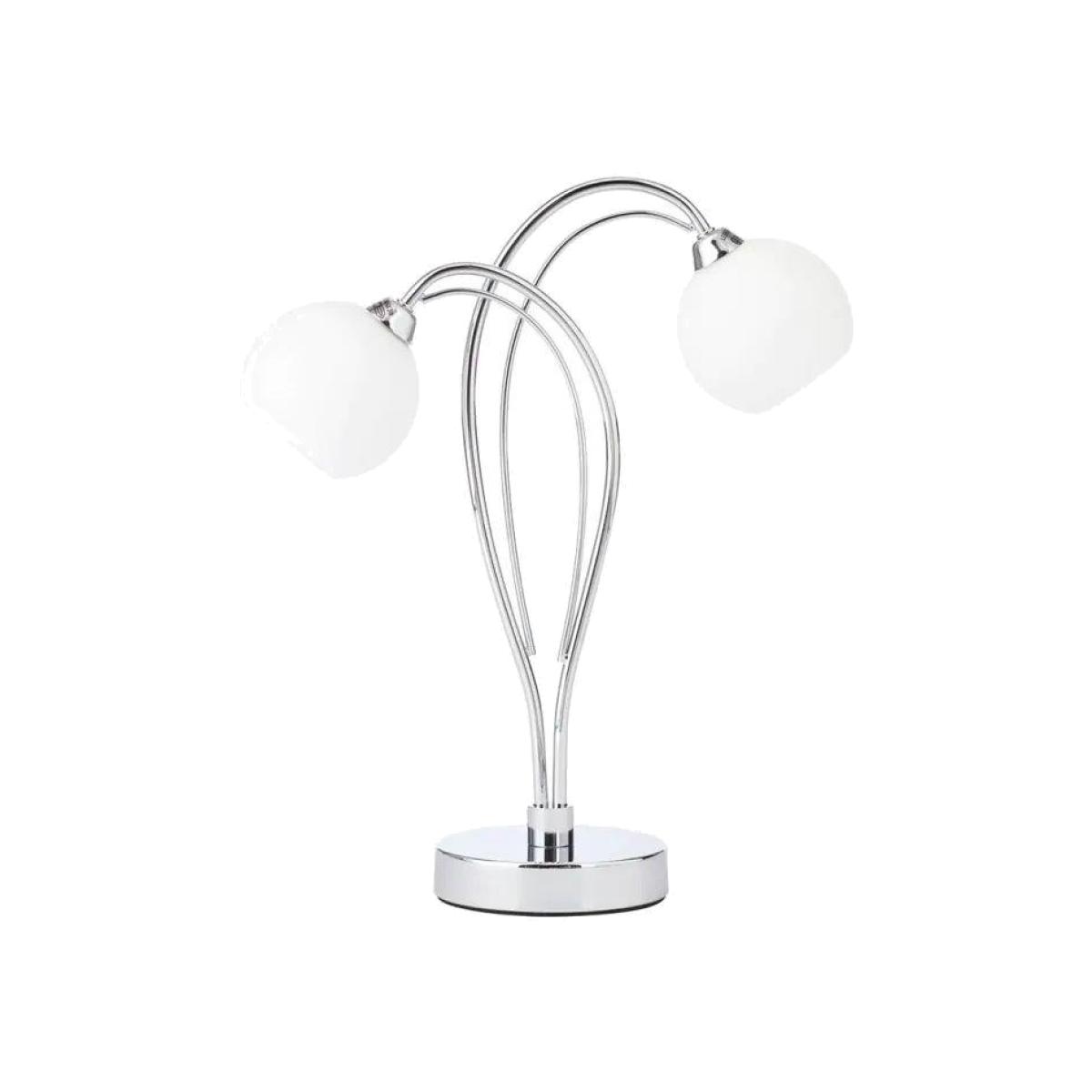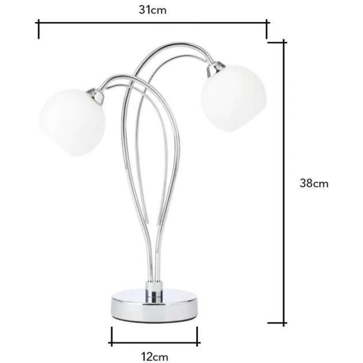 I love this lamp’s sleek, contemporary look, making it a versatile piece that can elevate both modern and transitional interiors. The chrome finish adds a reflective, clean touch, while the opal globes diffuse light softly, making it ideal for bedside tables or sideboards. It pairs well with minimalist schemes but can also work as a statement piece in eclectic spaces. Practical styling tips include placing it on a neutral base to highlight its metallic details or combining it with other chrome accessories for a cohesive look. It’s particularly effective when paired with softer textiles or natural textures to create balance and soften the overall vibe.