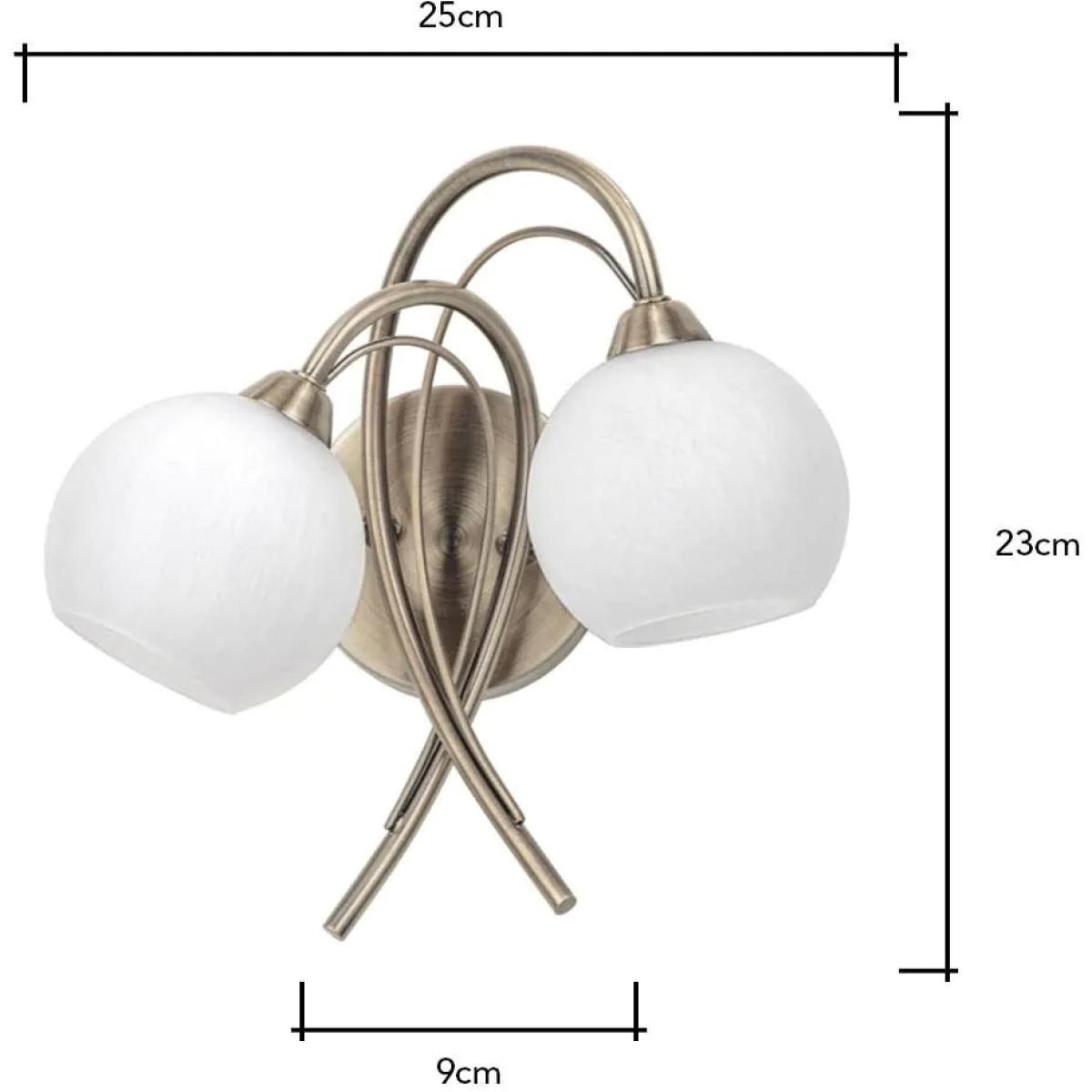 The Soni Wall Light combines an antique brass finish with alabaster glass shades to give your home a soft, versatile aesthetic. This classy design goes with any decor and would be a perfect fit for any room in your home. Looks good on its own or paired with the other Soni lights. Number of lights: 2  Bulb type: 2 x G9 bulbs required (not included) Shade: Glass Compatible with LED Max wattage:3W (LED only) Dimensions: Height: 23cm Width: 25cm All screens vary in colour reproduction and whilst every effort has been made to display the colour as accurately as possible it is for guidance only.