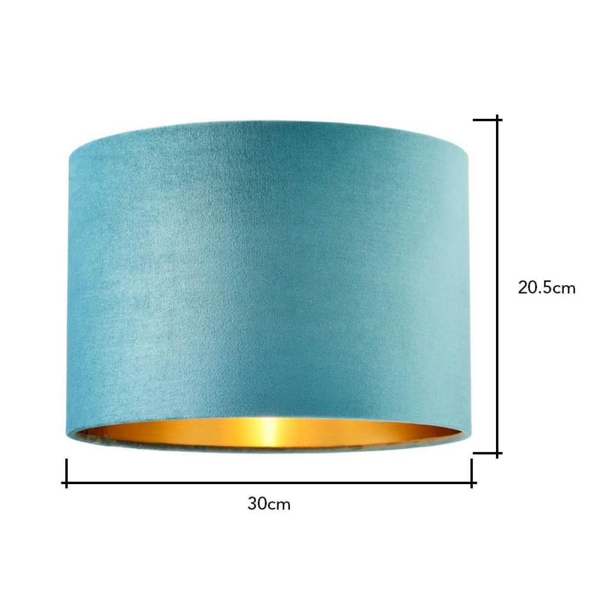 The Velvet 30cm Shade in Teal and Brass will add a sophisticated look to your home, with a luxurious, velvety shade shimmering in the light and creating a gorgeous accent piece. Its teal finish will give your room a pop of colour while the brass finish will create a warm glow that illuminates through your room creating a relaxed atmosphere. With easyfit capability, this shade can be easily incorporated onto any pre-existing base. Number of Lights 1 Light Bulbs Required 1 Bulbs Included No Cap Type Fits over Existing Fixture Compatible with LED Yes Height CM: 20.5 Diameter CM: 30.0 Shade Height CM: 20.5 Shade Diameter CM: 30.0 Shade Material Velvet Material Brass