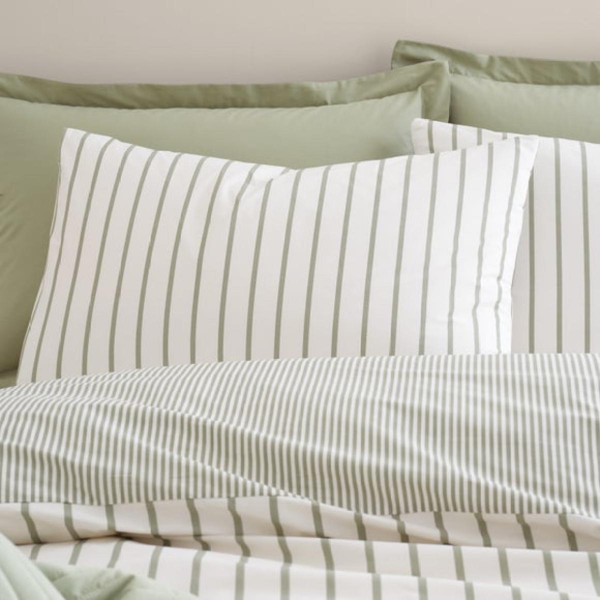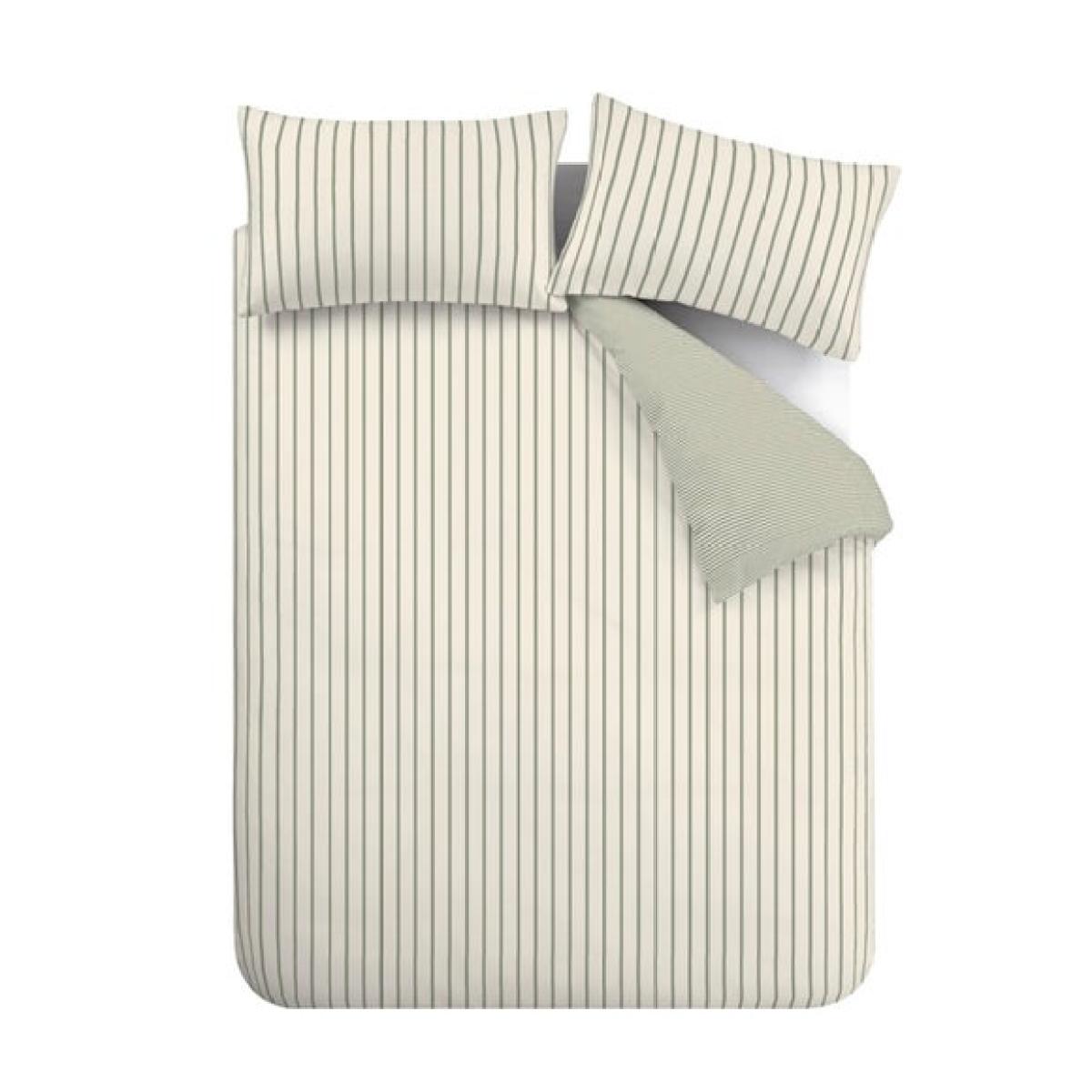 * Breathable and Crisp 100% Cotton composition * Breathable and Crisp 100% Cotton composition * Elegant, reversable striped design * Button closure * Machine Washable Classic stripes never go out of style – and this Bianca Hampton Stripe bedding brings a fresh take to the timeless look. In a soothing palette of soft green and cream, it brings a restful feel to any bedroom. Fully reversible, the smaller stripes on the back let you switch up your look with ease. Crafted from breathable 200 thread count cotton percale, this set is perfect for anyone who values both comfort and style.