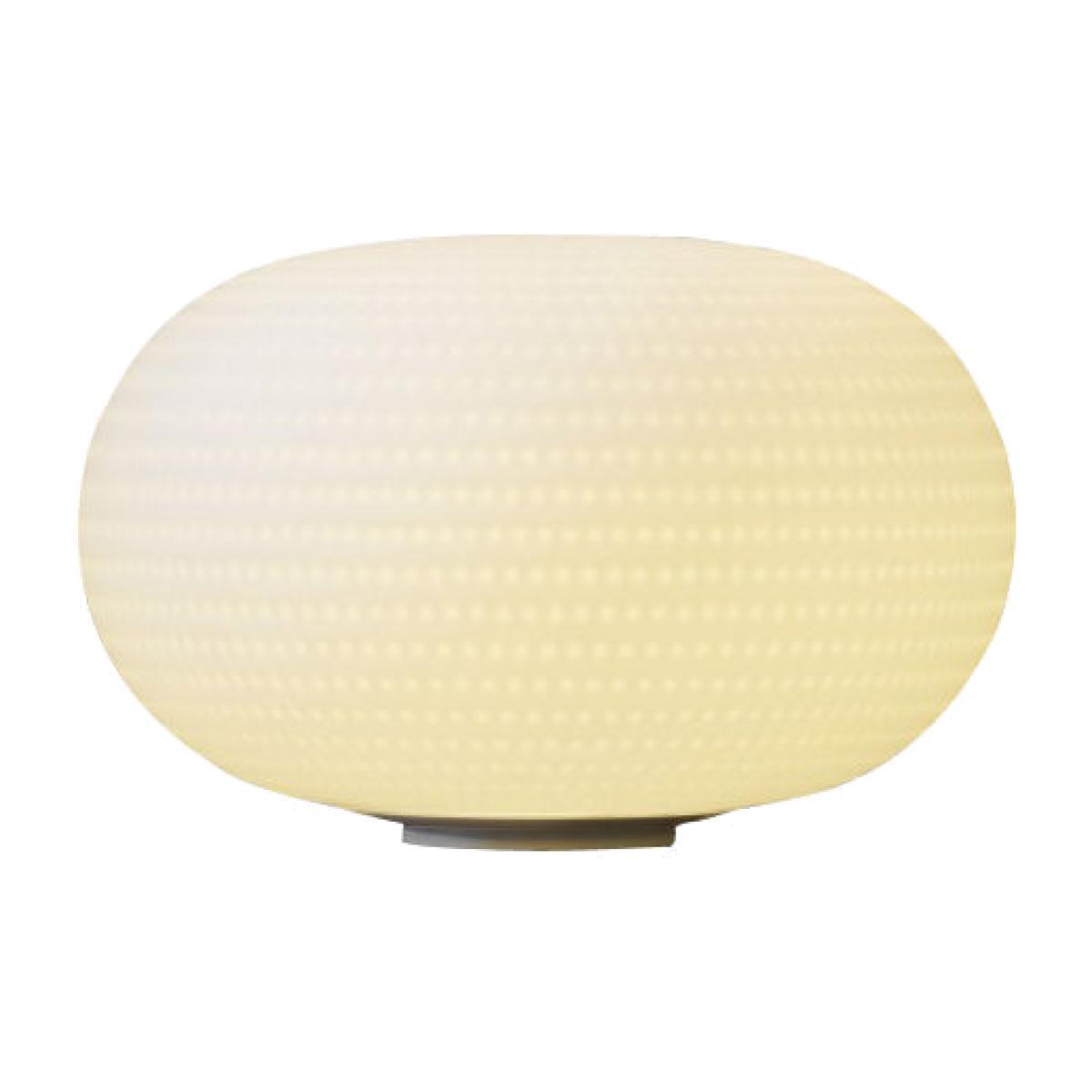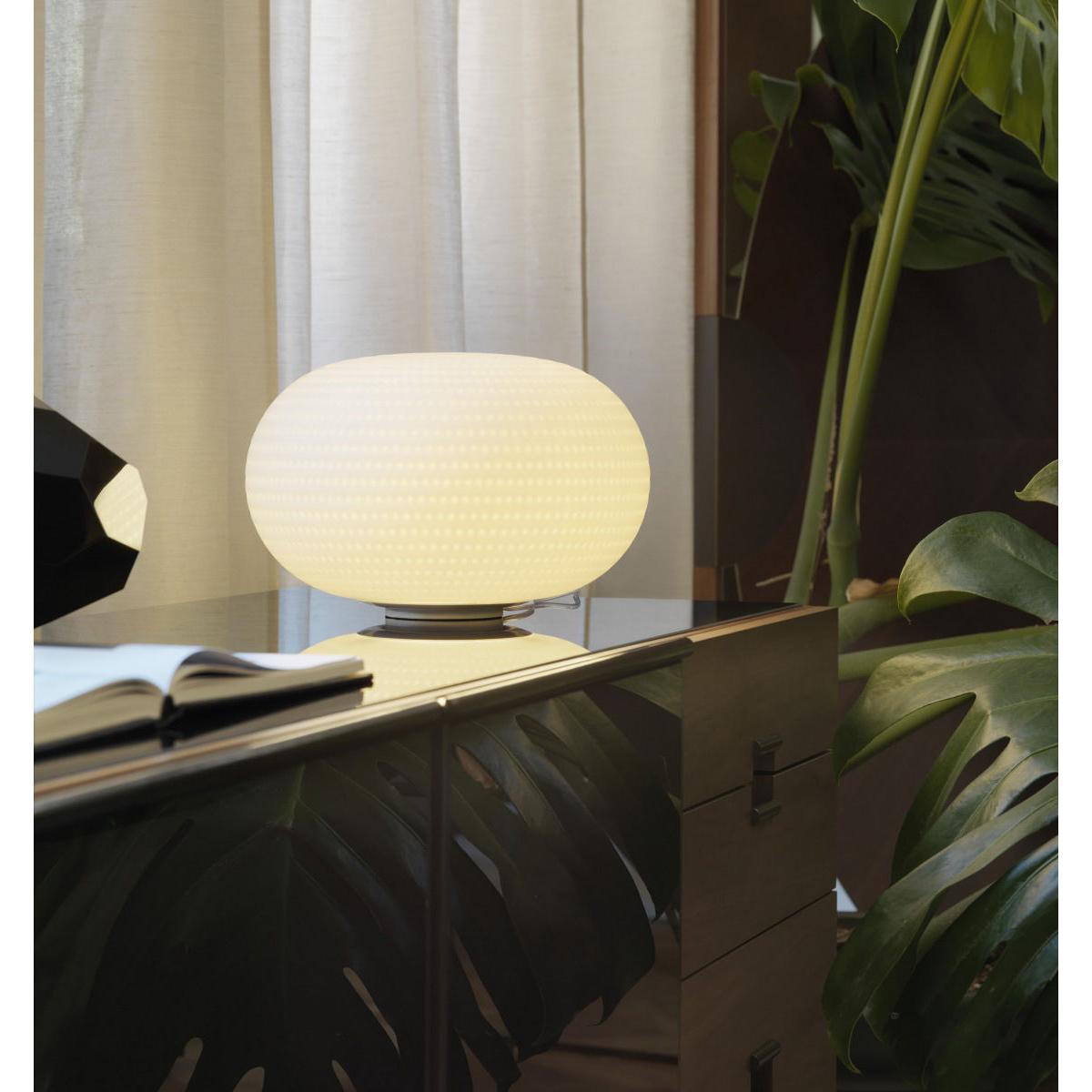 Bianca is a family of lamps with diffuser in blown glass, comprising hanging, floor and table versions, the latter with or withoutbase. Its beautifully balanced shape is enriched and made unique by an orderly series of delicate, light grooves that, on the whitevolume of the glass, look like tiny prints on fresh snow. The geometrics of this lamp are the perfect example of how working with glass reminds you of this material's memory and thefact that it bears the signs of any treatment it undergoes. For example, when you press the still warm glass on a worked surface,the mark that this creates will slowly fade, but never completely disappear. The starting point for the design of Bianca was tocreate a surface in glass that would capture both the quality of the material and the light. The surface of a geometric structure, dotted by tiny dints, turns glass into something that is a solid memory of cloth, a return tothe traditions of FontanaArte that by choosing frosted opaline glass accentuates the elegance of the lamp and maximizes its lightemission.