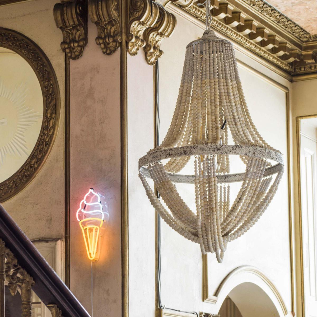 I love this little bead chandelier for its ability to add a touch of glamour and texture without overwhelming a space. It works particularly well in boho, coastal, or vintage-inspired interiors where natural textures and relaxed elegance are key. Practical styling tips include hanging it in a lower position above a dining table or sideboard to create a focal point, or using it in a smaller room where a large statement fixture might feel too overpowering. Pair with warm lighting to enhance the bead details and avoid overly matching furniture; instead, consider neutral or soft pastel shades to make the chandelier stand out beautifully.
