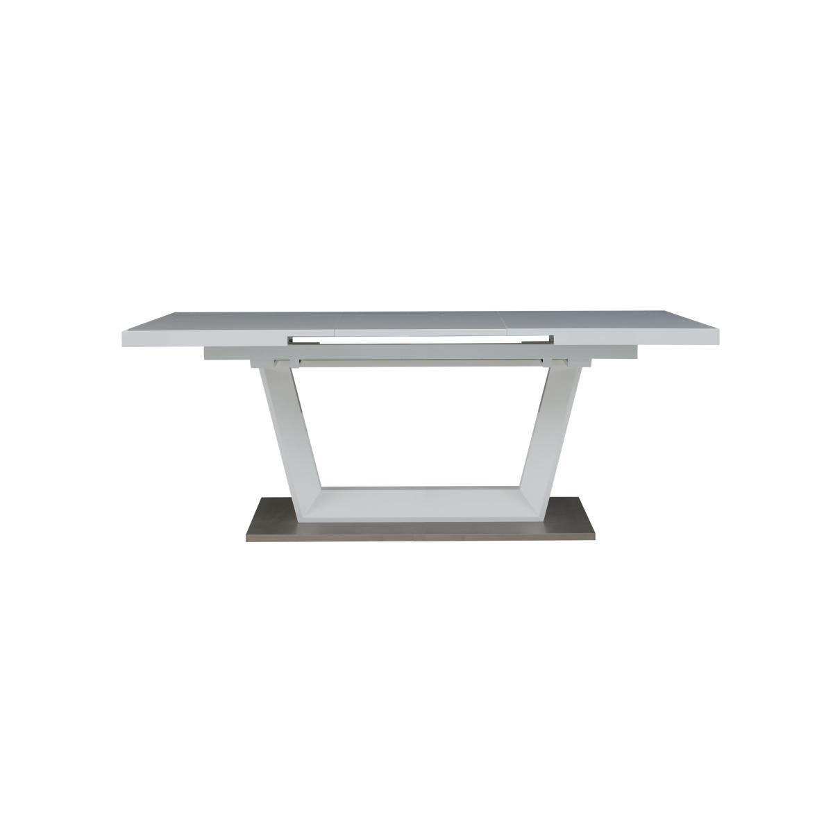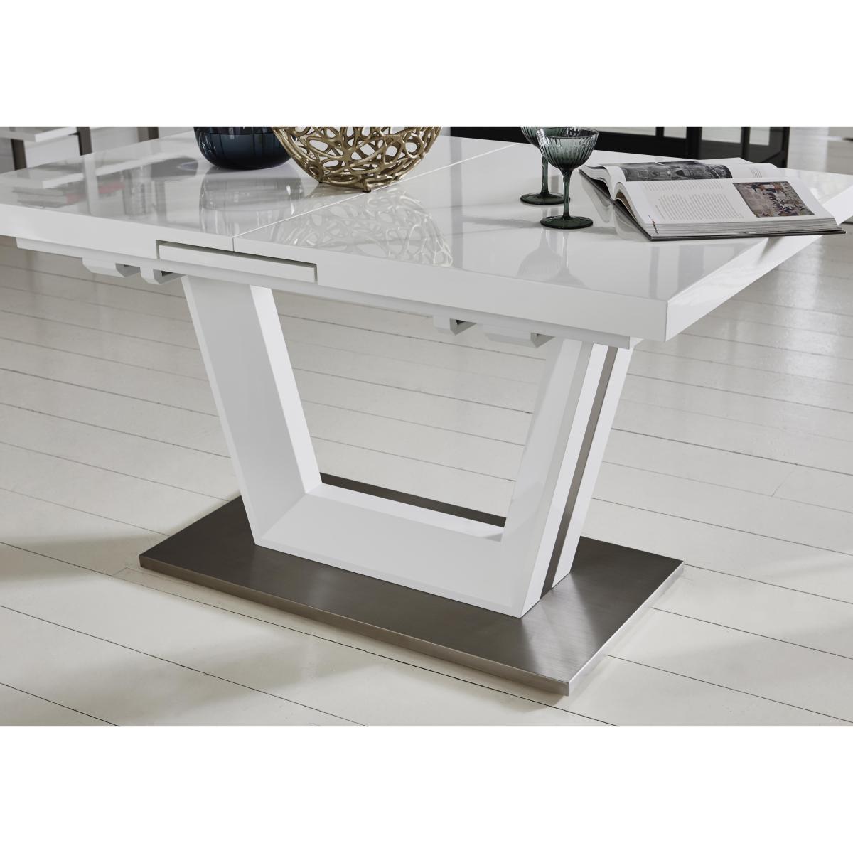 Gorgeously glossy and bright, Bianco dining and occasional furniture will make your home feel light and spacious. The ultra-modern style, sculptural pedestal bases and sleek brushed detailing make a bold design statement. This extensive dining and occasional range includes space-saving pedestal dining tables with smooth pop-up extension leaves, the larger dining table seats up to ten. Chic faux leather dining chairs add a pop of colour in six fashionable shades. Choose all one colour, or go for a mix. The Bianco range is exclusive to Furniture Village, at a great value price. Glossy modern style, fabulous value for money. Large, statement extending dining table with six Bianco faux leather dining chairs. Why you’ll love it. Designer modern dining at a great value price. Hardwearing white high-gloss UV finish. Open, angled pedestal base with sleek steel detailing. Large dining table with a pop-up leaf extends to seat ten. Six chic, comfy faux-leather upholstered chairs. In a choice of six colours. Or choose our ‘mix’ option – one of each of the six colours. What you need to know. U-shaped pedestal sits on a substantial brushed steel plinth. Smooth, reciprocal action pop-up mechanism. High-gloss spraying creates an ultra-smooth surface. Hairline marks are a natural feature of the high-gloss finish. Chairs have brushed steel, tubular cantilever style legs.