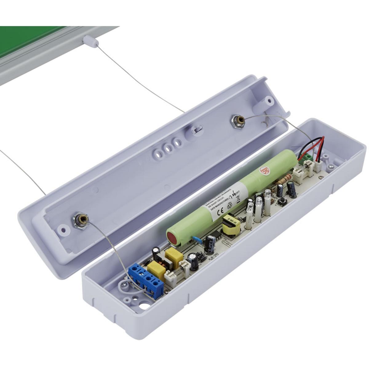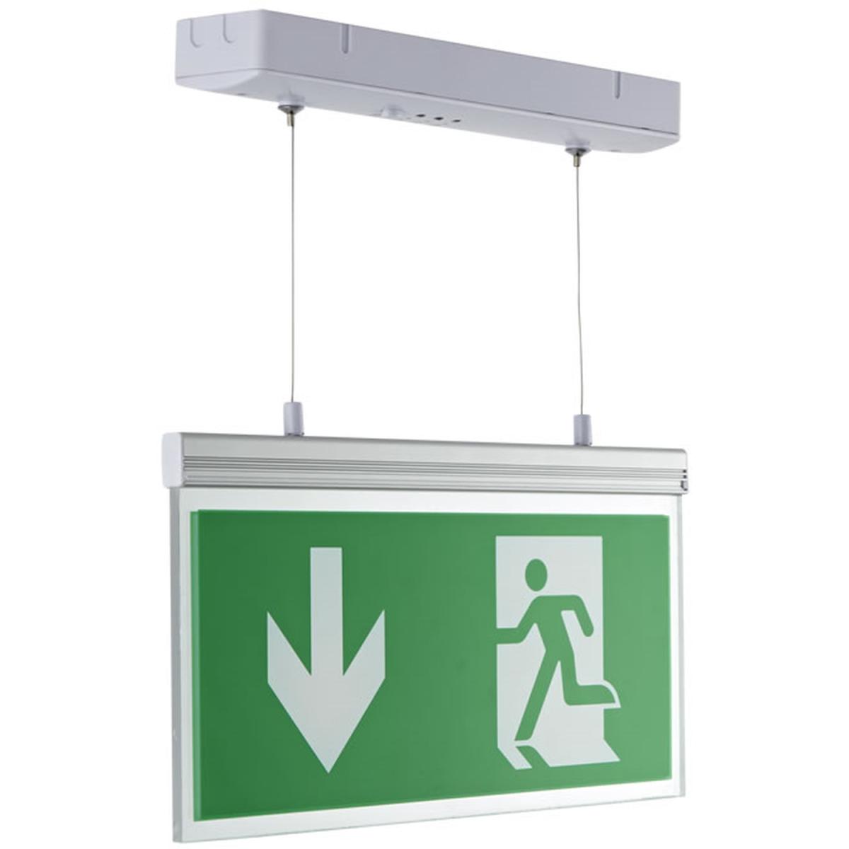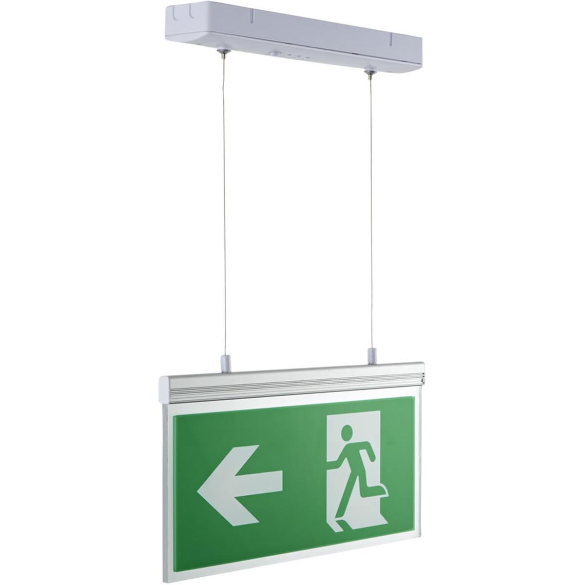 Biard LED 2.8W Emergency Exit Sign Double Sided Edge Light - DownLeft. Right This double-sided LED exit sign light is ideal for illuminating emergency exit routes. Designed to flood the space with powerful cool white light for maximum visibility. The integrated LED projects light across 120 for up to 25,000 hours. Operating automatically for a minimum of three hours in the event of the main power supply failing. Plus, a 24 hour battery charge. Adjust the 250mm steel cables to suit the height of the exit.