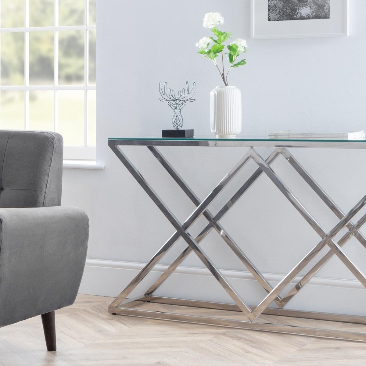 I’m a big fan of this grey console for its clean lines and chrome-frame detail - it slots effortlessly into contemporary, minimalist or even transitional halls and living rooms without feeling too heavy. The glass top keeps the look light, while the angular X-base adds just enough visual interest. For styling, think simple clusters: a round mirror hung above, one or two neatly stacked coffee-table books, a low-profile vase of foliage and a slimline lamp or decorative tray. In a narrow hallway, add a bowl for keys and keep accessories pared back to let the console’s silhouette shine.