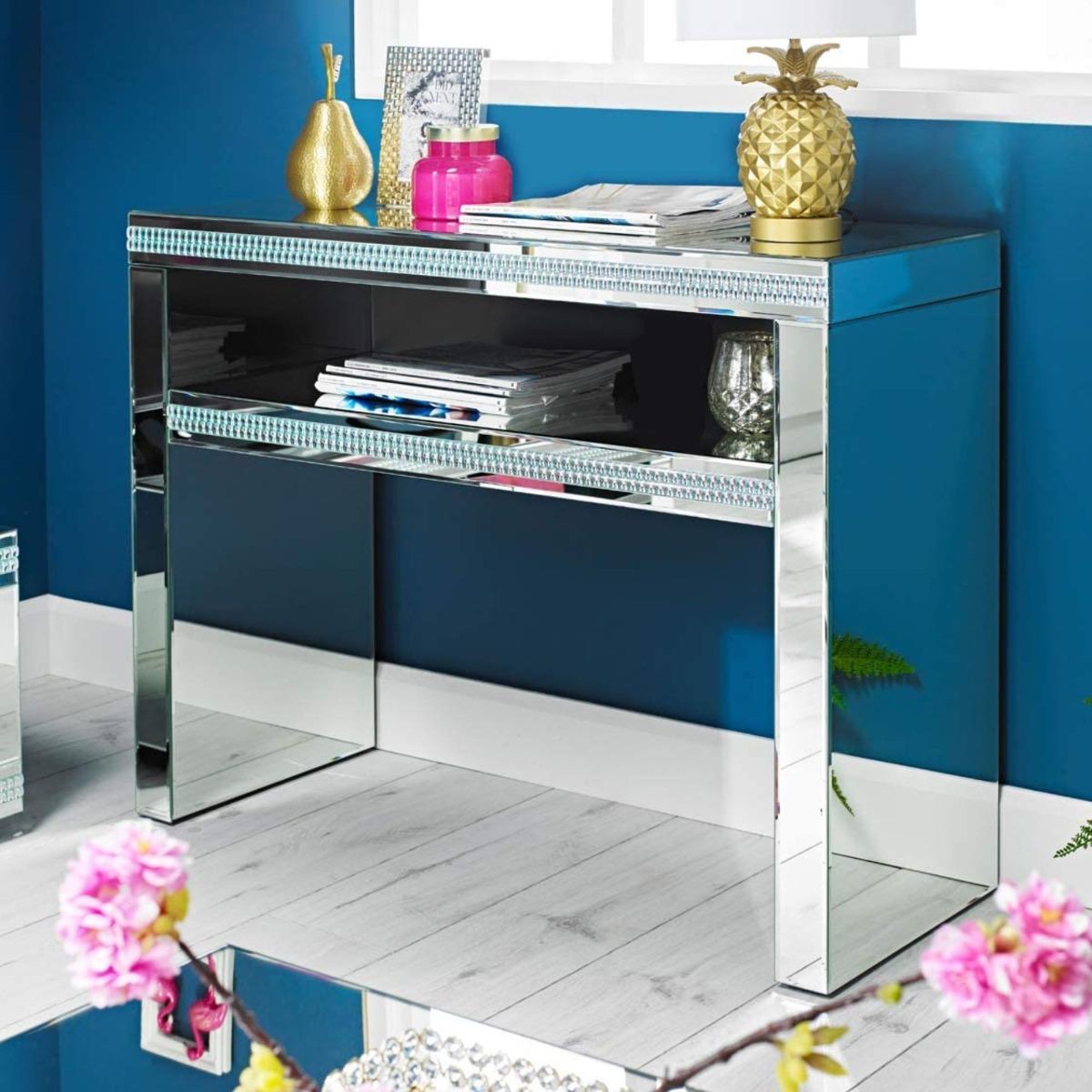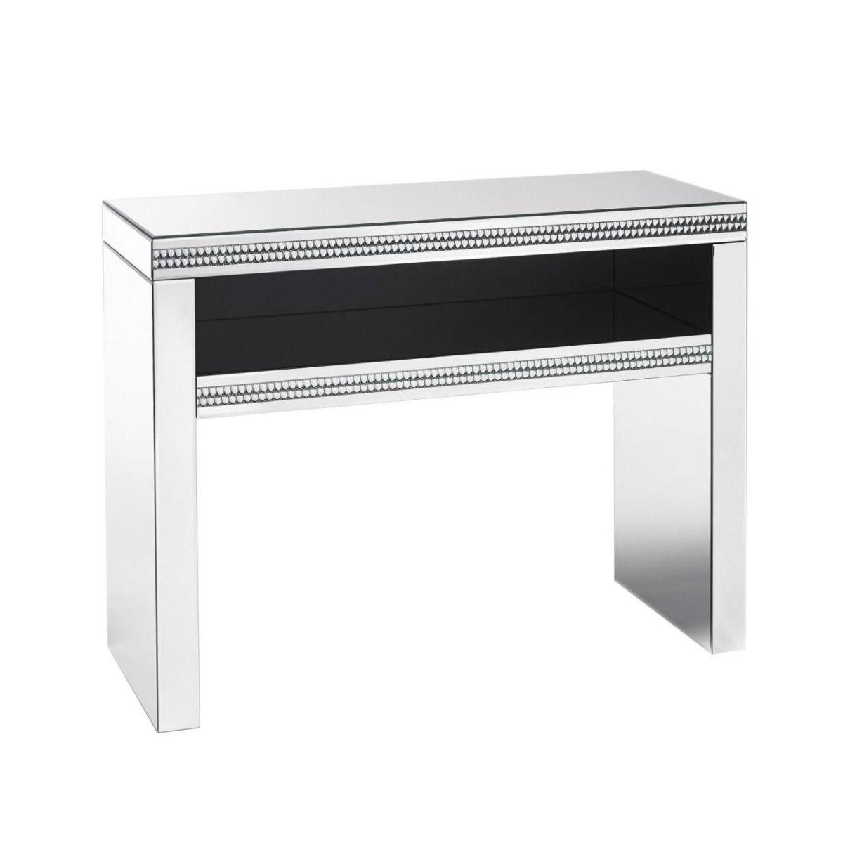 Stunning mirrored side table with opulent crystal detailing. Update your interiors with the beautiful Biarritz console table, a fashionable piece perfect for modern interiors. An opulent design, this mirrored console table has strips of crystals adding to its opulence. Perfect for displaying your favourite ornaments and home decorations this mirrored console table will create a statement in hallways, living spaces and dining areas.