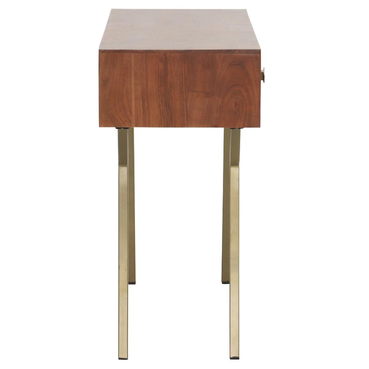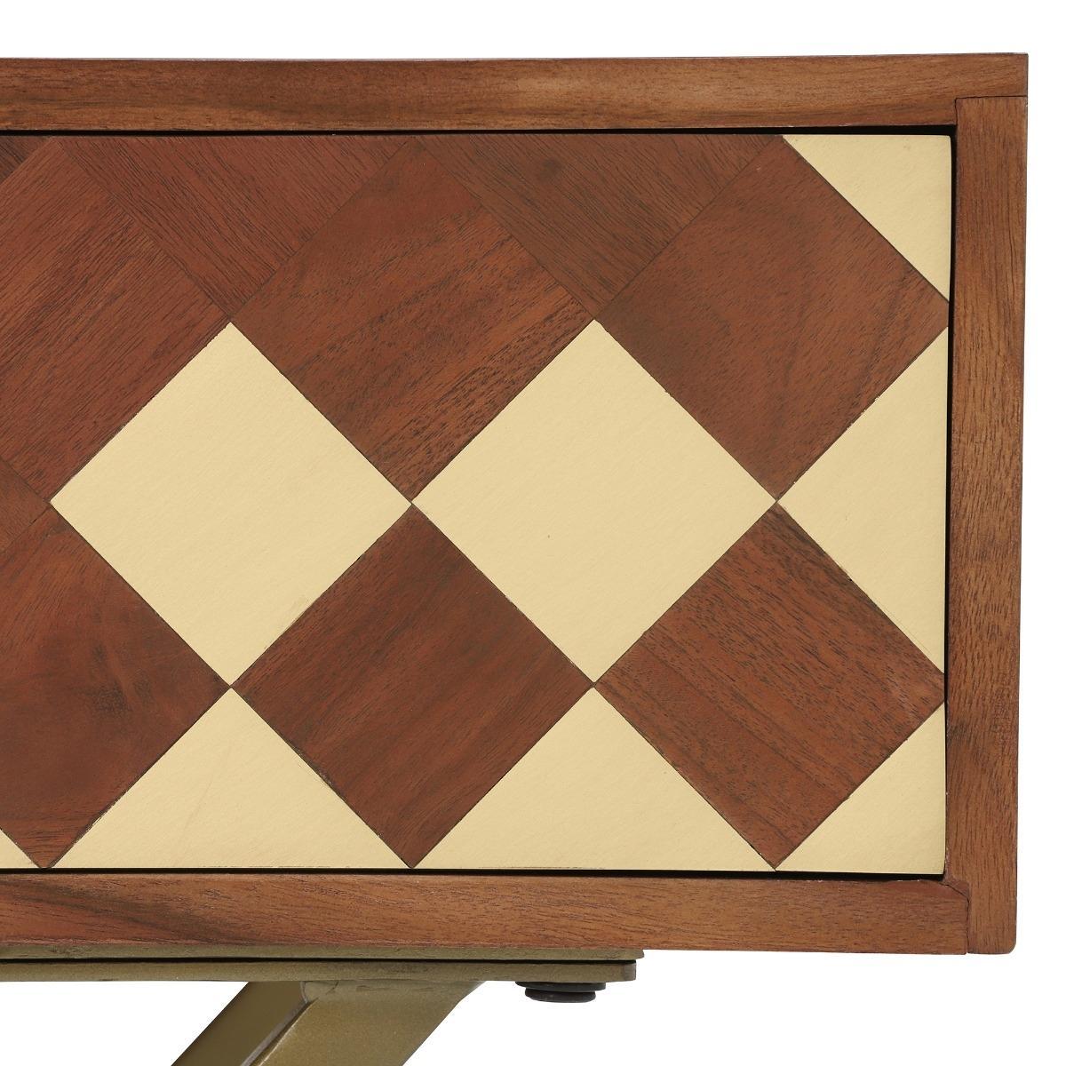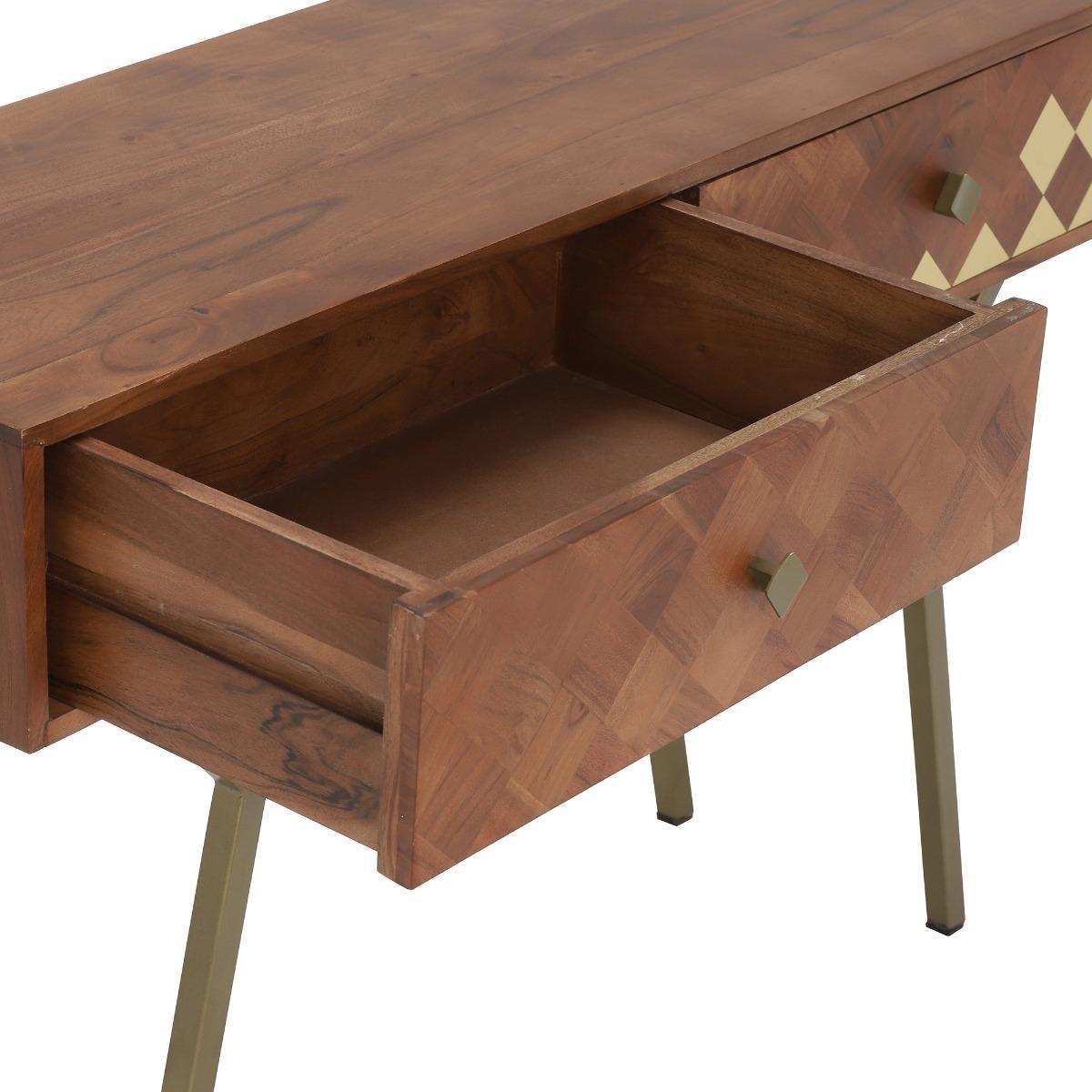 Design. An attractive piece with plenty of character. Brass inlays are a lovely detail which add to the mid-century style of the Bibi Console Table, Splayed legs provide a supportive finish to this practical piece and coordinate perfectly with the geometric design to the front. Each drawer is fitted onto runners for easy opening and closing and is fitted with a square brass handle to the centre.