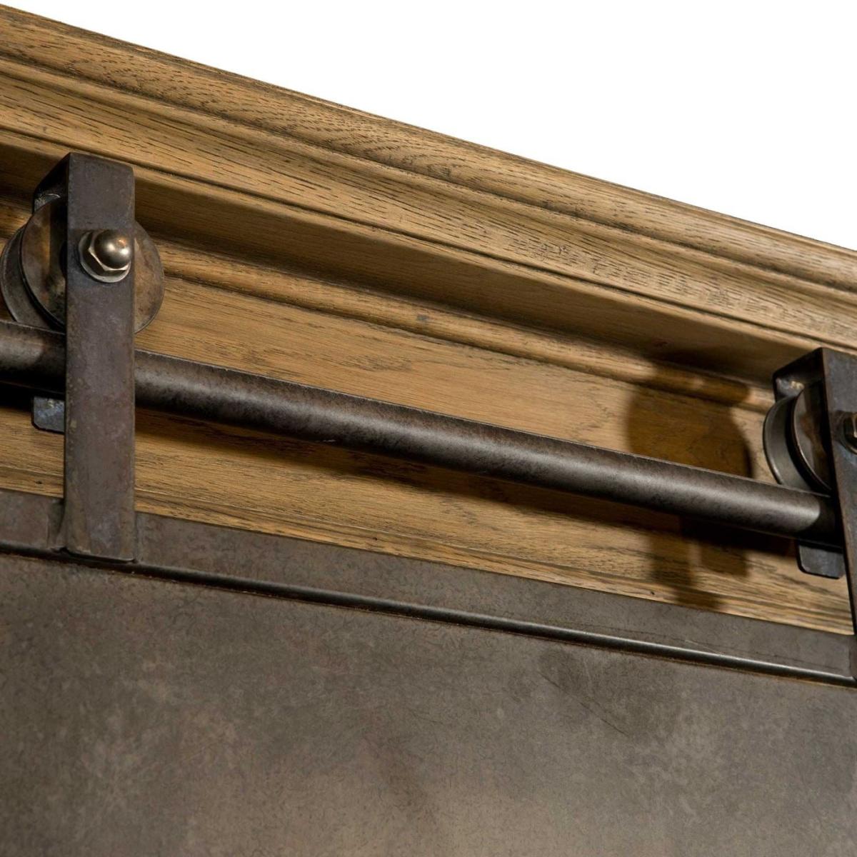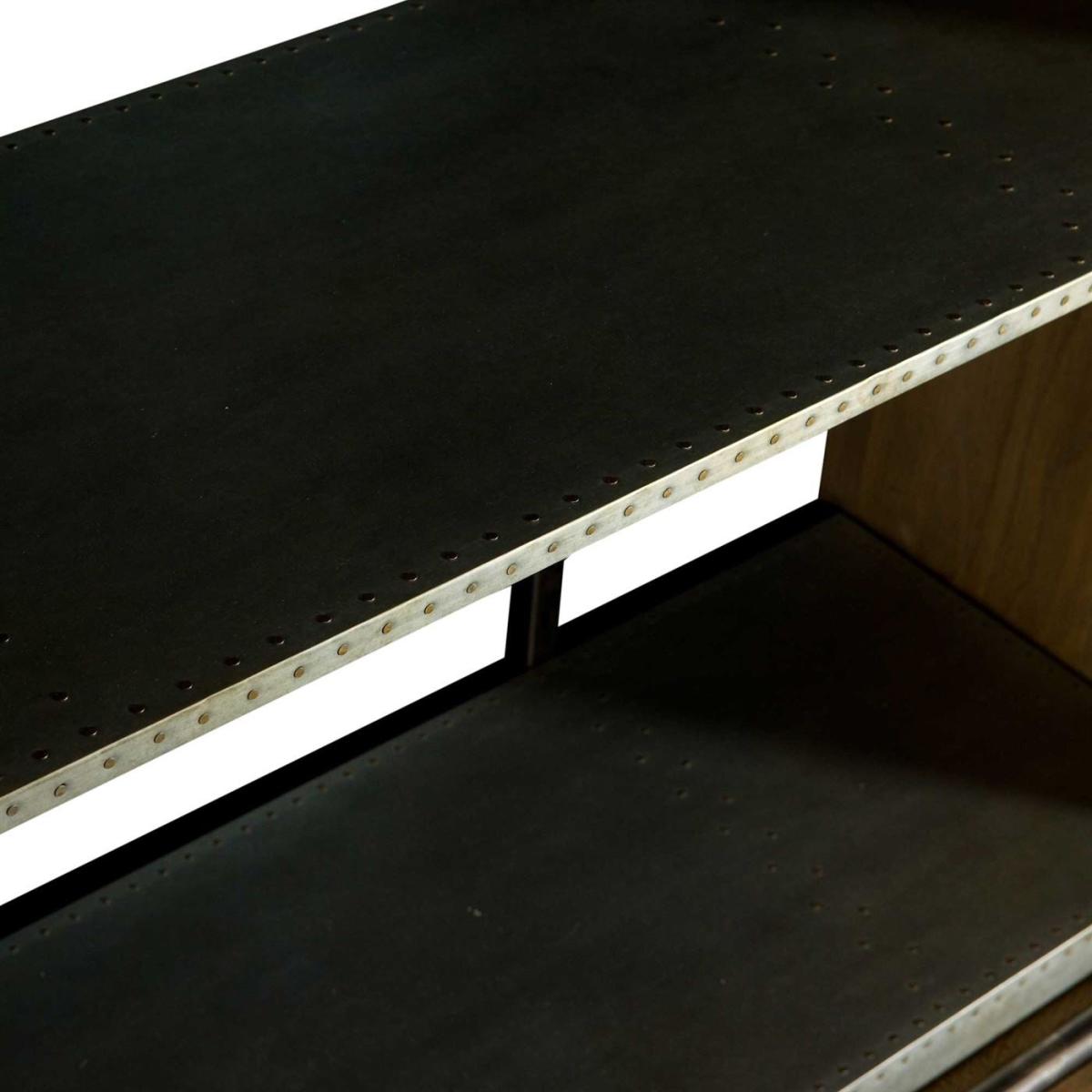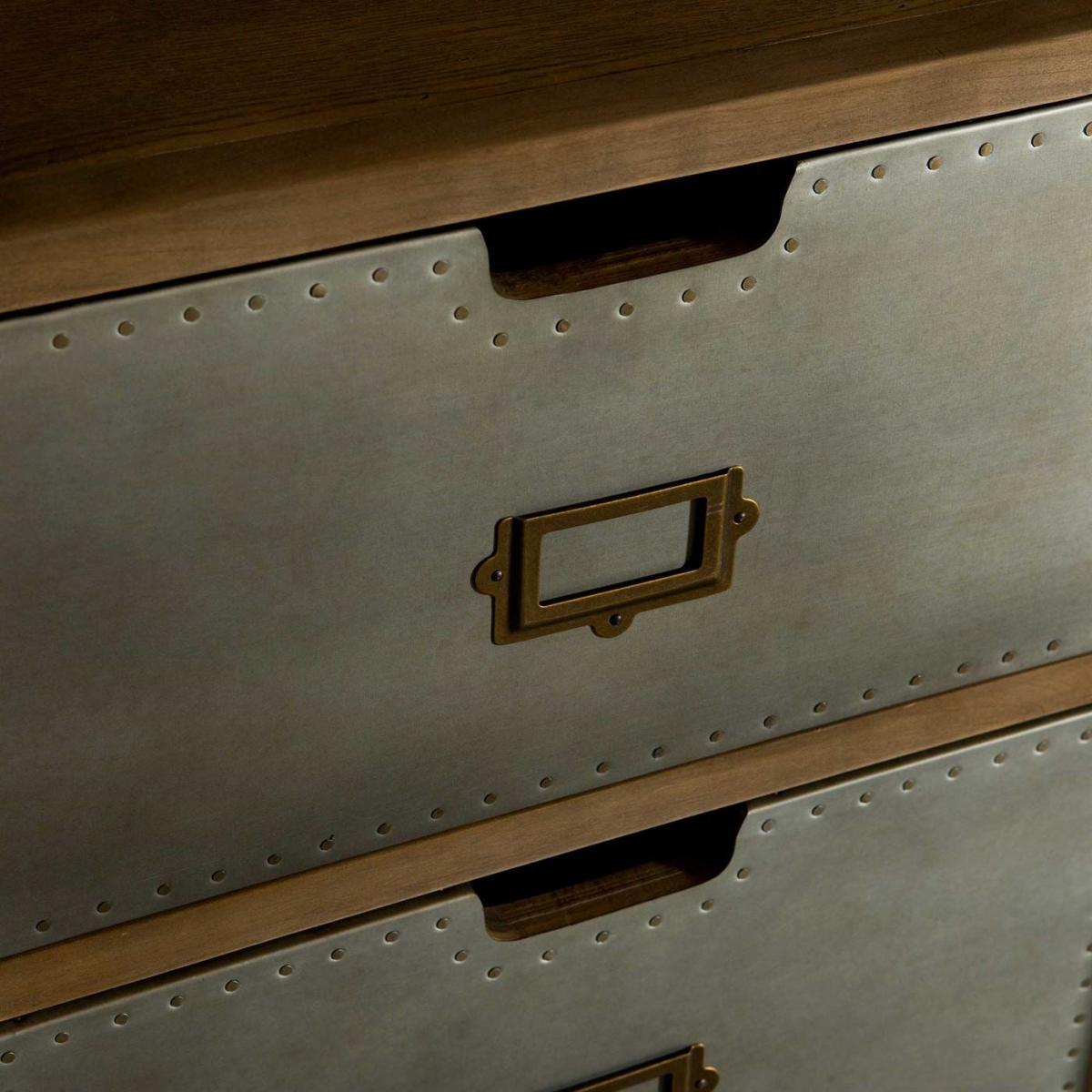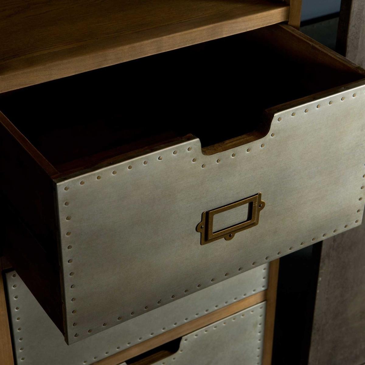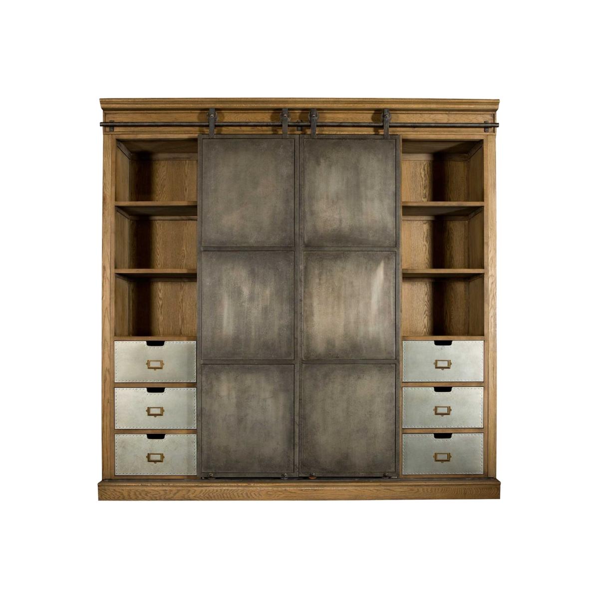 Design. This grand cabinet with its rustic industrial charm boasts plenty of storage with a combination of large and small shelves and practical drawers. Sure to create an instant focal point within your living space, its gorgeous oak carcass provides a lovely vintage feel while its metal accents make this great for modern and urban living. Its feature metal panels sit on a runner allowing you to display or hide sections of your choosing, ideal for hiding away clutter and beautifully displaying your most loved items.