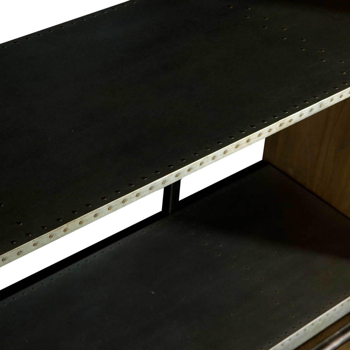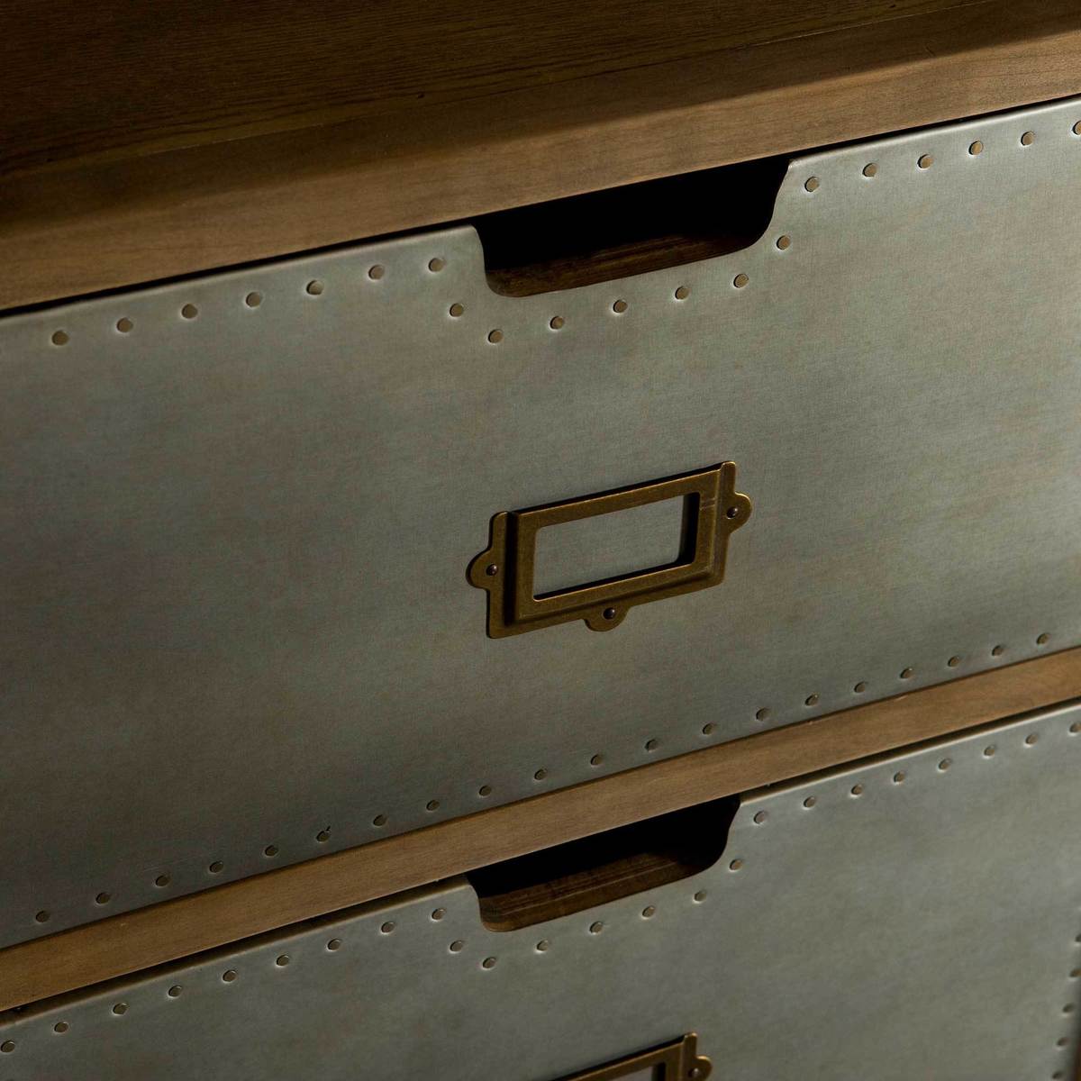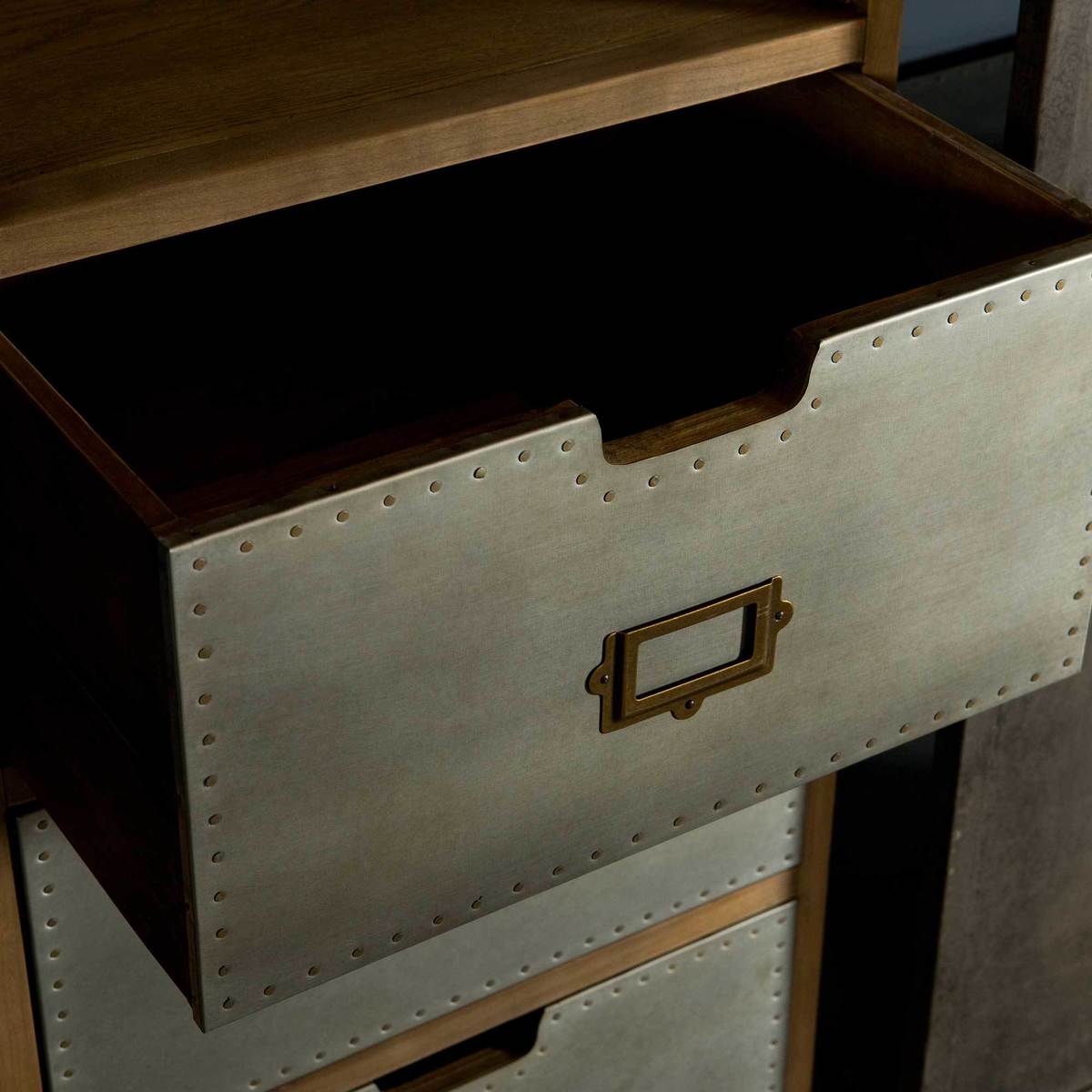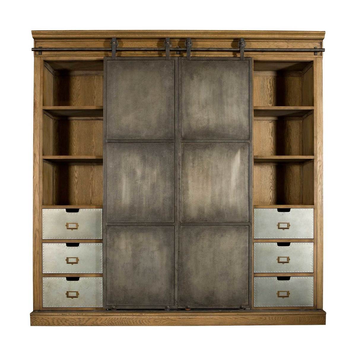 This grand cabinet with its rustic industrial charm boasts plenty of storage with a combination of large and small shelves and practical drawers.;Sure to create an instant focal point within your living space, its gorgeous oak carcass provides a lovely vintage feel while its metal accents make this great for modern and urban living.;Its feature metal panels sit on a runner allowing you to display or hide sections of your choosing, ideal for hiding away clutter and beautifully displaying your most loved items.