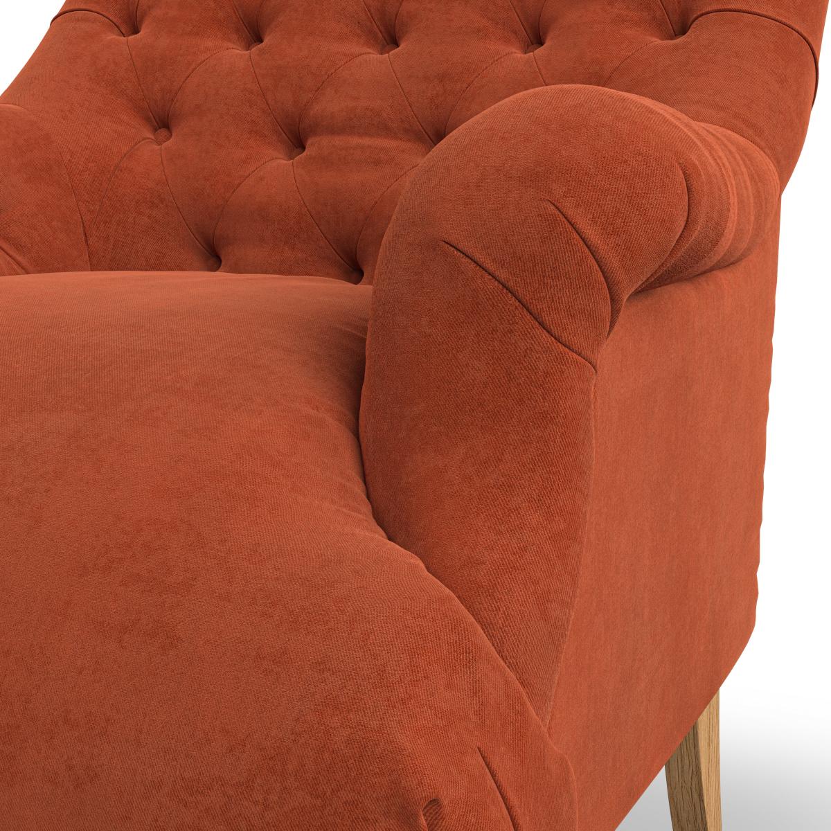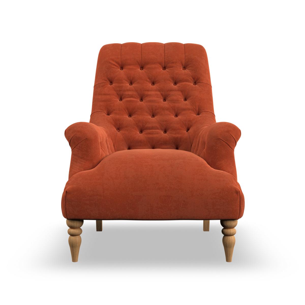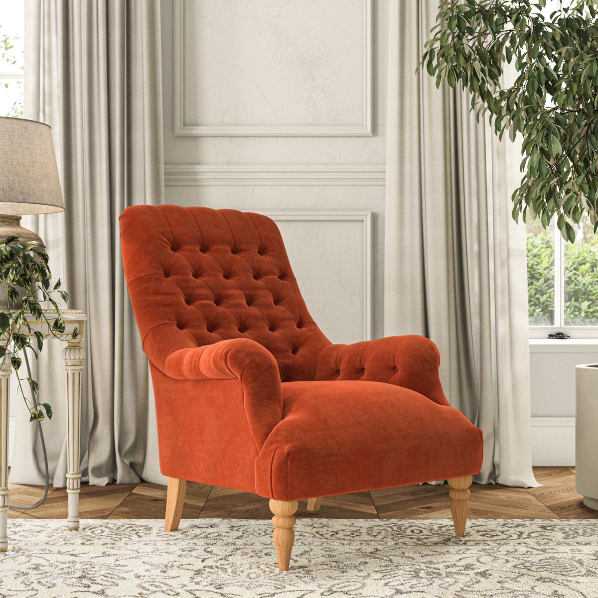 I’m a fan of the Bibury chair for its deep tufting and warm, burnt-orange velvet - it instantly lifts a corner without feeling overly formal. The turned timber legs give it a nod to classic English styling, while the softly rolled arms keep it approachable and snug. It works equally well in a modern-eclectic living room, a cosy reading nook or even a neutral- toned bedroom. Try pairing it with a light jute rug and a slim metal side table to balance the weight of the chair, then add a soft linen cushion or woollen throw in muted greens or greys. A tall leafy plant or sculptural floor lamp alongside will complete the look without overcrowding the space.