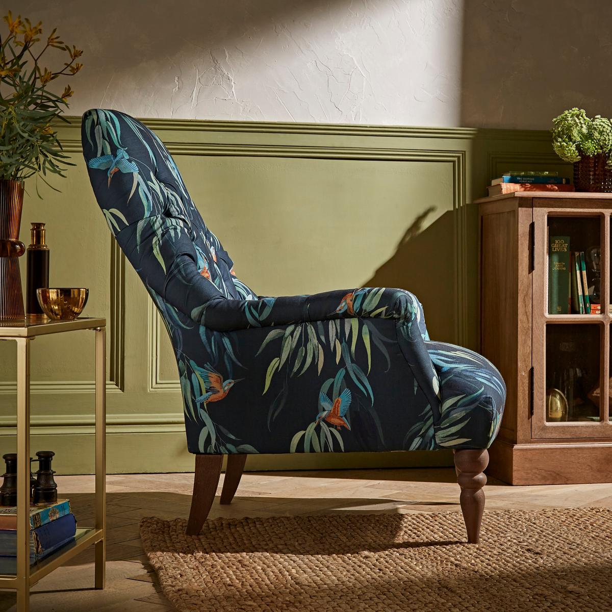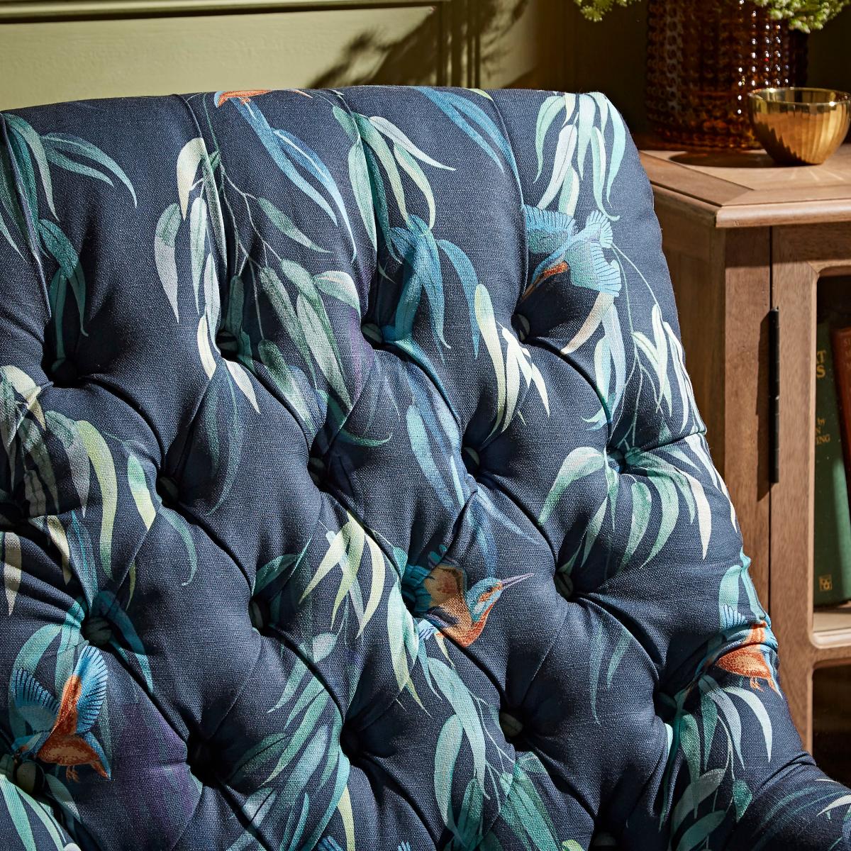 In collaboration with the Natural History Museum Our Bibury Button Back Chair is finished in a stunning Kingfisher Print, inspired by the wetland habitats and the animals that thrive in these complex ecosystems. The classic tufted, buttoned back detail and turned wooden legs of the chair adds a touch of elegance and looks great in any home. This armchair can be purchased with a matching footstool for even greater comfort. Natural History Museum x Dunelm The Bibury Button Back Chair is part of the Wetlands collection. Wetland habitats are vitally important in supporting an abundance of plants and animals that thrive in these unique and complex ecosystems. With this collection we’re shining a light on some of the wonderful species that you can find in the UK’s wetland areas and highlighting the need to protect these incredible yet vulnerable habitats. © The Trustees of the Natural History Museum, London 2023. All Rights Reserved.