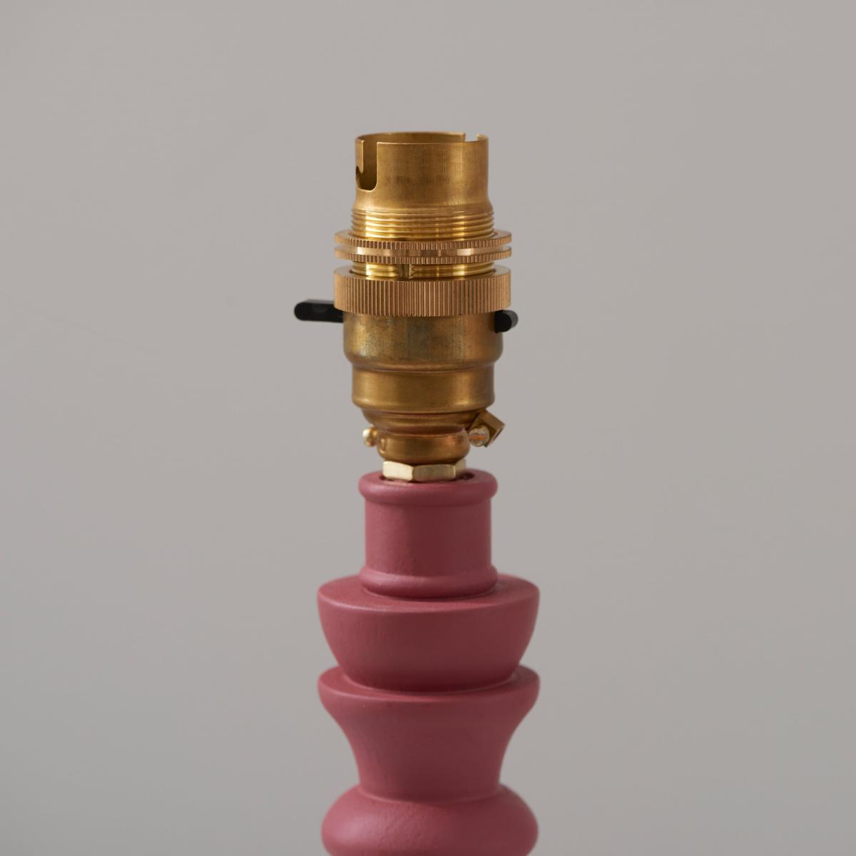 Beautiful wooden turned spindle light, painted satin pink clay. Perfect for classic interiors, featuring a brass B22 switched lamp holder and grey braided fabric flex. Pair with one of our 16cm or 20cm decorative fabric shades for a unique classic look.
