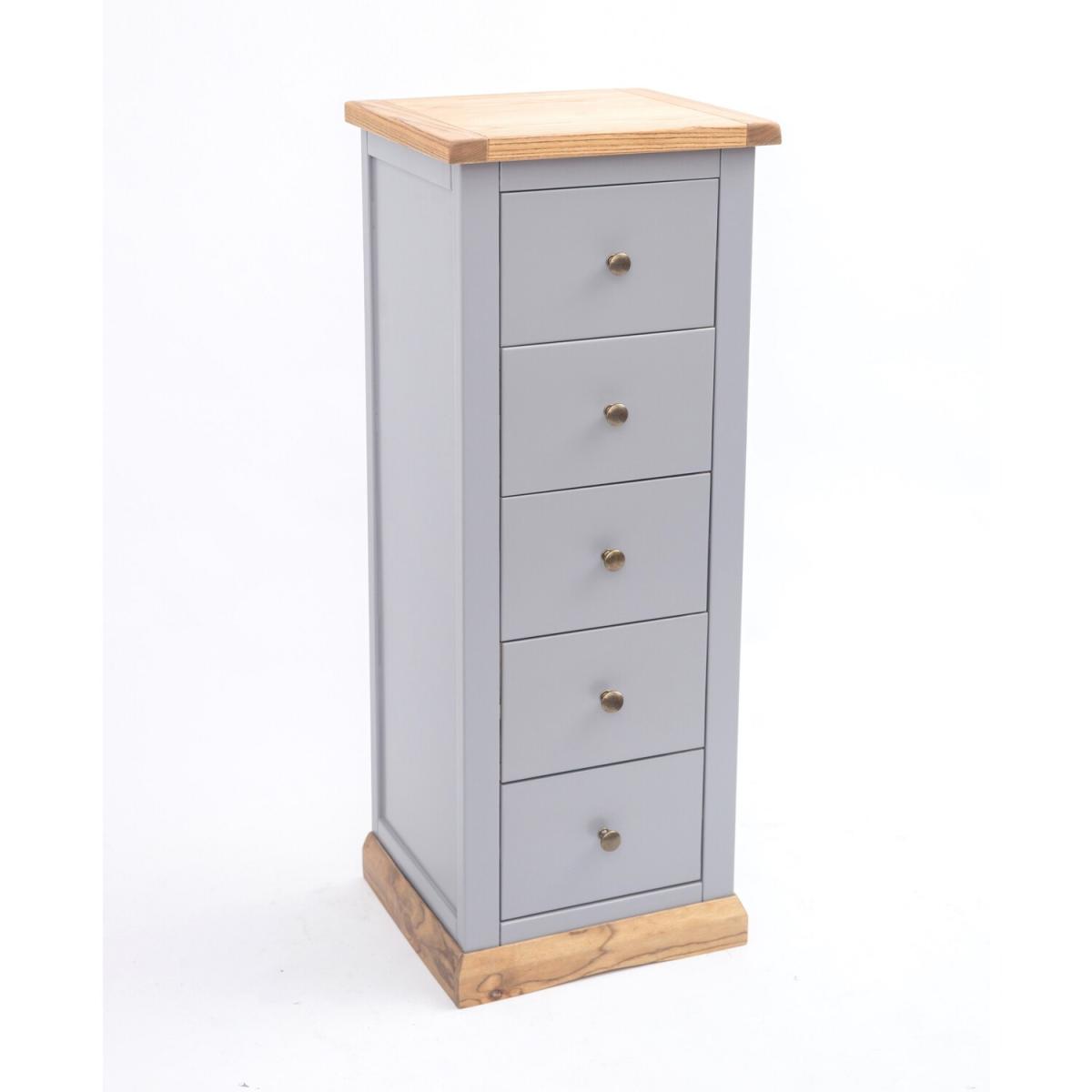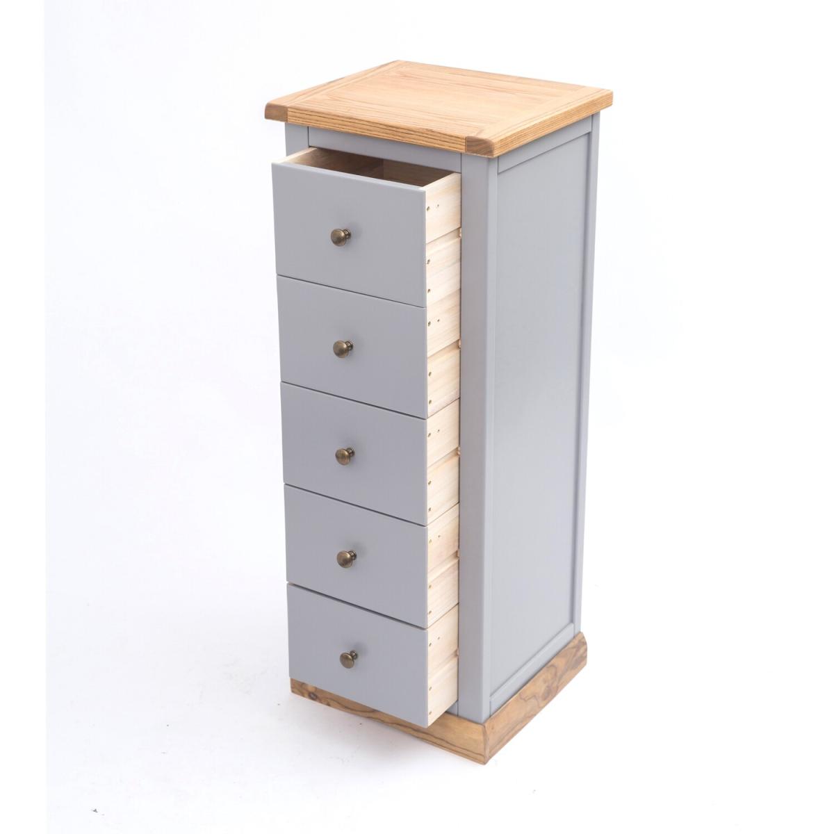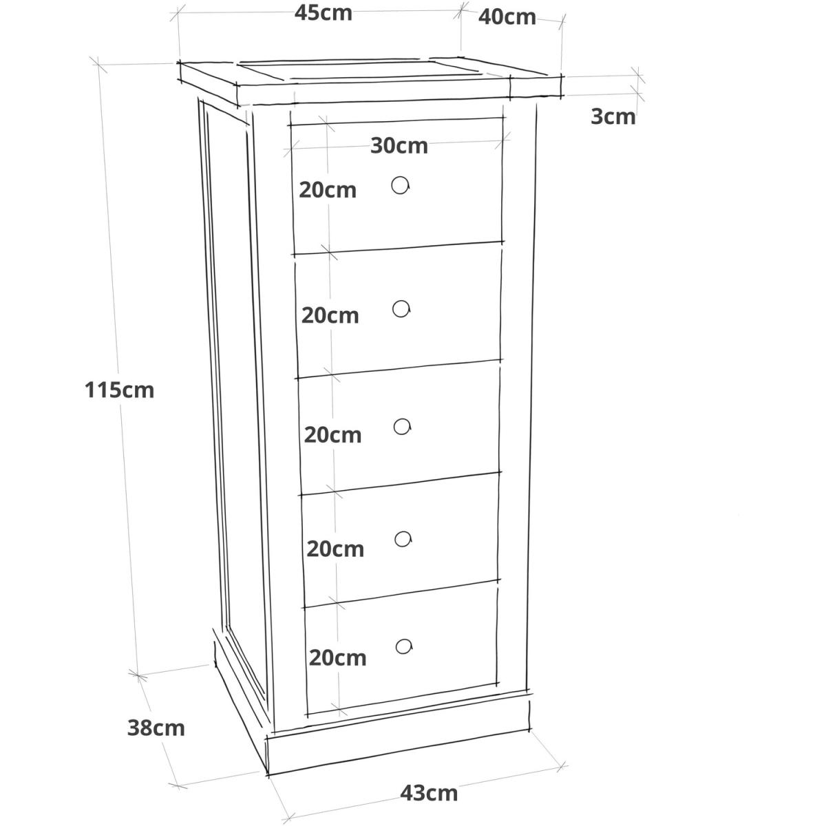Our Biccari collection has a simple but pleasing design and is produced by our skilled craftsmen to the highest standards using responsibly sourced solid wood and veneers. All items are made using a combination of solid hardwood and veneers. The body is carefully hand-finished with an eco-friendly water-base grey lacquer, while the top is hand waxed. This combination gives the product a perfect country look. This is the ideal chest where you have a small space available perhaps in an alcove or behind a door, but requires storage space. The 5 equal size drawers give you plenty of capacity for a very small footprint. The drawers are ideal for underwear, socks, folded clothes and accessories. The top has a 3cm thick solid wood frame, making it extremely sturdy. Added to these features is a simple construction for easy home assembly, making it a great value product to be taken home today.