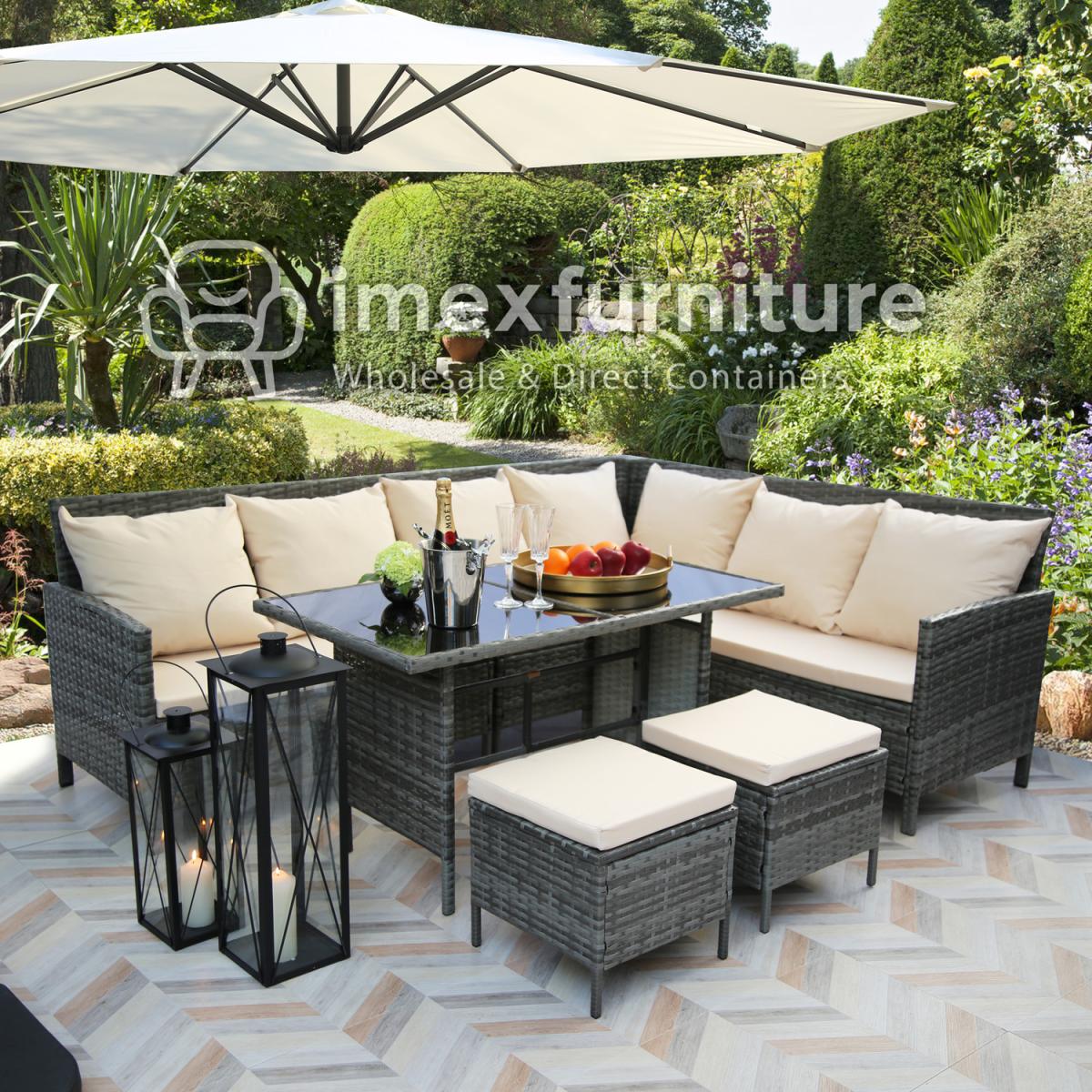 Featuring a large rectangular dining table that can fit up to eight people, this set is perfect for entertaining family and friends, as well as enjoying casual dining. The corner sofa style seats and footstools allow you to use your outdoor living space.