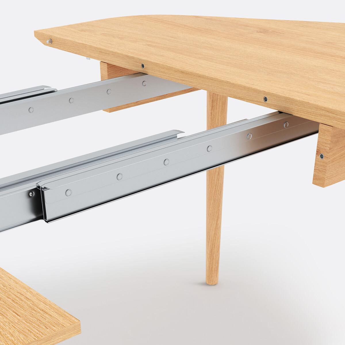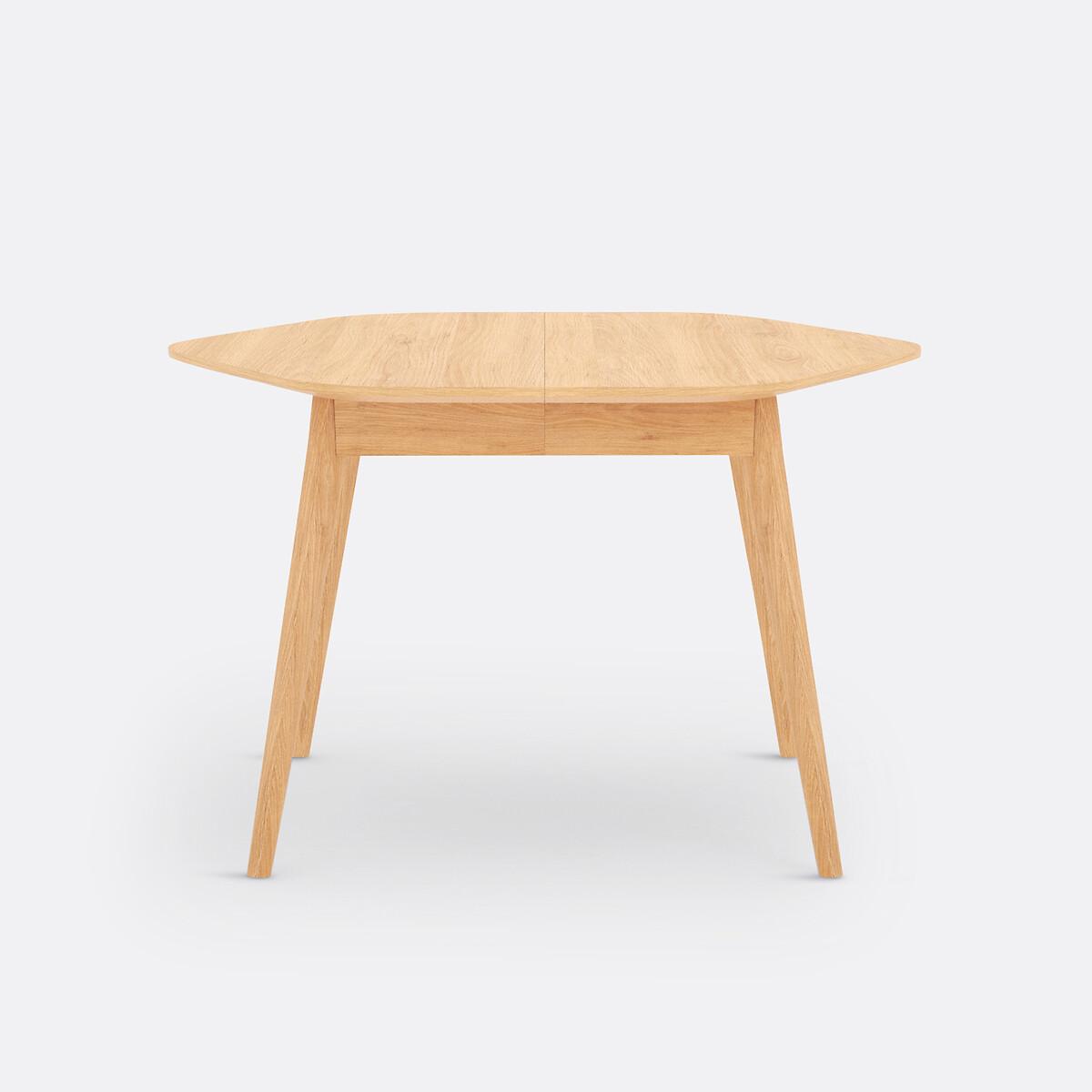 The Biface extendable dining table can be extended from 4 to 10 place settings. We love its very original hexagonal shape and vintage-style tapered legs. Product Details • Hexagonal shape, with 2 extensions, great depth: 110cm. • Top and extensions in oak veneered MDF, polyurethane varnish finish. • Double bevel top edge. • Feet in solid oak with polyurethane varnish. • 2 extensions, extension slides on metal rail. • Dimensions. Extension L60 x H12 x D110cm. • Closed version, 4-6 seater. • 1 extension = 8 places. • 2 extensions = 10 places. • Felt pads. • Made in Europe. • The table can extend to seat 4-10 people. Dimensions • Width 120/180/240 cm. • Depth 110 cm • H75cmDelivery:. This product is sold for self-assembly. It will be delivered to your door. Note! Please check that all access points are large enough to accommodate your delivery (doors, stairs, lifts). • Made in Europe. • WOOD FROM SUSTAINABLY MANAGED FORESTS. FSC® certified wood comes from forests that are environmentally, socially and economically well managed. Dimensions and weight of parcel:2 parcels : • L122 x H13.5 x D71cm, 40kg • L94.5 x H9.5 x D35cm, 21kg