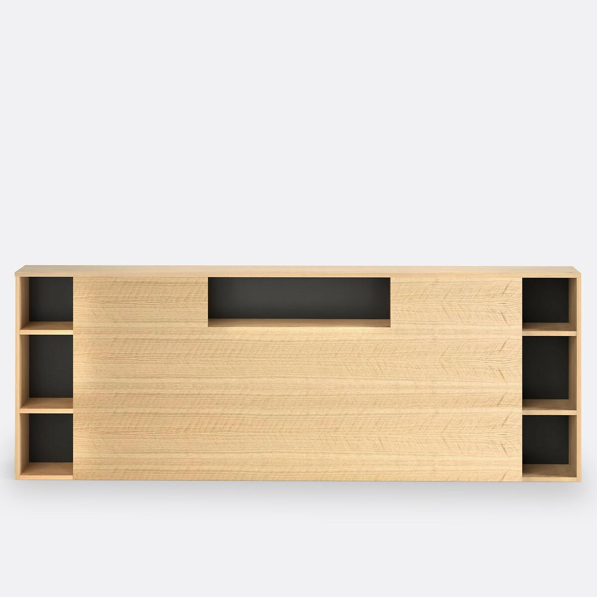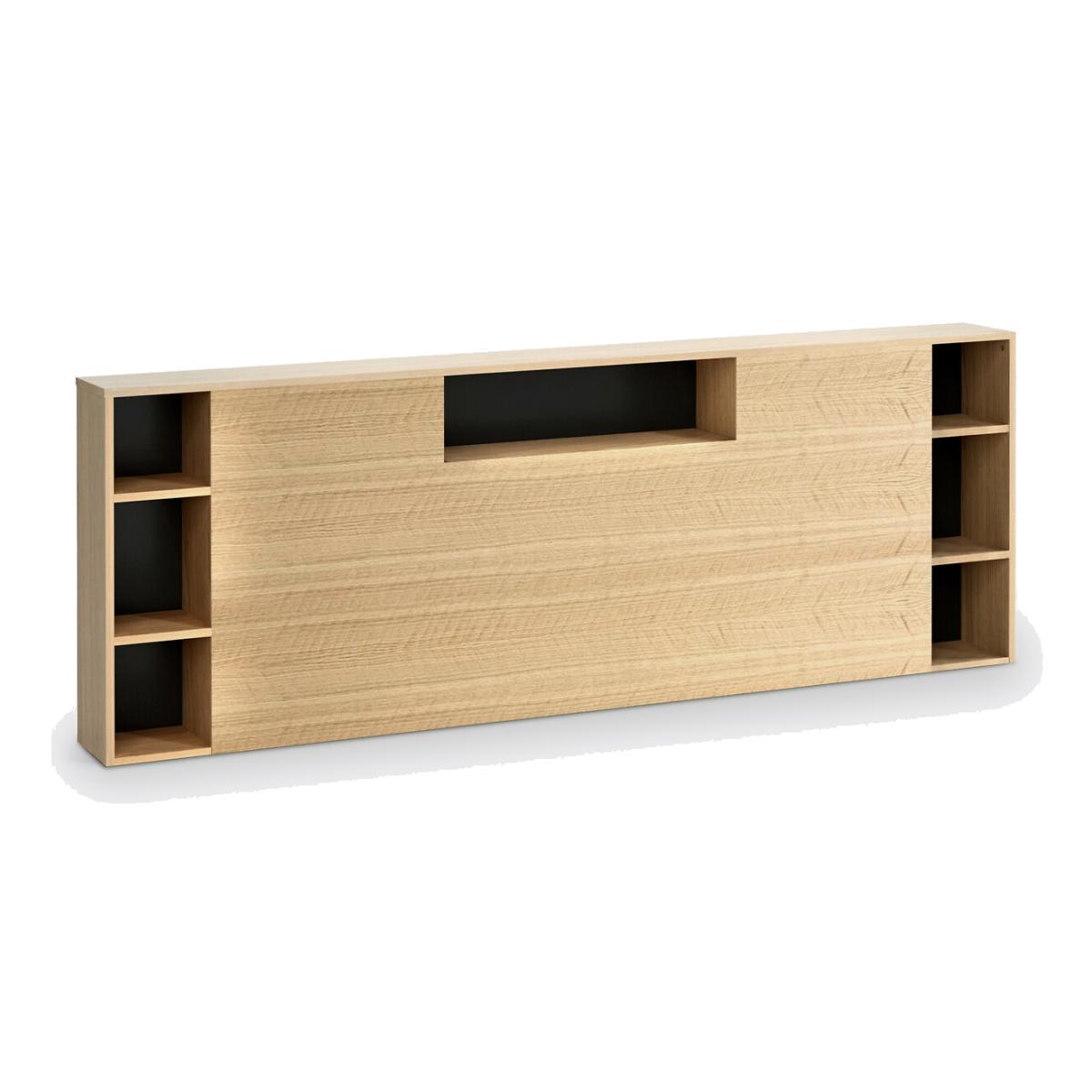 Biface storage headboard. Create a calm, uncluttered space to sleep in with this clever Biface storage headboard. Packed with built-in storage niches, this sleek, modern headboard keeps all your bedtime essentials close at hand but out of sight. Made in Europe. Product Details • 3 compartments on each side • 1 large central compartment • Wall fixing recommended • Oak veneered MDF, FSC® certified, polyurethane varnish finish • Black lacquered compartment interiorsDimensions. Overall • Width: 220cm • Height: 80.9cm • Depth: 22cm • Weight:55.5kgInterior Central compartment: L70.7 x H18.1 x D19cm. Small side compartments : • L21 x H20 x D21cm • L21 x H28 x D21cm • L21 x H25 x D21cmDelivery:. Requires self-assembly. Available for home delivery. Note! Please check that access points (doorways, stairways, lifts) are wide enough to accommodate your delivery. • Made in Europe. • WOOD FROM SUSTAINABLY MANAGED FORESTS. FSC® certified wood comes from forests that are environmentally, socially and economically well managed. Dimensions and weight of parcel:2 parcels • L186 x H55 x D85cm - 37.5kg • L232 x H95 x D28cm - 23kg
