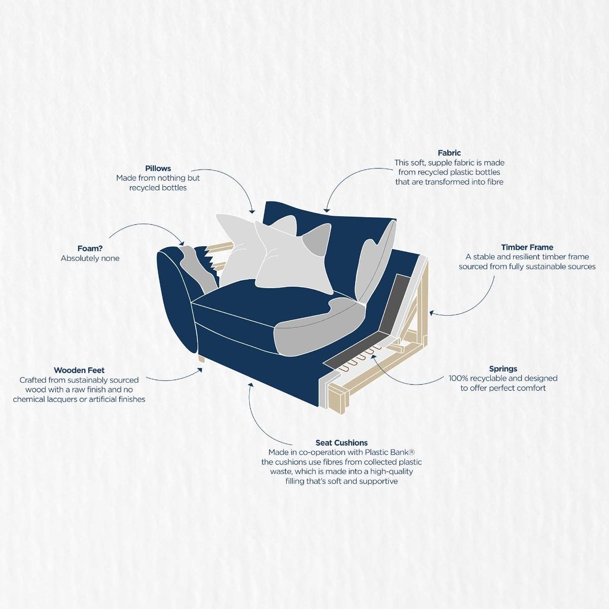 Design. Designed with the environment in mind, our Big Blue Chair offers great comfort without the guilty conscience. From its fabric to its fillings to its frame, every inch of this eco-friendly chair can be recycled, which means you needn’t choose between sustainability and style. The armchair’s good looks do a great job of disguising its green credentials, so you’ll have endless fun revealing its origins to flabbergasted guests. Choose from a range of surprisingly soft upholstery options in natural tones, from rich blues to gentle greys. Read more about our eco-friendly. Big Blue range. Please note: Scatter reverse comes in chosen body fabric.