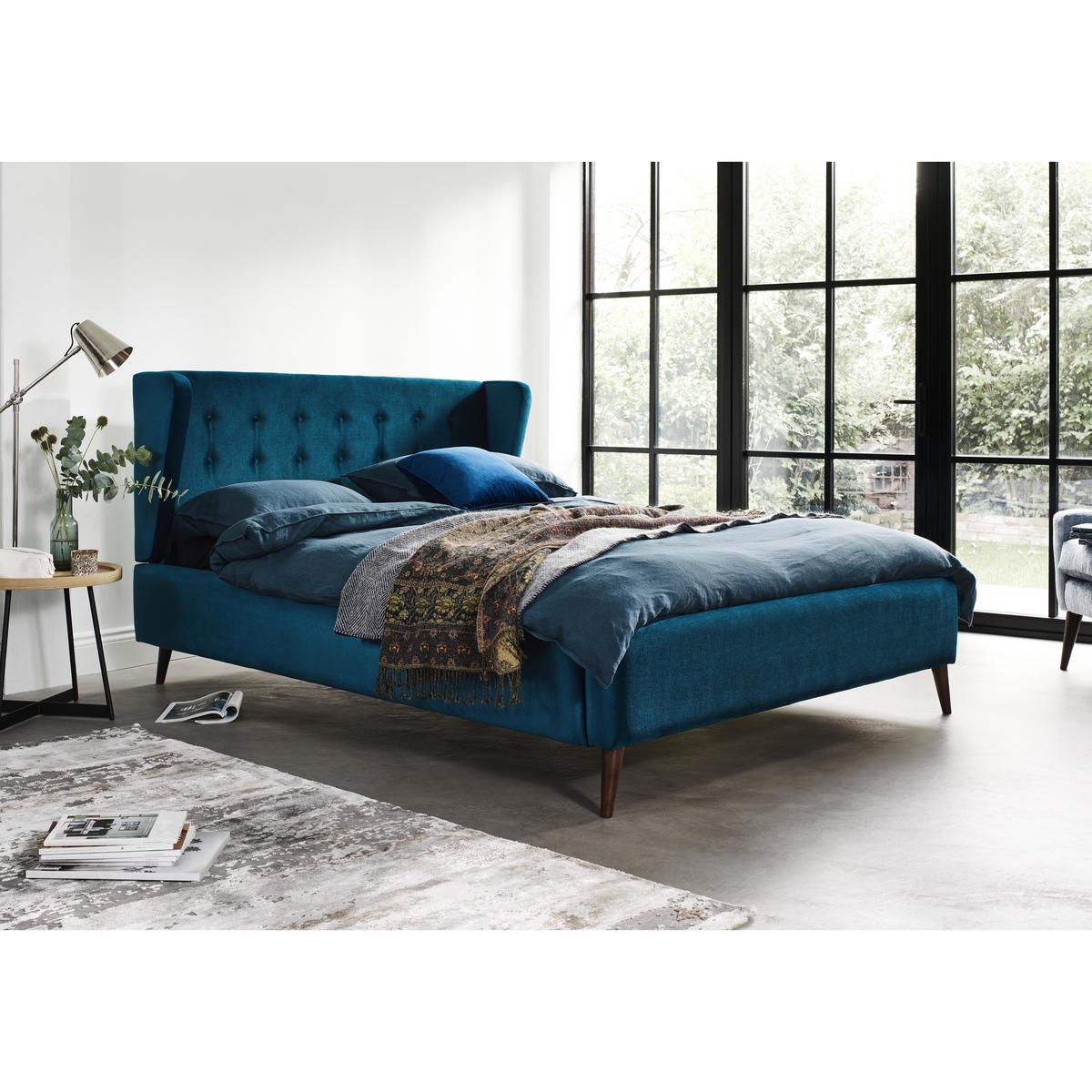 Mid-century upholstered bedroom furniture. Fabulous on trend winged and buttoned headboard. Huge choice of fabric styles and colours. Fabulous bedroom style is yours with the rather retro and altogether fabulous Bilbao bed frame. Beautifully handcrafted to order in Britain, this on trend upholstered bed frame showcases a tall headboard with mid-century modern angular winged sides and two rows of understated buttoning. The headboard is neatly upholstered on both sides, a sign of true craftsmanship. The bed frame itself has higher than normal sides, designed to stylishly surround any standard type of mattress, and is set on tapered legs. Choose from a huge range of smooth, plush and textured fabrics in a glorious selection of colours. As well as being gorgeous to look at it, this bed frame is a fabulous foundation for a great night’s sleep thanks to its sturdy construction. Underpinned by a strong steel frame, it has beech slats which are pre-assembled for your convenience. Available in double, king and super king bed sizes, the Bilbao bed frame is part of the Bilbao range of bedroom furniture. A Furniture Village exclusive. Please note: As Bilbao bedroom furniture is handmade, it is to be expected that measurements may be up to 3 cm less or more than the stated dimensions. Mattress shown is not included.